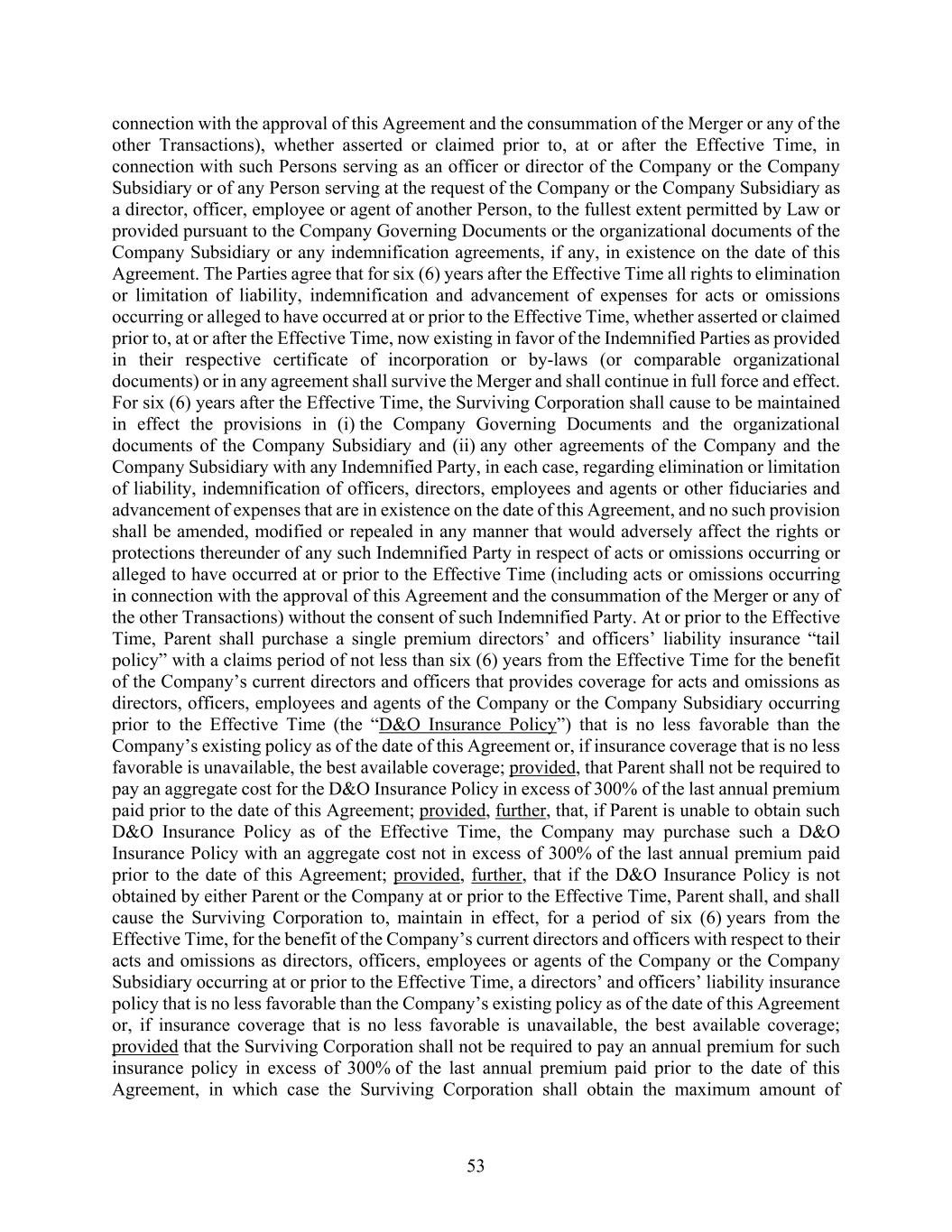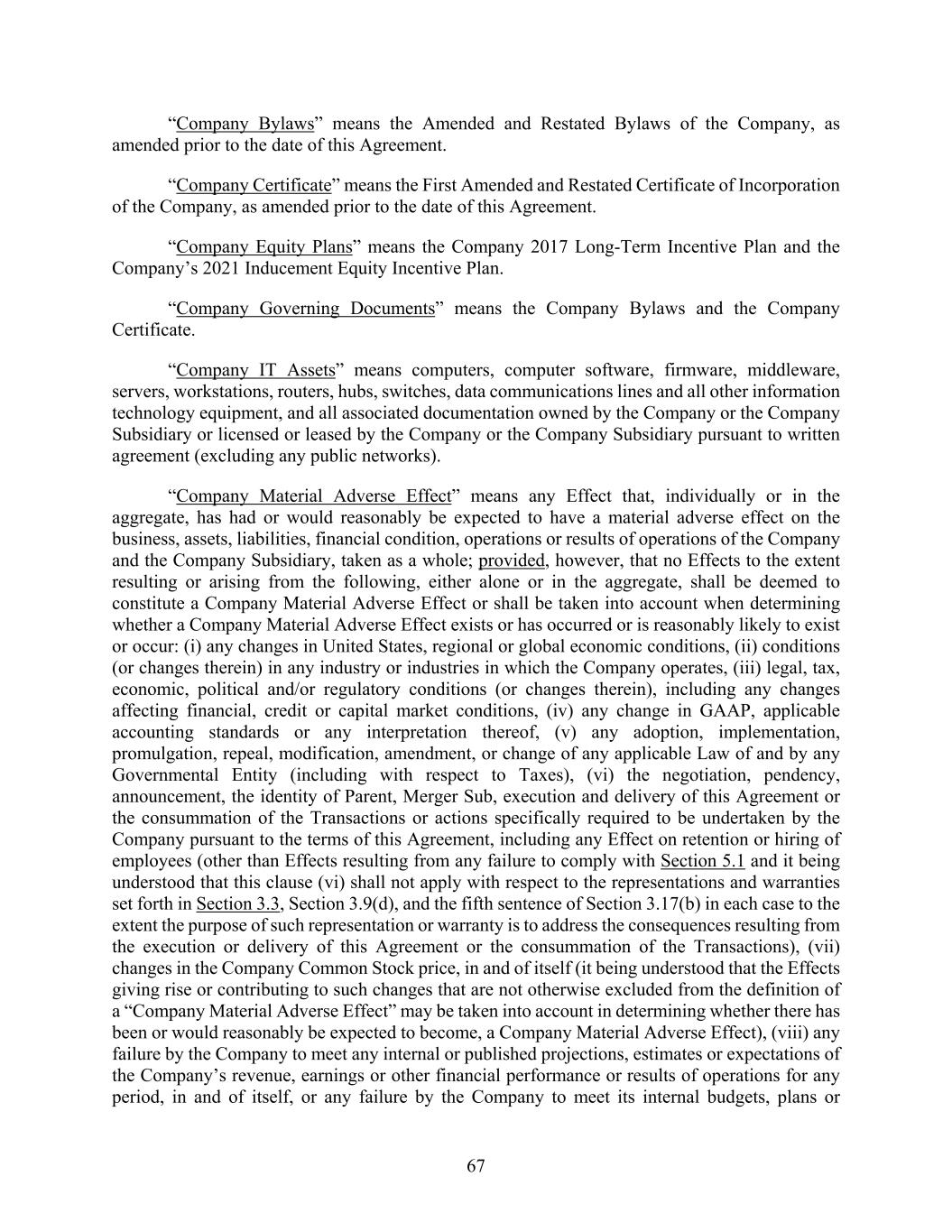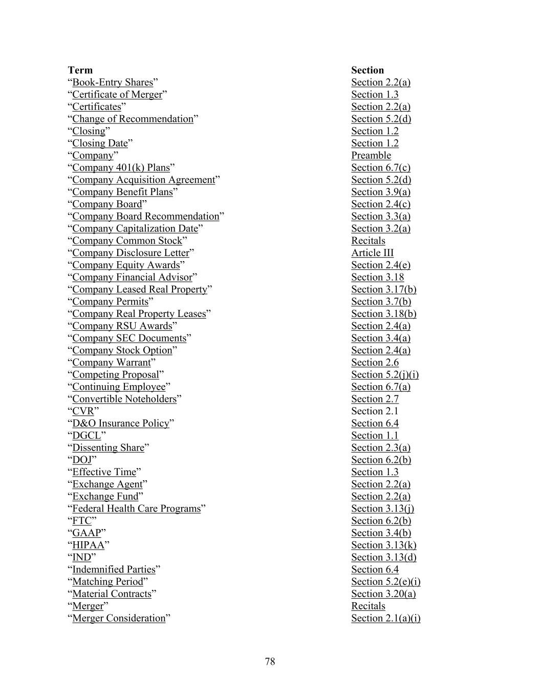 TABLE OF CONTENTS Page ARTICLE I. THE MERGER ......................................................................................................... 1 The Merger ........................................................................................... 1 Closing ................................................................................................. 2 Effective Time ..................................................................................... 2 Governing Documents ......................................................................... 2 Officers and Directors of the Surviving Corporation .......................... 2 ARTICLE II. TREATMENT OF SECURITIES ........................................................................... 3 Effect on Capital Stock ........................................................................ 3 Payment for Securities; Surrender of Certificates ............................... 4 Appraisal Rights. .................................................................................. 6 Treatment of Company Options and Company Equity Awards. ......... 6 Withholding ......................................................................................... 8 Treatment of Company Warrants ......................................................... 9 Notice to Convertible Noteholders ...................................................... 9 ARTICLE III. REPRESENTATIONS AND WARRANTIES OF THE COMPANY .................. 9 Qualification, Organization, Subsidiaries, etc ..................................... 9 Capitalization. .................................................................................... 10 Corporate Authority Relative to this Agreement; No Violation ........ 12 Reports and Financial Statements ...................................................... 13 Internal Controls and Procedures ....................................................... 14 No Undisclosed Liabilities ................................................................. 15 Compliance with Laws; Permits ........................................................ 15 Environmental Laws and Regulations ............................................... 15 Employee Benefit Plans ..................................................................... 16 Absence of Certain Changes or Events .............................................. 17 Investigations; Litigation ................................................................... 18 Information Supplied ......................................................................... 18 Regulatory Matters............................................................................. 18 Privacy and Data Security .................................................................. 20 Tax Matters ........................................................................................ 21 Labor Matters ..................................................................................... 24 Intellectual Property ........................................................................... 24 Property .............................................................................................. 27 Opinion of Financial Advisor ............................................................ 27 Required Vote; State Takeover Statutes ............................................ 28 Material Contracts .............................................................................. 28 Insurance ............................................................................................ 31 Finders and Brokers ........................................................................... 31 Anti-Corruption; Sanctions ................................................................ 32 Affiliate Transactions ......................................................................... 32