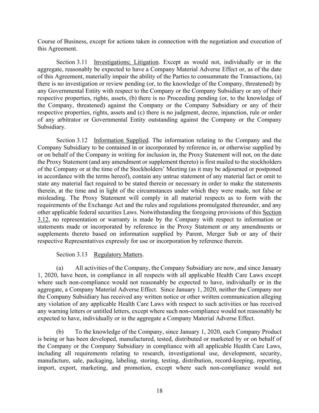 (f)Absence of Litigation. With respect to such Stockholder, as of the date hereof, there is no action, suit, inquiry, investigation, proceeding or civil investigation, pending or, to the knowledge of such Stockholder, threatened against or affecting such Stockholder or such Stockholder’s Subject Shares that could reasonably be expected to impair the ability of such Stockholder to perform his, her or its obligations hereunder or to consummate the transactions contemplated hereby on a timely basis.