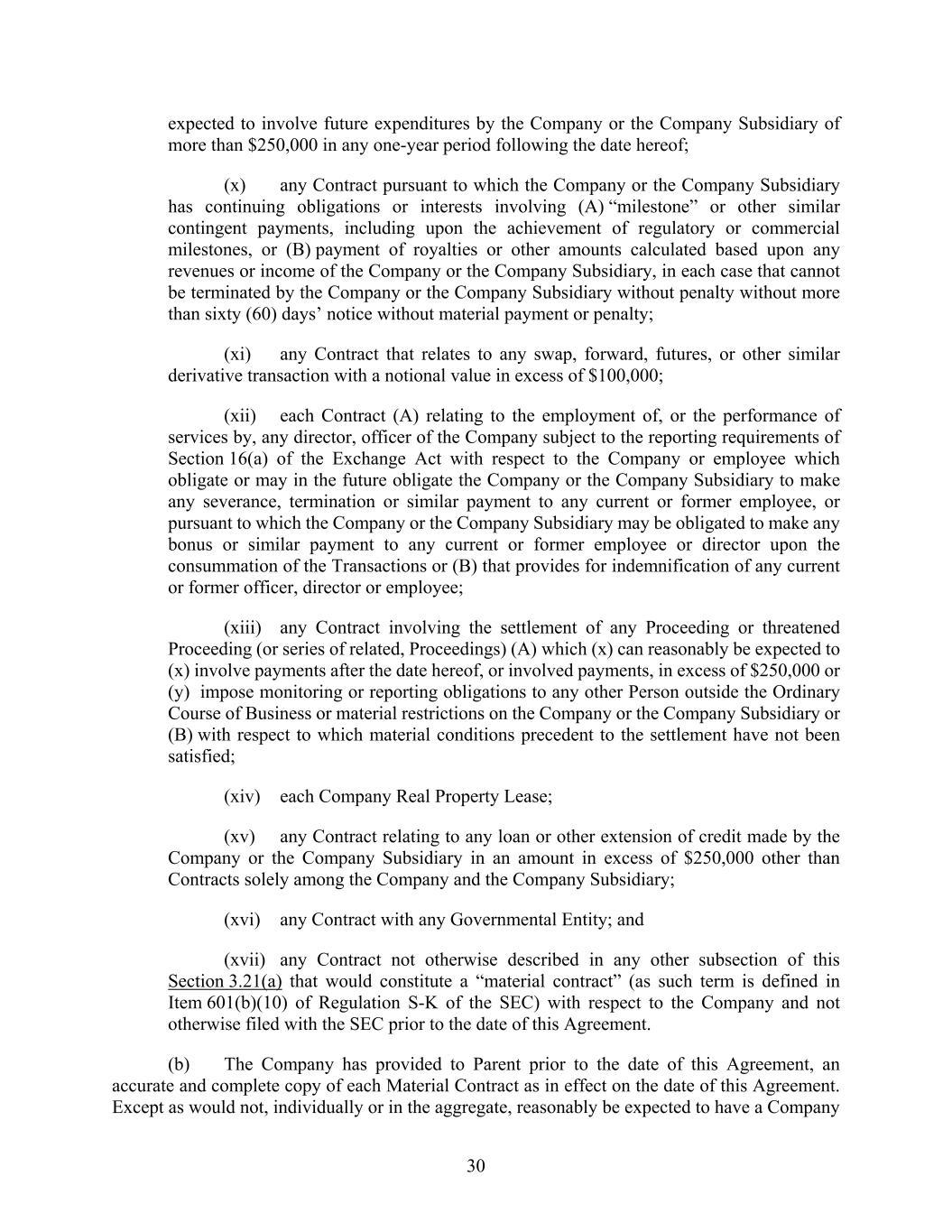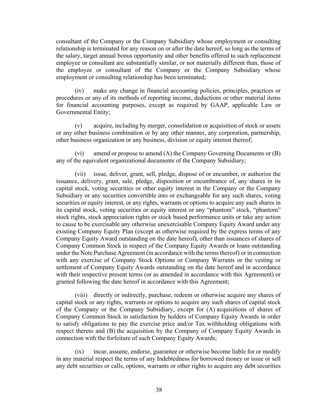 In addition, pursuant to the terms of the Merger Agreement, from and after the Effective Time, each outstanding and unexercised warrant to purchase shares of Company Common Stock (a “Company Warrant”), by virtue of the Merger and without any action on the part of Parent, will no longer be exercisable by the former holder thereof, shall be cancelled and shall only entitle such holder to receive (a) a cash payment equal to (i) the excess, if any, of (A) the Upfront Consideration over (B) the exercise price payable per share of Company Common Stock under such Company Warrant, multiplied by (ii) the number of shares of Company Common Stock such holder could have purchased (assuming full vesting of all warrants) had such holder exercised such Company Warrant in full immediately prior to the Effective Time, and (b) a CVR with respect to each share of Company Common Stock subject to such Company Warrant immediately prior to the Effective Time.