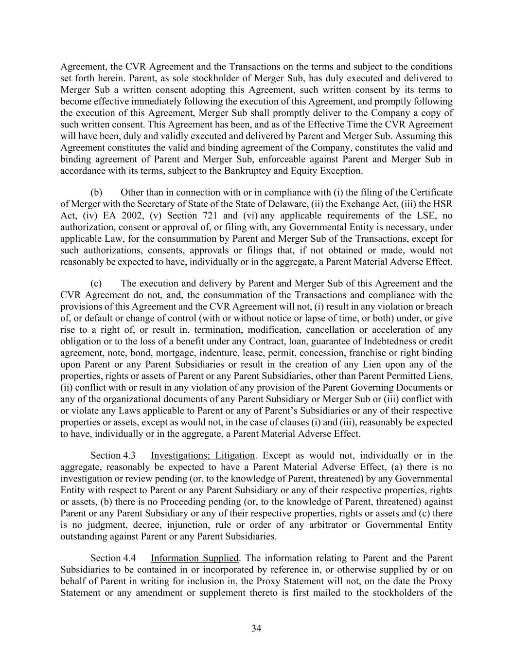 which to be made or obtained has not had, and would not reasonably be expected to have, individually or in the agregate, a material adverse effect on the ability of Parent to perform its obligations under this Agreement, no consents or approvals of, or filings, declarations or registrations with, any Governmental Entity or any other Person are necessary for the execution and delivery of this Agreement by Parent and the consummation by Parent of the transactions contemplated hereby.