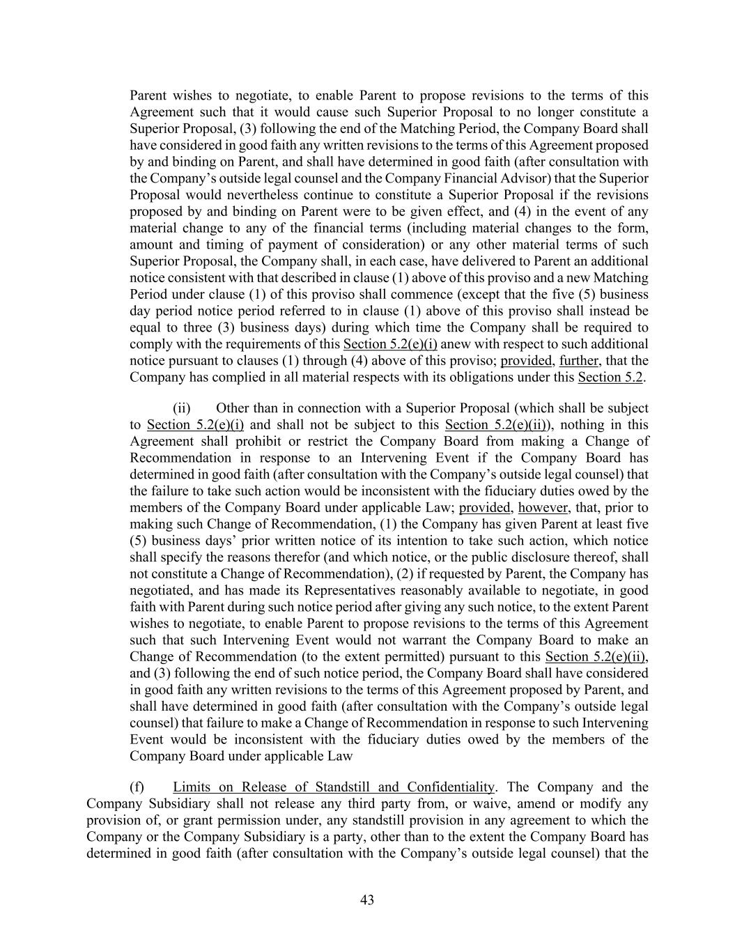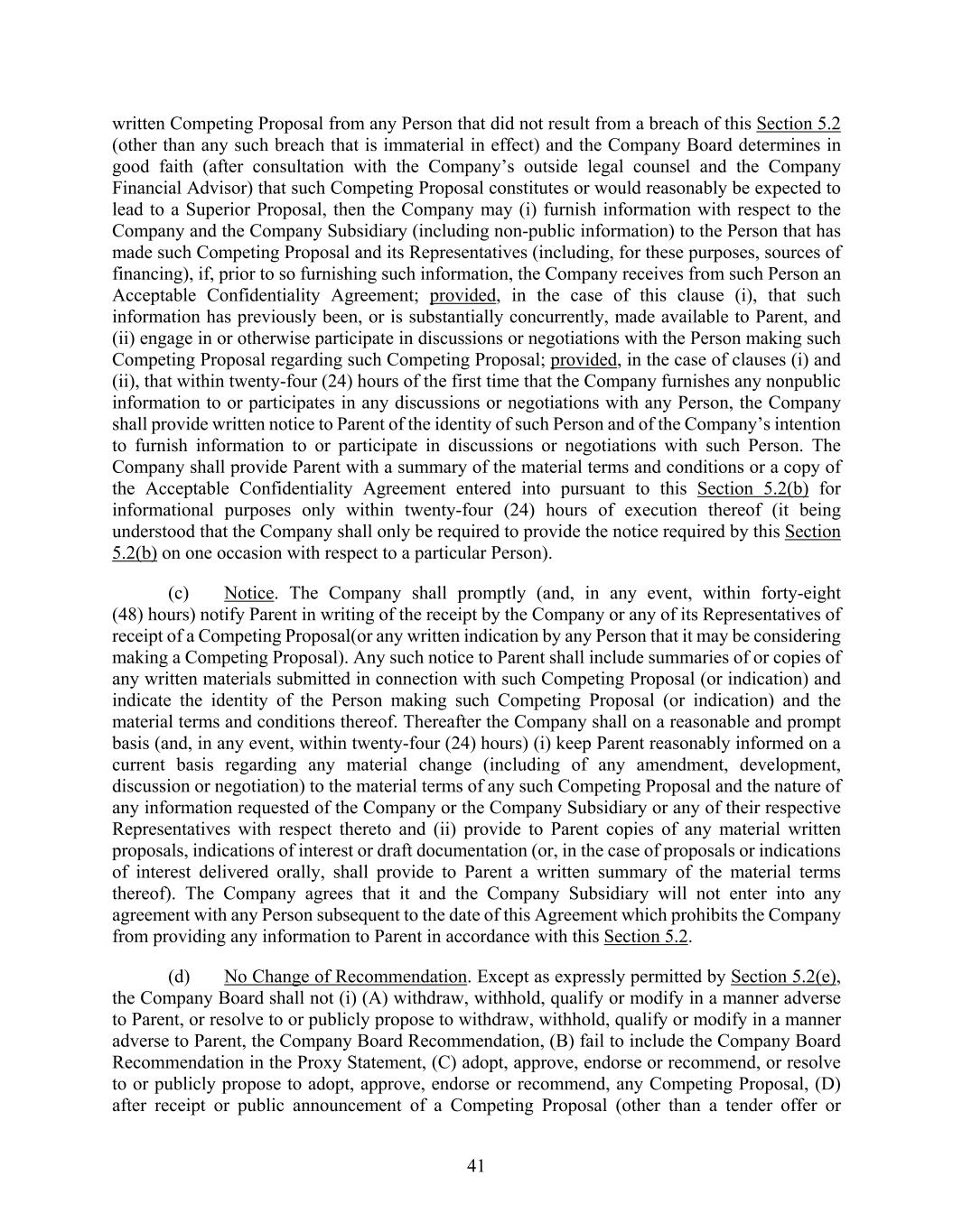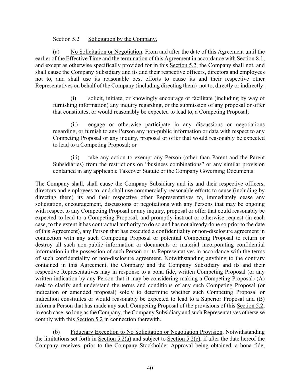 3.1No Solicitation. Without limiting and subject to the provisions of Section 4.15 hereof, during the Agreement Period, each Stockholder (solely in his, her or its capacity as a stockholder of the Company) agrees that it will not, directly or indirectly, take any action or omit to take any action that the Company is not permitted to take or omit to take pursuant to Section 5.2 of the Merger Agreement.