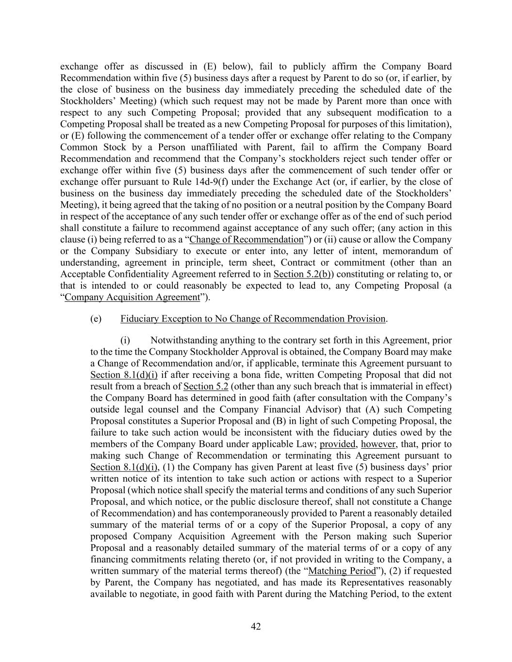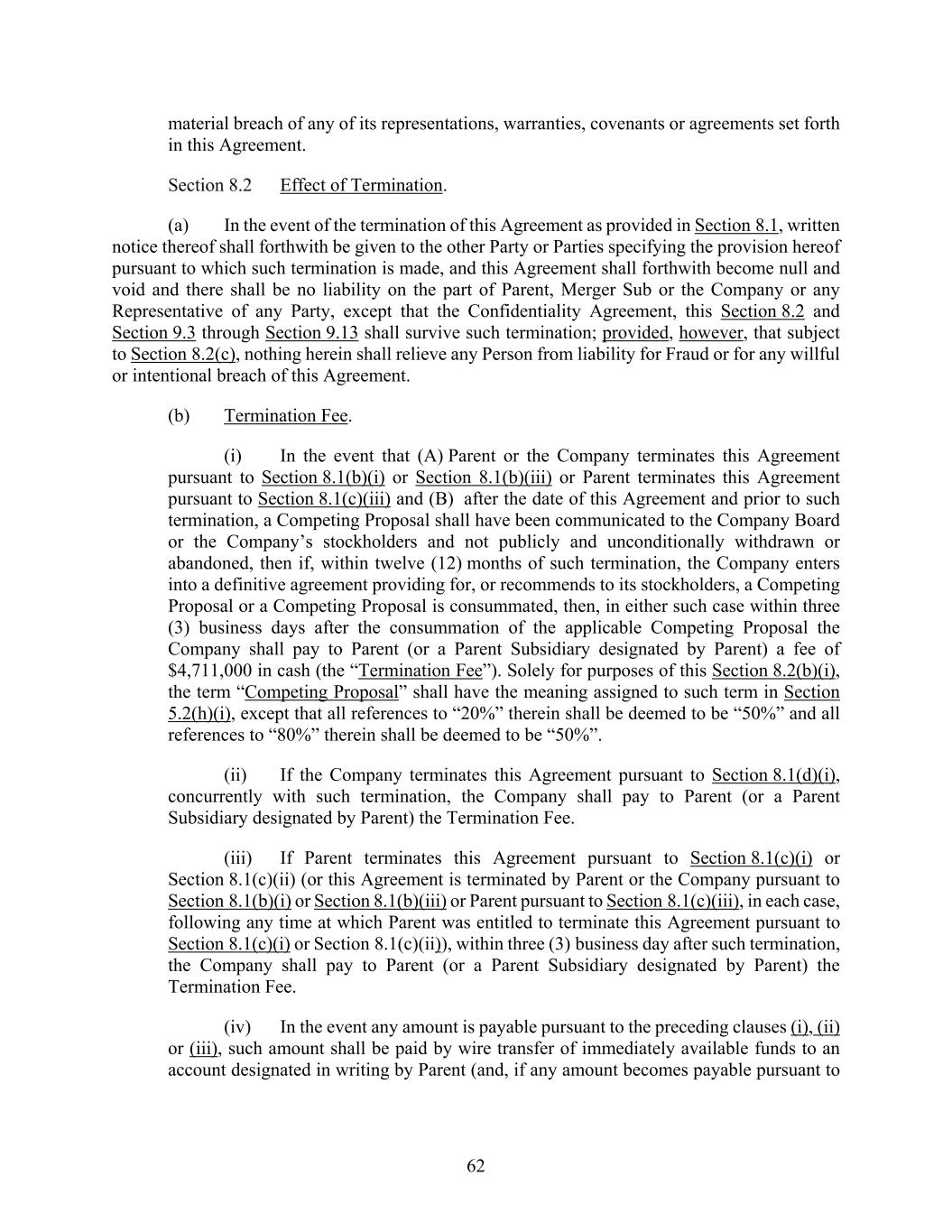 4.3Termination. This Agreement shall automatically terminate and become void and of no further force or effect on the earlier of (a) the Effective Time, (b) with respect to each Stockholder, the termination of this Agreement by written notice from such Stockholder to Parent following the amendment, modification or waiver of the terms of the Merger Agreement (i) to reduce or change the form of the consideration to be paid to such Stockholder in connection with the Merger, (ii) to create any additional conditions to the consummation of the Merger or (iii) that would reasonably be expected to adversely affect the Stockholder in any but a de minimis respect, (c) the termination of this Agreement by written notice from Parent to the Stockholders, and (d) the valid termination of the Merger Agreement in accordance with its terms (the period from the date hereof through such time being referred to as the “Agreement Period”); provided that (x) Section 4.1, Section 4.2, this Section 4.3, Section 4.5, Section 4.9, Section 4.10, Section 4.15 and Section 4.16 shall survive such termination, and (y) the termination of this Agreement shall not relieve any party from liability arising from Fraud or any willful and intentional breach prior to such termination. For clarity, this Agreement shall not terminate upon a Change of Recommendation unless the Merger Agreement is terminated.