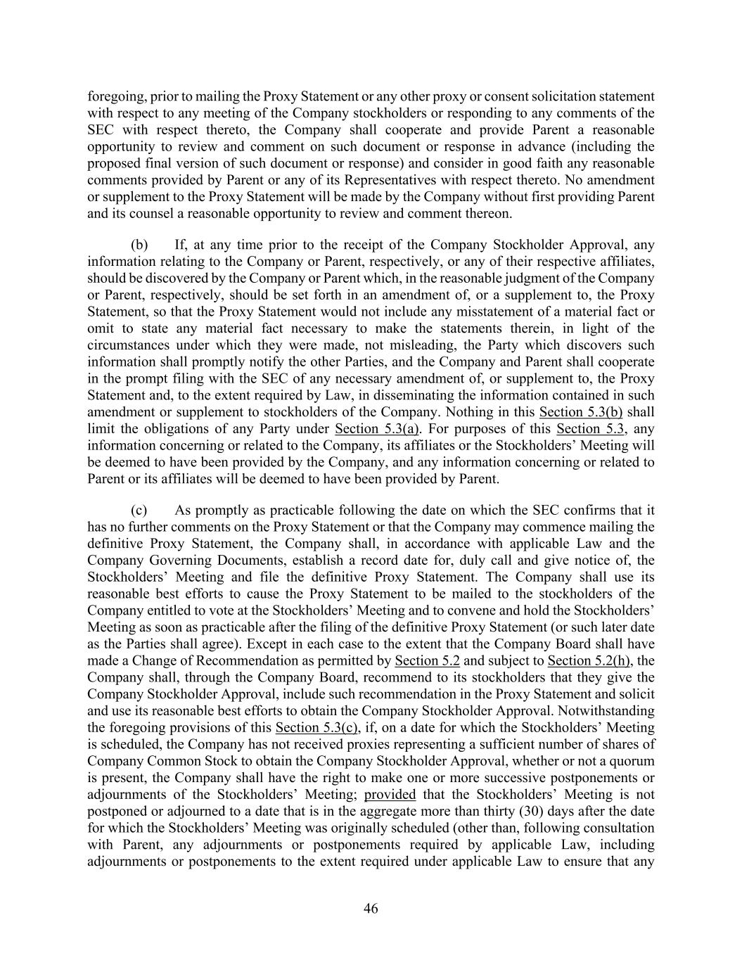 (c)Documentation and Information. Each Stockholder (a) consents to and authorizes the publication and disclosure by Parent of such Stockholder’s identity and holding of Subject Shares, the nature of such Stockholder’s commitments, arrangements and understandings under this Agreement (including, for clarity, the disclosure of this Agreement) and any other information, in each case, that Parent reasonably determines is required to be disclosed by applicable Law in any press release, any schedules and documents filed with the SEC or any other disclosure document in connection with the Transactions, and (b) agrees promptly to give to Parent any information related to such Stockholder it may reasonably require for the preparation of any such disclosure documents. Each Stockholder agrees promptly to notify Parent of any required corrections with respect to any information supplied by such Stockholder