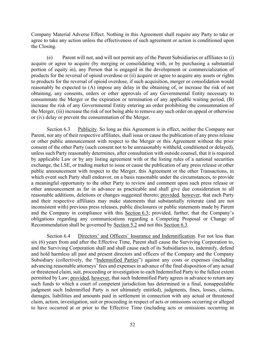 A. Concurrently with the execution and delivery of this Agreement, Parent, Olive Acquisition Subsidiary, Inc., a Delaware corporation and a wholly owned subsidiary of Parent (“Merger Sub”), and Opiant Pharmaceuticals, Inc., a Delaware corporation (the “Company”), are entering into that certain Agreement and Plan of Merger, dated as of the date hereof (as amended from time to time, the “Merger Agreement”; capitalized terms used but not defined herein shall have the meanings ascribed to such terms in the Merger Agreement), pursuant to which Merger Sub will merge with and into the Company, with the Company surviving as a wholly owned subsidiary of Parent.