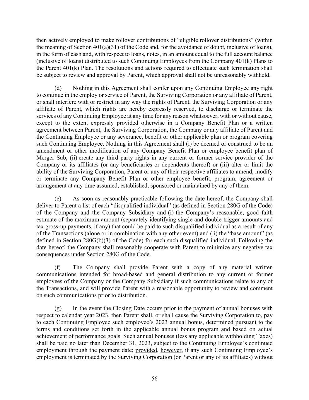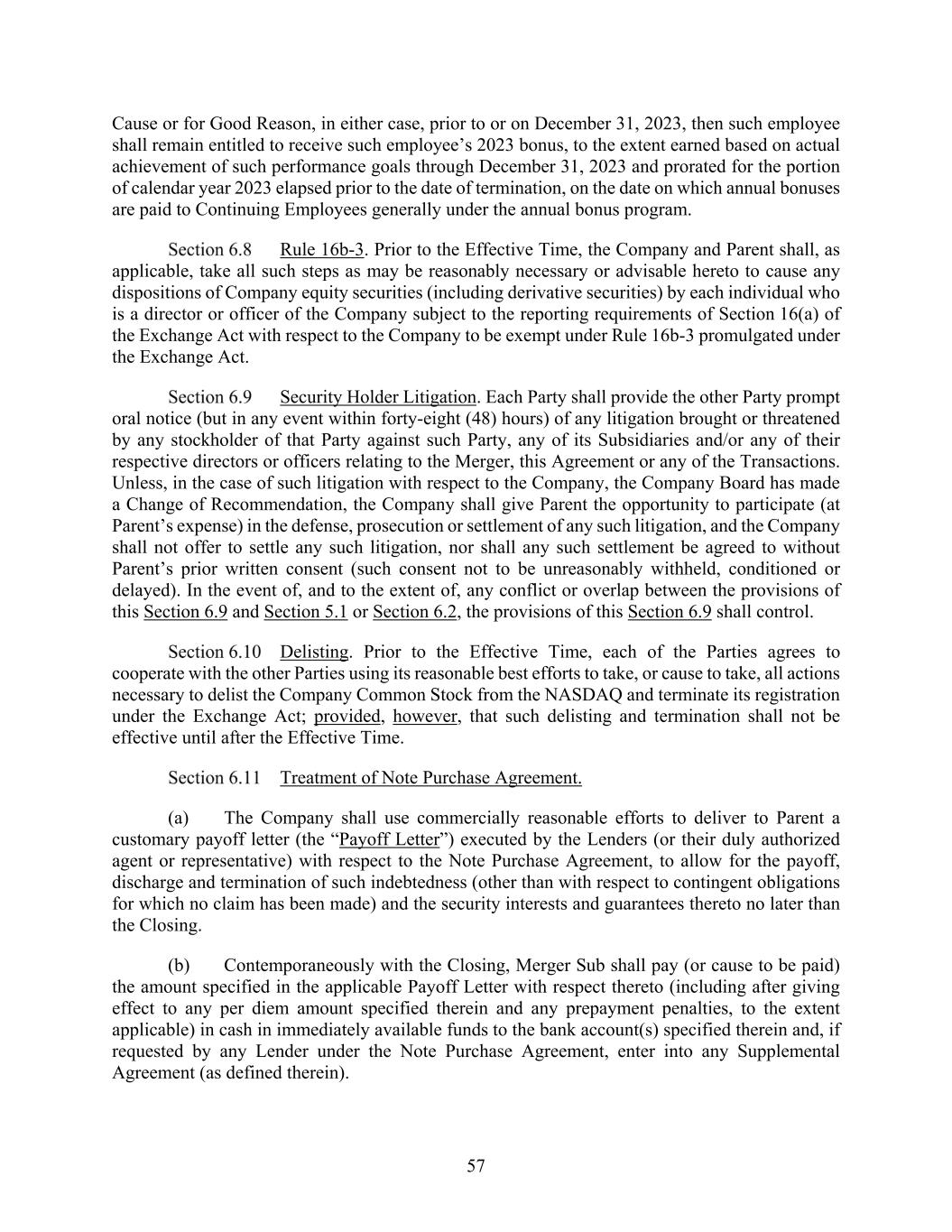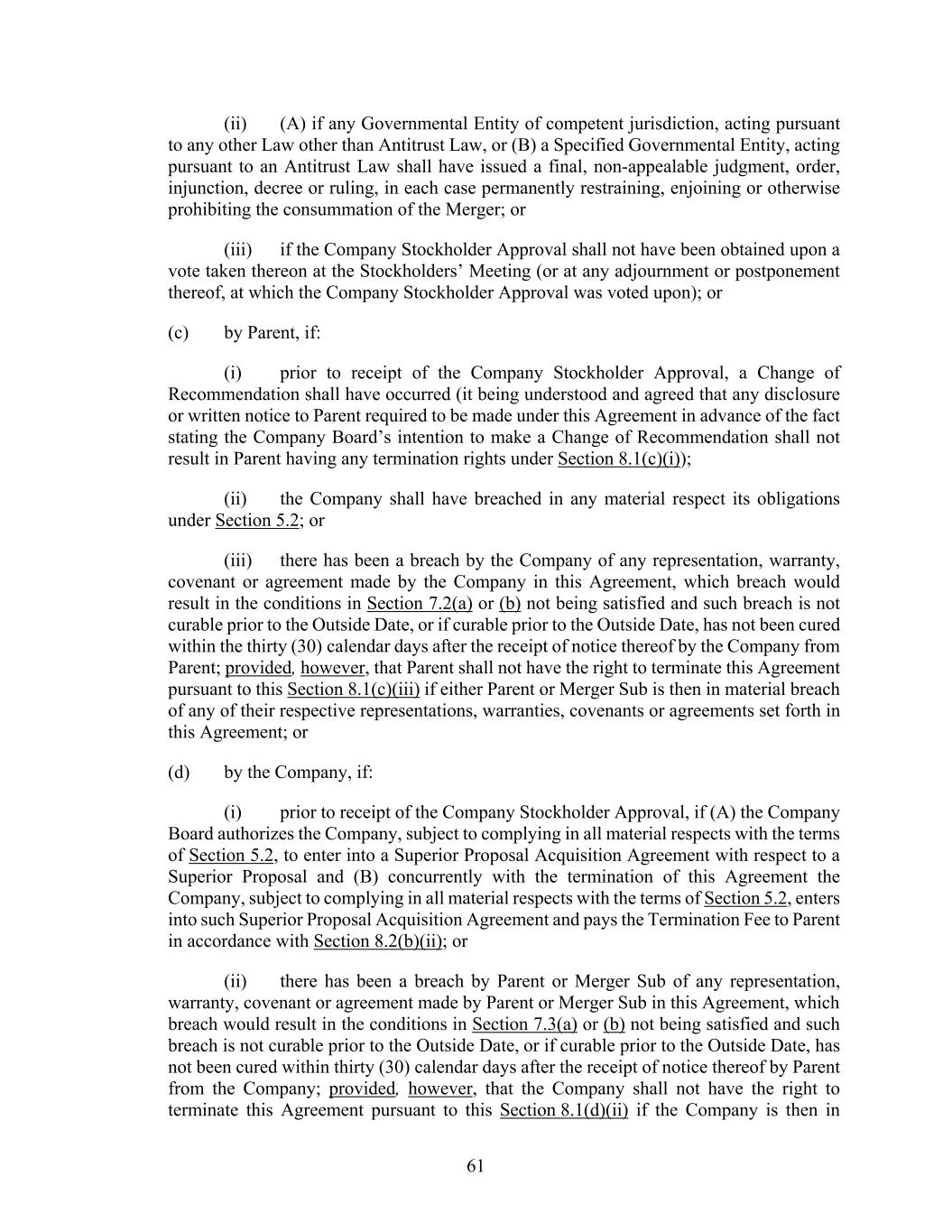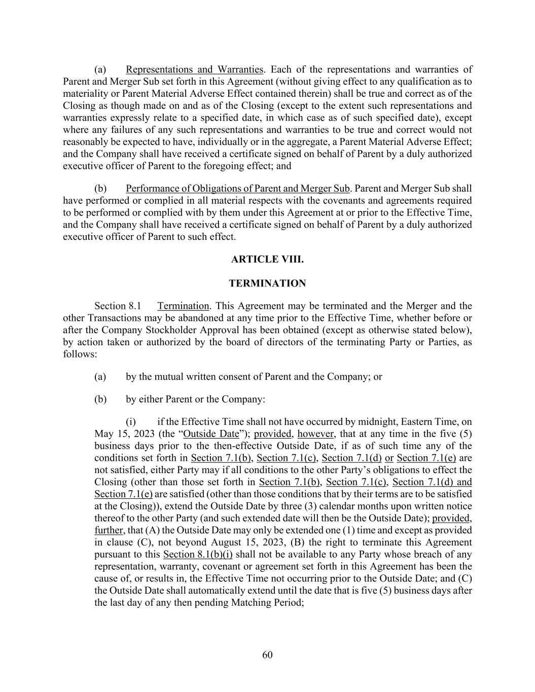 The Merger Agreement provides certain termination rights for both the Company and Parent, including, among others, the right of either party to terminate if (i) the Merger has not been consummated by May 15, 2023 (the “Outside Date”) (subject to a right of either party to extend such date to August 15, 2023 if the Company Stockholder Approval has been obtained and all other closing conditions other than those related to regulatory approvals are satisfied at any time in the five business days prior to the Outside Date) (unless a breach of the Merger Agreement by the party seeking termination was the primary cause of the failure of the Merger to be consummated); (ii) a governmental authority of competent jurisdiction, acting pursuant to any other law other than antitrust law, has issued a final non-appealable governmental order permanently restraining, enjoining or prohibiting the consummation of the Offer or the Merger; or (iii) the Company Stockholder Approval has not been obtained.