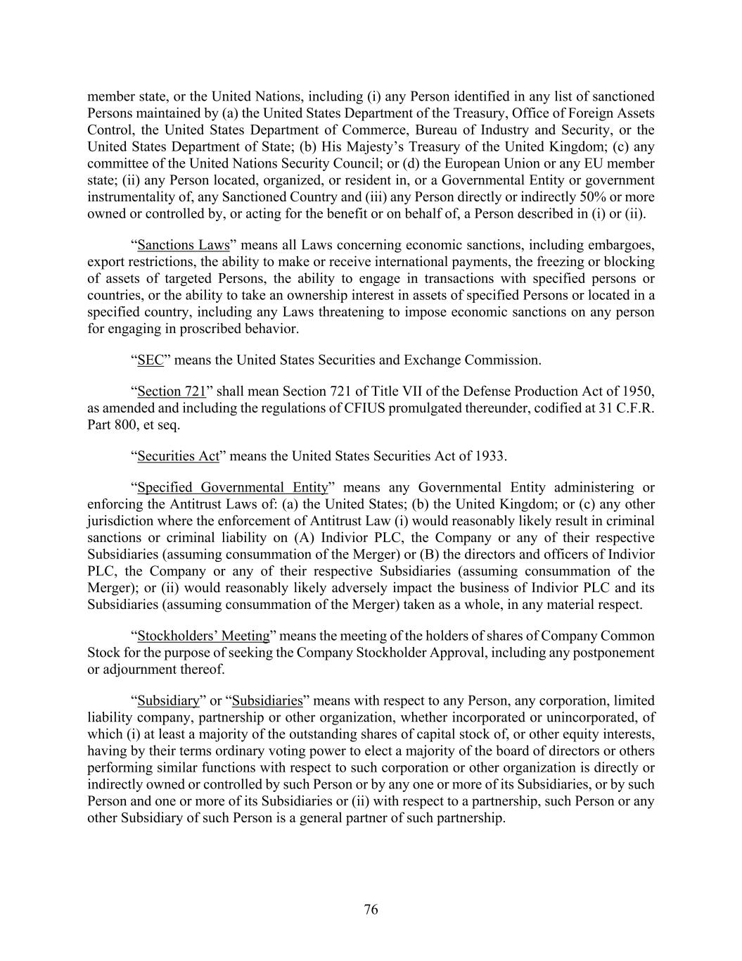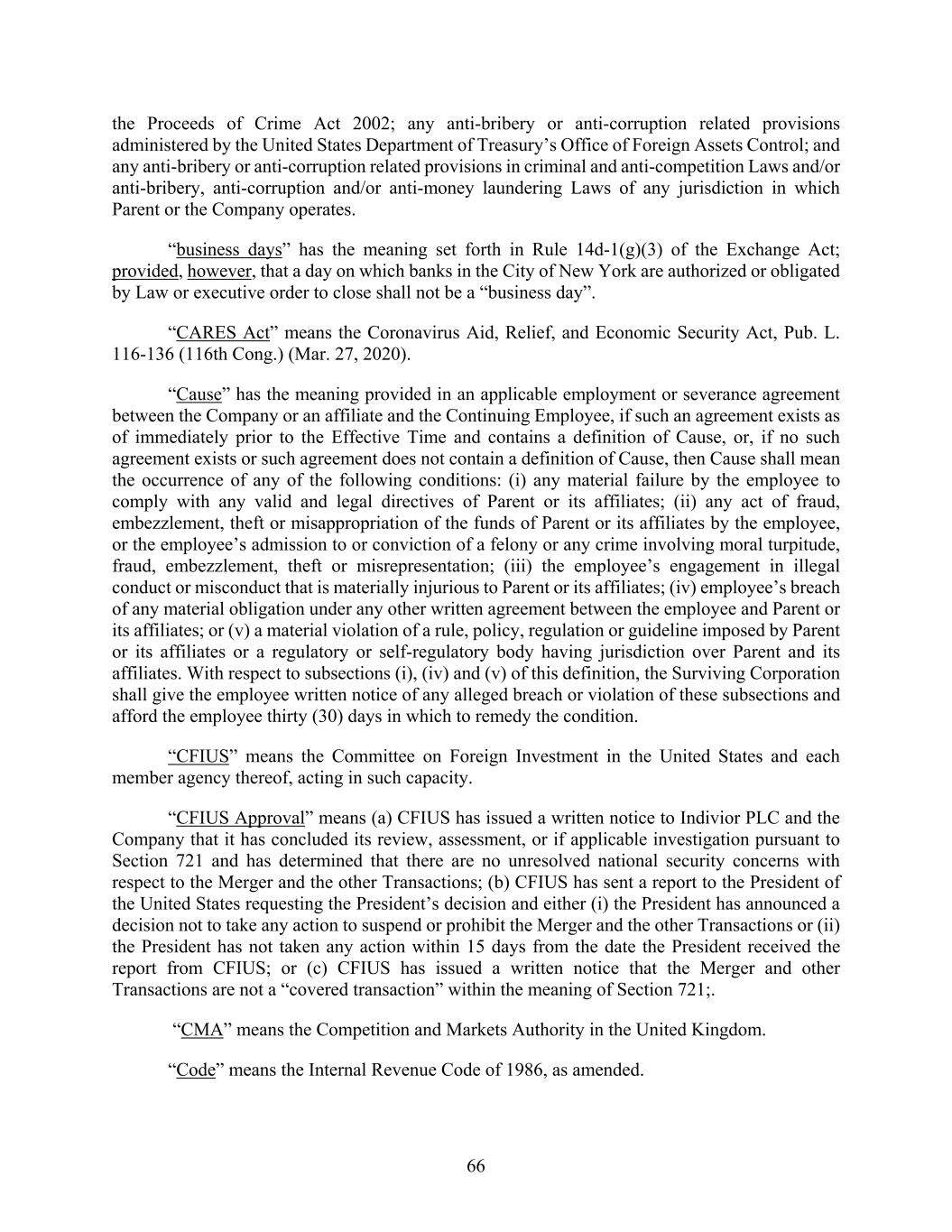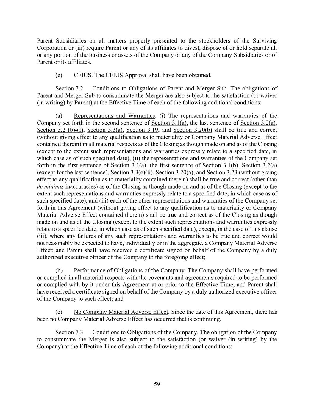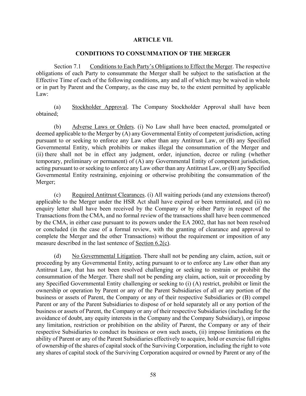 The Merger is subject to customary closing conditions, including the (i) absence of certain legal impediments, (ii) the expiration or termination of the required waiting periods under the Hart-Scott-Rodino Antitrust Improvements Act of 1976, as amended, (iii) clearance by the Committee on Foreign Investment in the United States, (iv) the resolution or conclusion, of any informal enquiry by, and in the case of a formal review, clearance and approval from the Competition and Markets Authority in the United Kingdom (“CMA”) under the United Kingdom Enterprise Act 2002, as amended, and (v) the affirmative vote of the holders of a majority of the outstanding shares of Company Common Stock entitled to vote upon the adoption of the Merger Agreement (the “Company Stockholder Approval”).