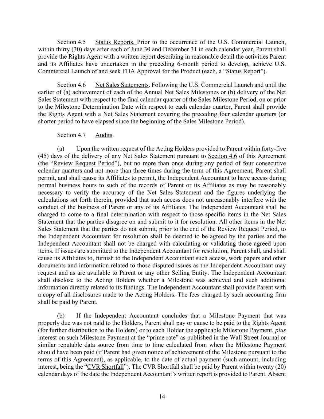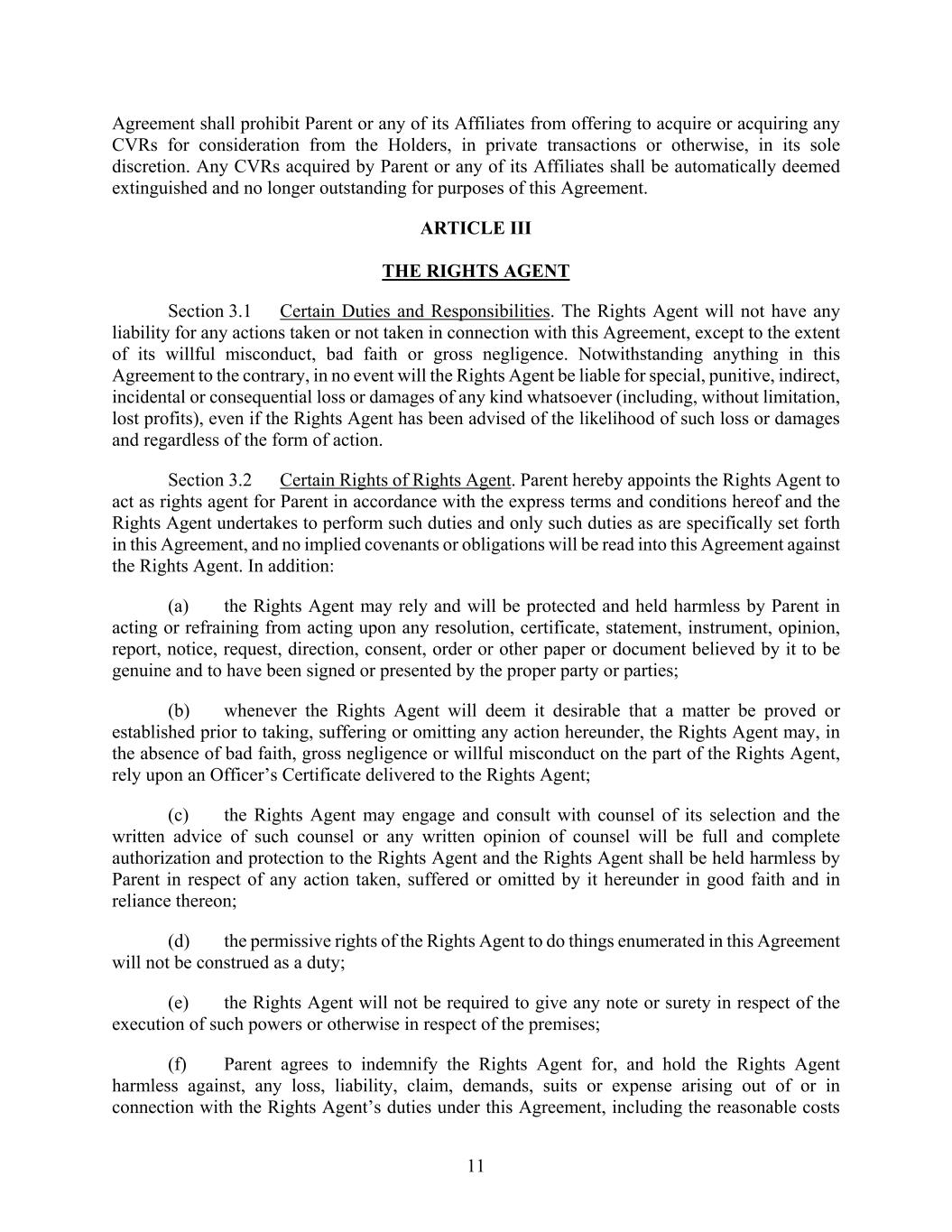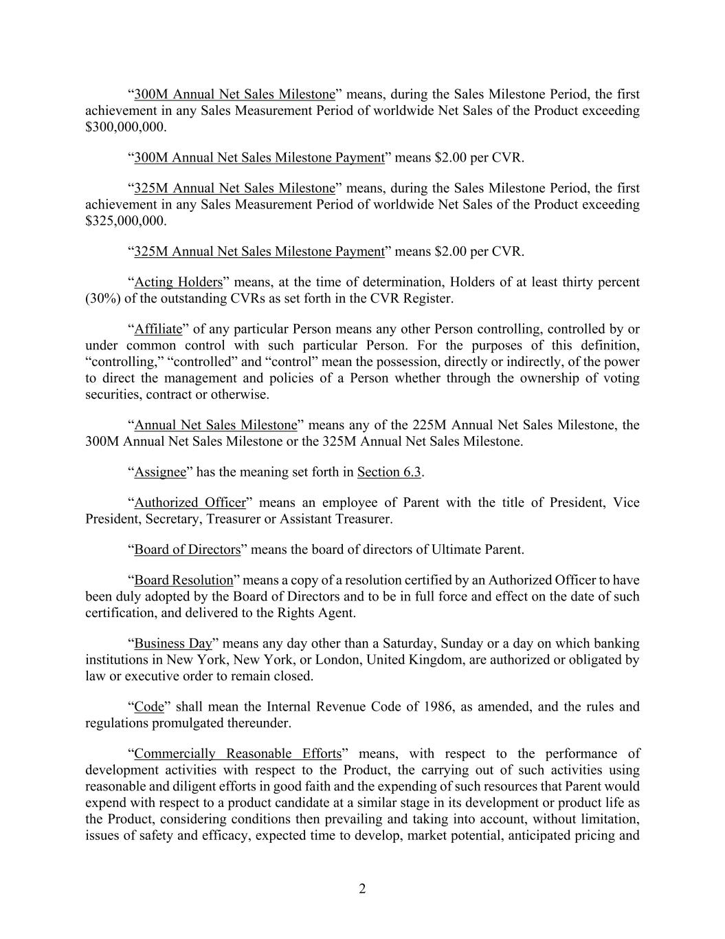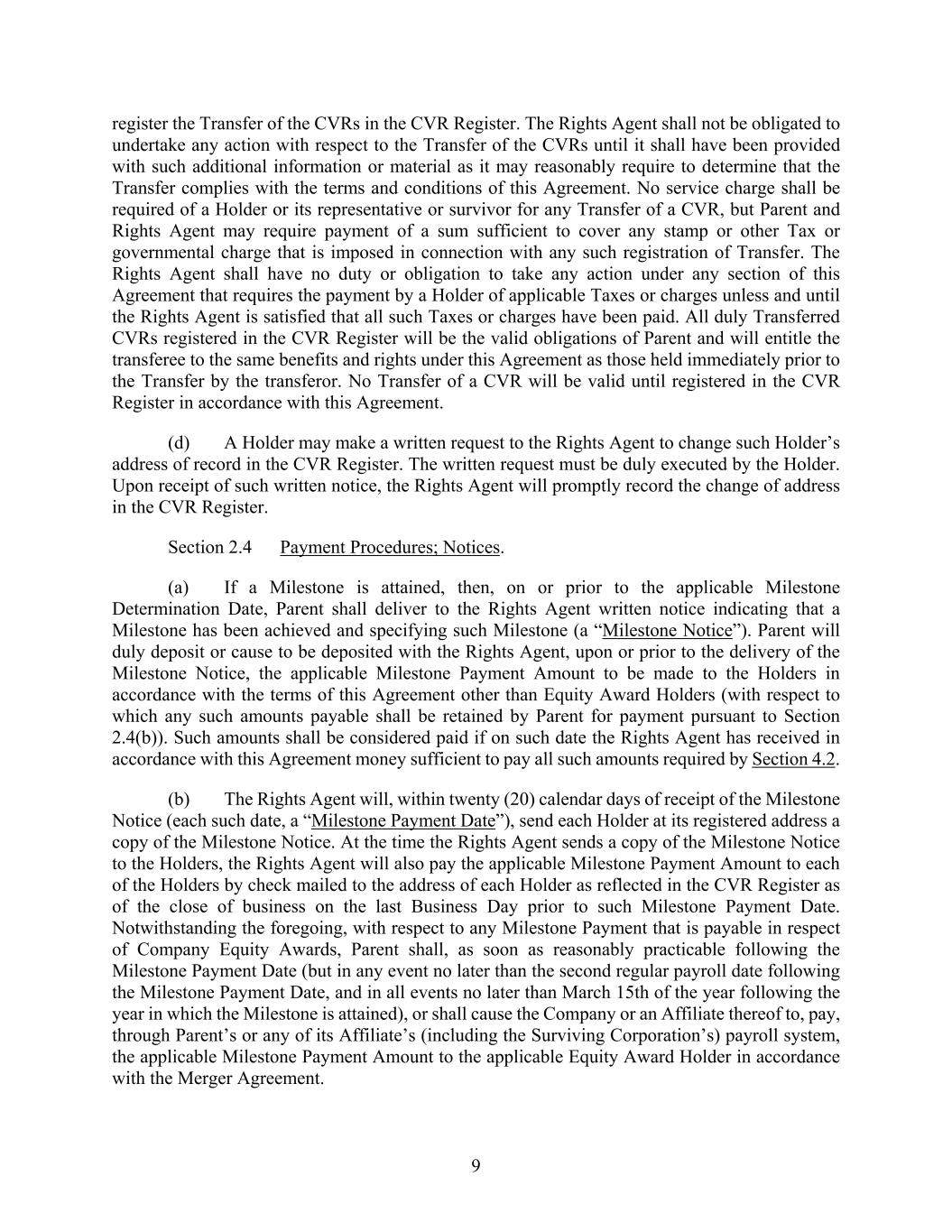 At or prior to the Effective Time, Parent and a rights agent selected by Parent and the Company will enter into a contingent rights agreement (the “CVR Agreement”), a form of which is attached to the Merger Agreement, governing the terms of each CVR. Each CVR entitles the holder thereof to receive four contingent cash payments with an aggregate maximum amount payable of $8.00, without interest (each, a “Milestone Payment”) if the following milestones are achieved: