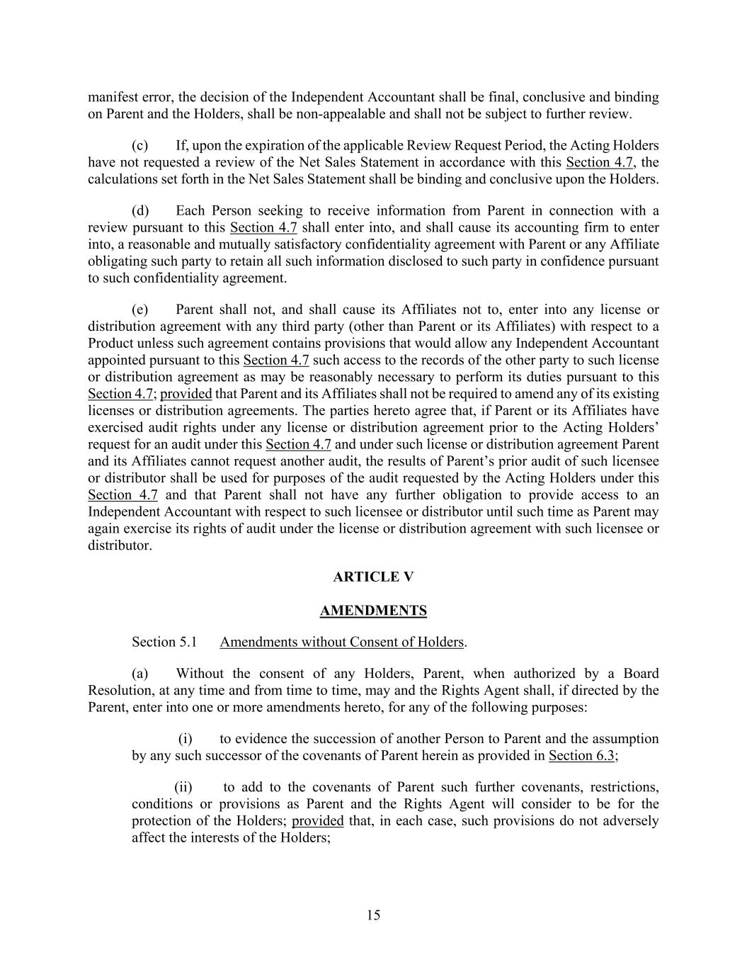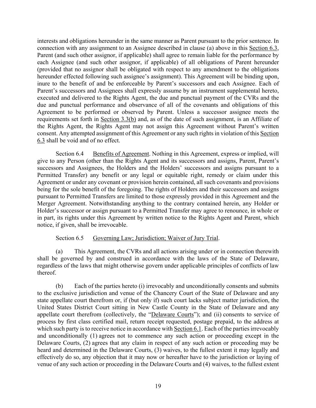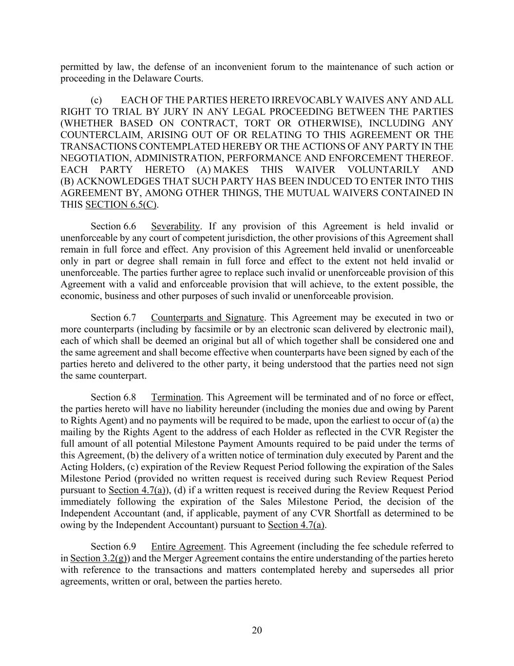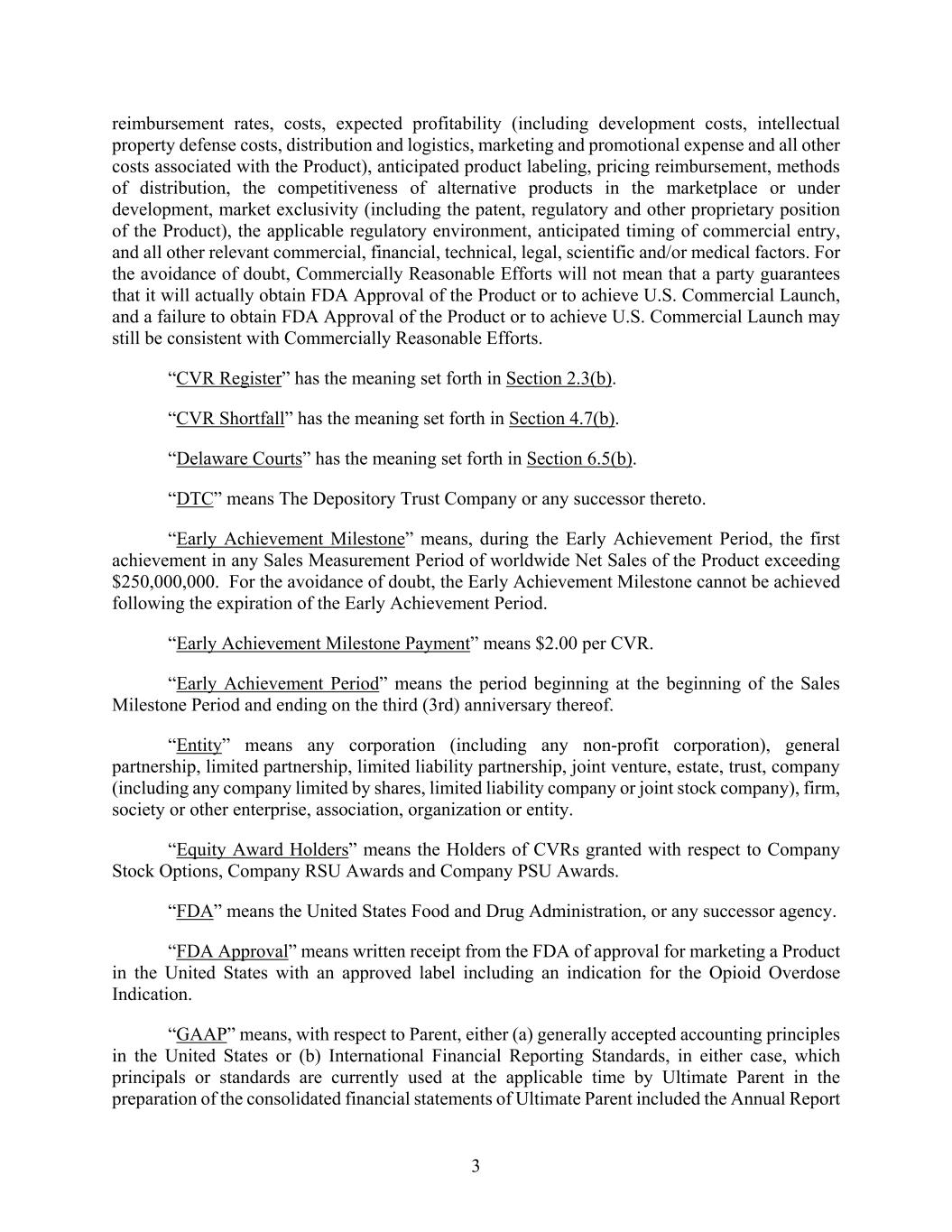 At or prior to the Effective Time, Parent and a rights agent selected by Parent and the Company will enter into a contingent rights agreement (the “CVR Agreement”), a form of which is attached to the Merger Agreement, governing the terms of each CVR. Each CVR entitles the holder thereof to receive four contingent cash payments with an aggregate maximum amount payable of $8.00, without interest (each, a “Milestone Payment”) if the following milestones are achieved:
