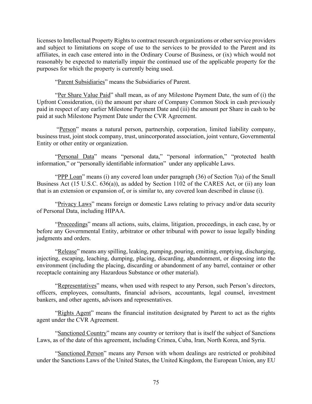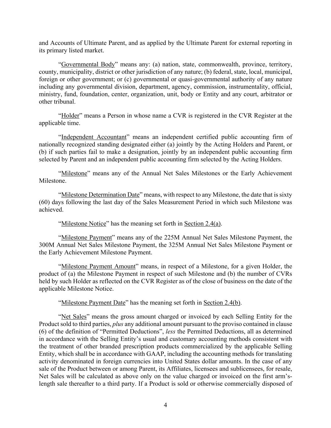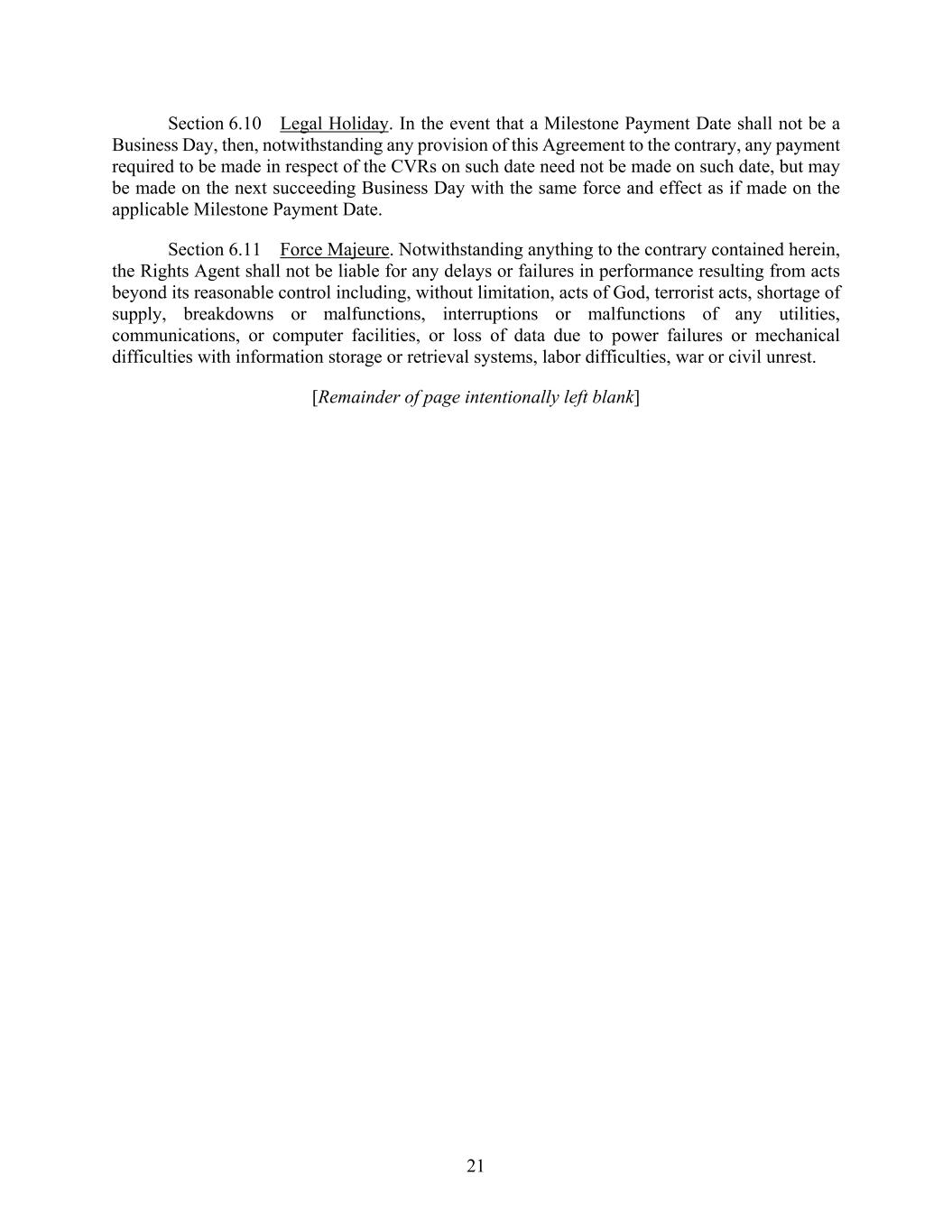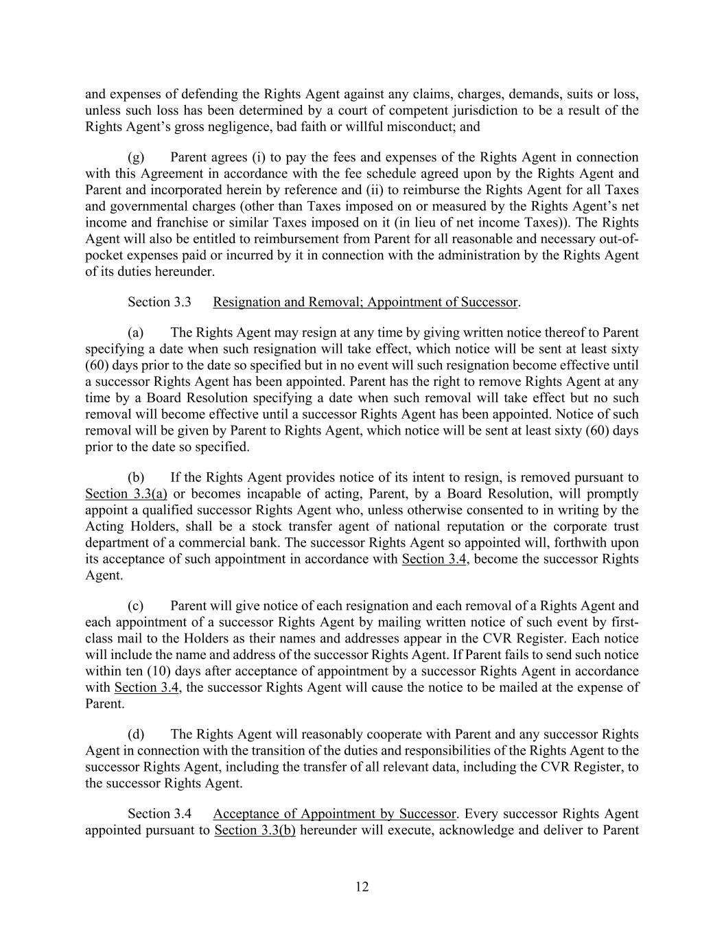 At or prior to the Effective Time, Parent and a rights agent selected by Parent and the Company will enter into a contingent rights agreement (the “CVR Agreement”), a form of which is attached to the Merger Agreement, governing the terms of each CVR. Each CVR entitles the holder thereof to receive four contingent cash payments with an aggregate maximum amount payable of $8.00, without interest (each, a “Milestone Payment”) if the following milestones are achieved: