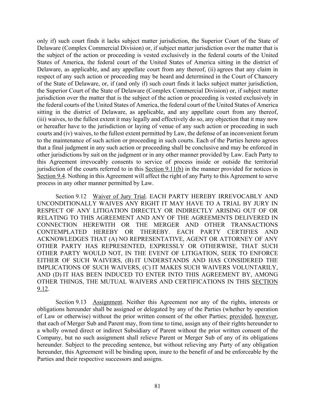 jurisdiction over the matter that is the subject of the action or proceeding is vested exclusively in the federal courts of the United States of America, the federal court of the United States of America sitting in the district of Delaware, as applicable, and any appellate court from any thereof, (ii) agrees that any claim in respect of any such action or proceeding may be heard and determined in the Court of Chancery of the State of Delaware, or, if (and only if) such court finds it lacks subject matter jurisdiction, the Superior Court of the State of Delaware (Complex Commercial Division) or, if subject matter jurisdiction over the matter that is the subject of the action or proceeding is vested exclusively in the federal courts of the United States of America, the federal court of the United States of America sitting in the district of Delaware, as applicable, and any appellate court from any thereof, (iii) waives, to the fullest extent it may legally and effectively do so, any objection that it may now or hereafter have to the jurisdiction or laying of venue of any such action or proceeding in such courts and (iv) waives, to the fullest extent permitted by Law, the defense of an inconvenient forum to the maintenance of such action or proceeding in such courts. Each of the Parties hereto agrees that a final judgment in any such action or proceeding shall be conclusive and may be enforced in other jurisdictions by suit on the judgment or in any other manner provided by Law.
