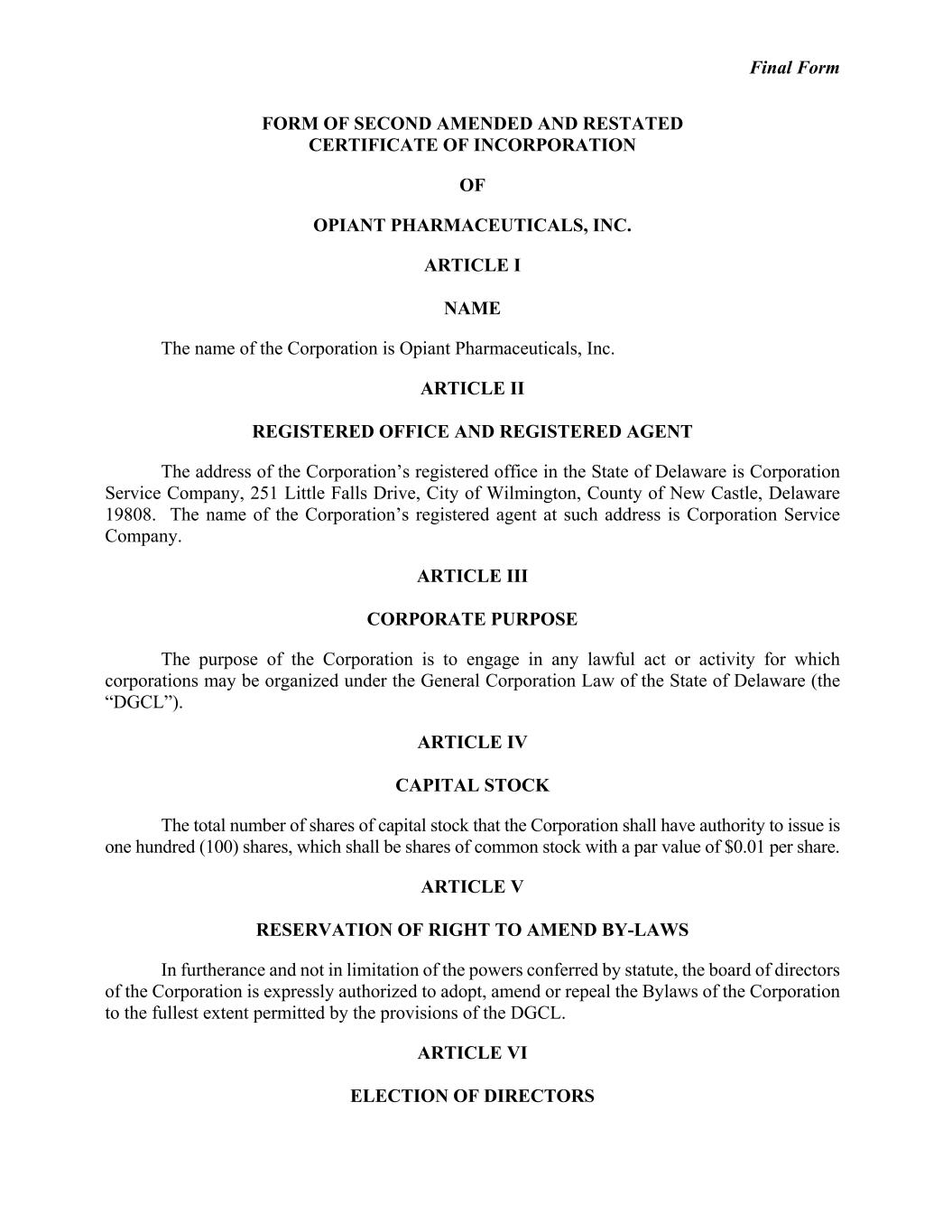 | | | OPIANT PHARMACEUTICALS, INC. |