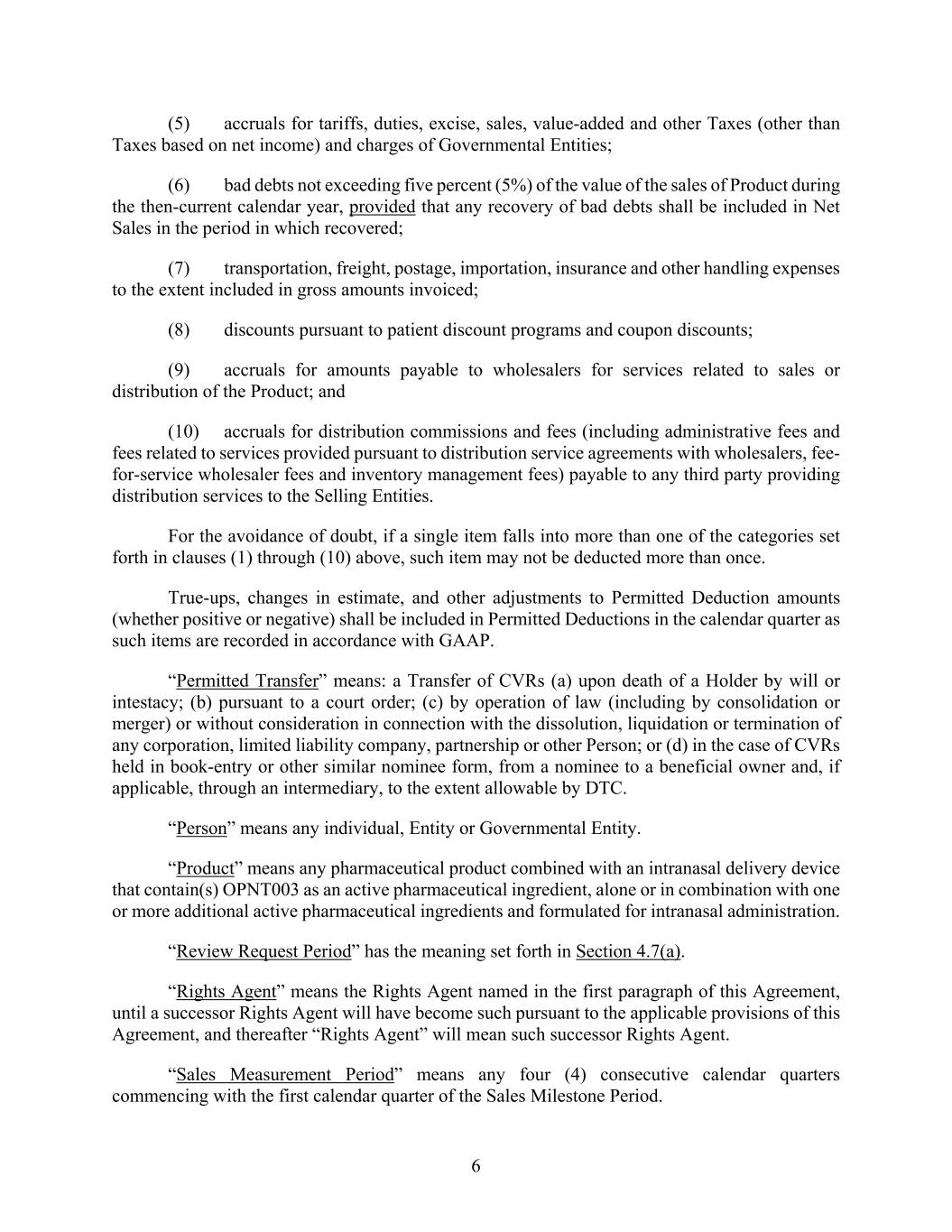 •$2.00 per CVR upon achievement of net sales of OPNT003 of $300 million or more during any period of four consecutive quarters prior to the seventh anniversary of the U.S. commercial launch of OPNT003.