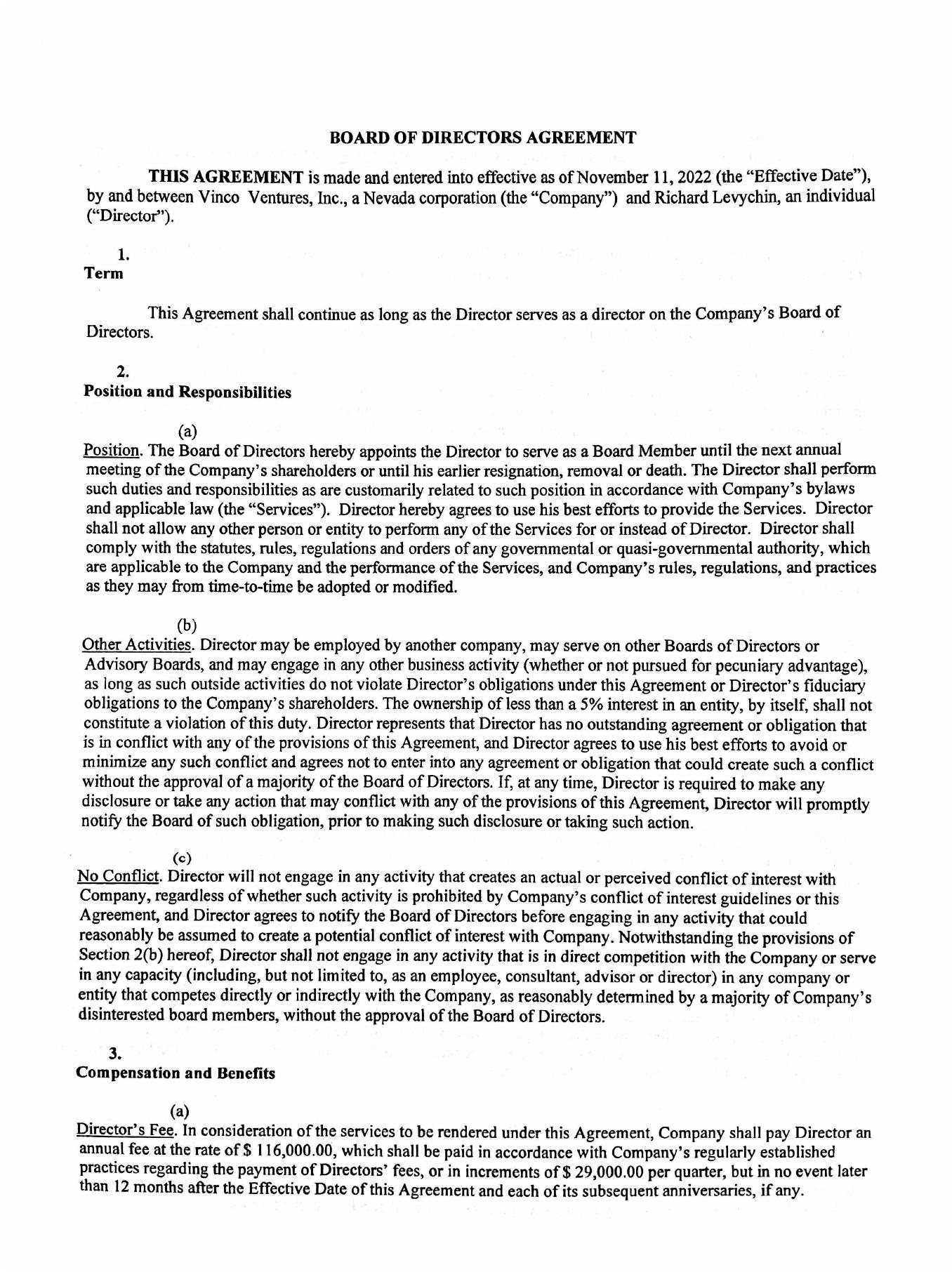 On November 11, 2022, Vinco Ventures, Inc. (the “Company”) entered into a director’s agreement with Richard Levychin, CPA, CGMA (the “Director’s Agreement”) pursuant to which he accepted appointment as a Director of the Company and also appointment to the Audit Committee as its Chair and the financial expert.