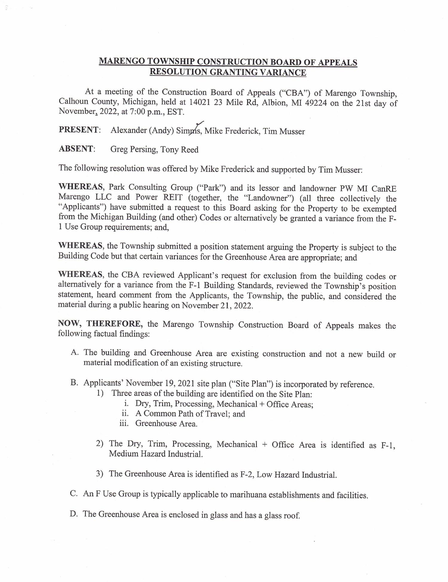 | 10.1 | Marengo Township Construction Board of Appeals Resolution Granting Variance | |