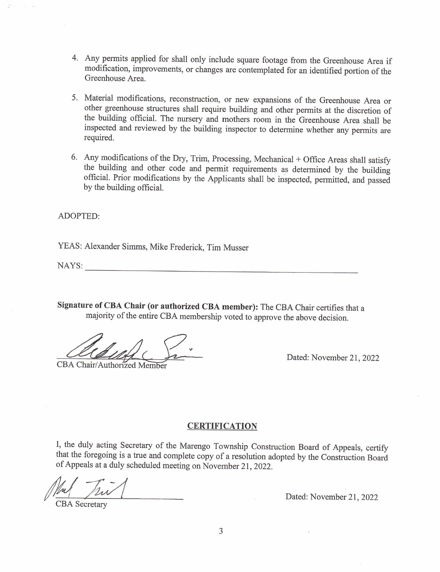 Update Regarding Marengo Township, Michigan Greenhouse Cultivation Facility
