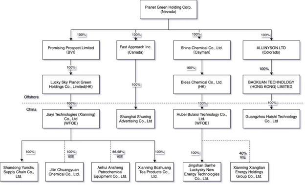 Planet Green Holdings Corp. (the “Planet Green”) is not an operating company in the PRC but a Nevada holding company with its operations conducted through its subsidiaries in the PRC, U.S., Hong Kong and Canada (the “Subsidiaries”) and through contractual arrangements with its variable interest entities, or VIEs including Jilin Chuanyuan, Anhui Ansheng and Xiangtian Energy (the “VIEs”), which are companies incorporated in the PRC. The VIEs are consolidated for accounting purpose only and Planet Green does not own any equity interest in the VIEs. Investors may never directly hold equity interests in the VIEs. The VIE structure is used to provide investors with exposure to foreign investment in China-based companies where Chinese law prohibits or limits direct foreign investment in the operating companies. However, our contractual arrangements with the VIEs are not equivalent of an investment in the VIEs. Investors of our securities thus are not purchasing equity interest in the VIEs and their subsidiaries in China but instead are purchasing equity interest in a Nevada holding company. Such VIE arrangement is not identical to owning such entities directly, and investors will own shares in a holding company with contracts with the VIEs and will not have any equity ownership of such VIEs themselves. The VIE arrangement may not be as effective as direct ownership in providing us with control over the VIEs. Direct ownership would allow us, for example, to directly or indirectly exercise our rights as a shareholder to effect changes in the boards of directors, which, in turn, could affect changes, subject to any applicable fiduciary obligations at the management level. However, under the VIE arrangement, as a legal matter, if the VIEs or its shareholders fail to perform their respective obligations under the VIE arrangement, we may have to incur substantial costs and expend significant resources to enforce those arrangements and resort to litigation or arbitration and rely on legal remedies under PRC laws. These remedies may include seeking specific performance or injunctive relief and claiming damages, any of which may not be effective. In the event we are unable to enforce these VIE Agreements or we experience significant delays or other obstacles in the process of enforcing the VIE arrangement, we may lose control over the assets owned by the VIEs.