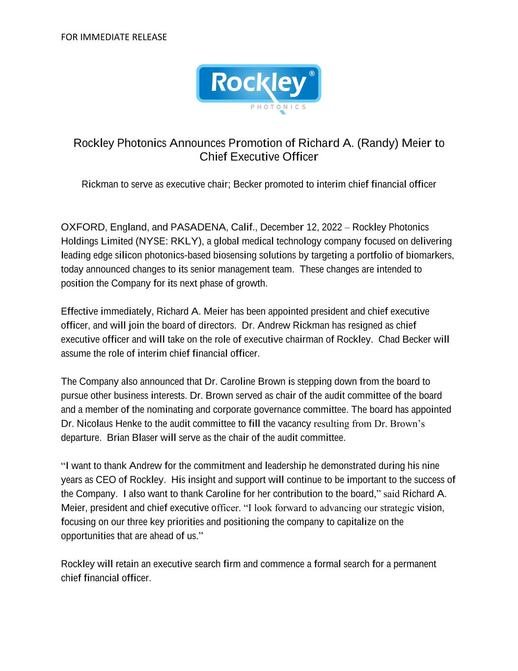 FOR IMMEDIATE RELEASE Rockley Photonics Announces Promotion of Richard A. (Randy) Meier to Chief Executive Officer Rickman to serve as executive chair; Becker promoted to interim chief financial officer OXFORD, England, and PASADENA, Calif., December 12, 2022 – Rockley Photonics Holdings Limited (NYSE: RKLY), a global medical technology company focused on delivering leading edge silicon photonics-based biosensing solutions by targeting a portfolio of biomarkers, today announced changes to its senior management team. These changes are intended to position the Company for its next phase of growth. Effective immediately, Richard A. Meier has been appointed president and chief executive officer, and will join the board of directors. Dr. Andrew Rickman has resigned as chief executive officer and will take on the role of executive chairman of Rockley. Chad Becker will assume the role of interim chief financial officer. The Company also announced that Dr. Caroline Brown is stepping down from the board to pursue other business interests. Dr. Brown served as chair of the audit committee of the board and a member of the nominating and corporate governance committee. The board has appointed Dr. Nicolaus Henke to the audit committee to fill the vacancy resulting from Dr. Brown’s departure. Brian Blaser will serve as the chair of the audit committee. “I want to thank Andrew for the commitment and leadership he demonstrated during his nine years as CEO of Rockley. His insight and support will continue to be important to the success of the Company. I also want to thank Caroline for her contribution to the board,” said Richard A. Meier, president and chief executive officer. “I look forward to advancing our strategic vision, focusing on our three key priorities and positioning the company to capitalize on the opportunities that are ahead of us.” Rockley will retain an executive search firm and commence a formal search for a permanent chief financial officer.