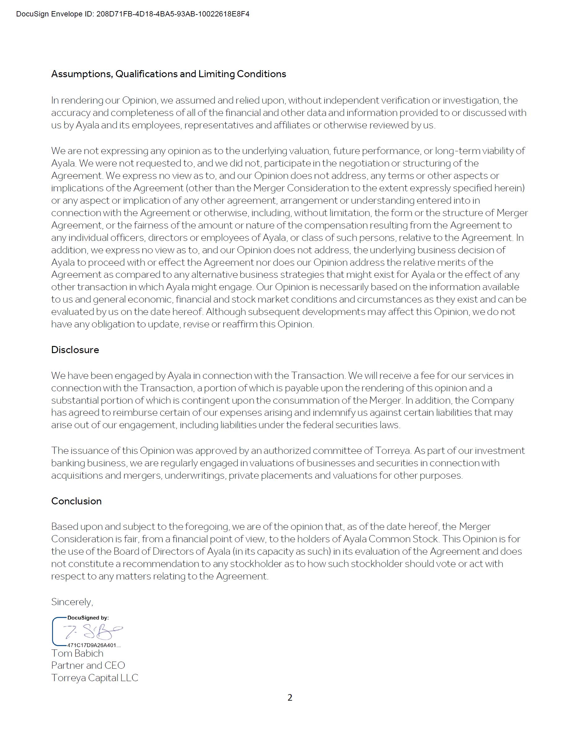 Ayala is excited about the opportunities the Merger brings to Ayala’s stockholders and thanks you for your consideration and continued support.