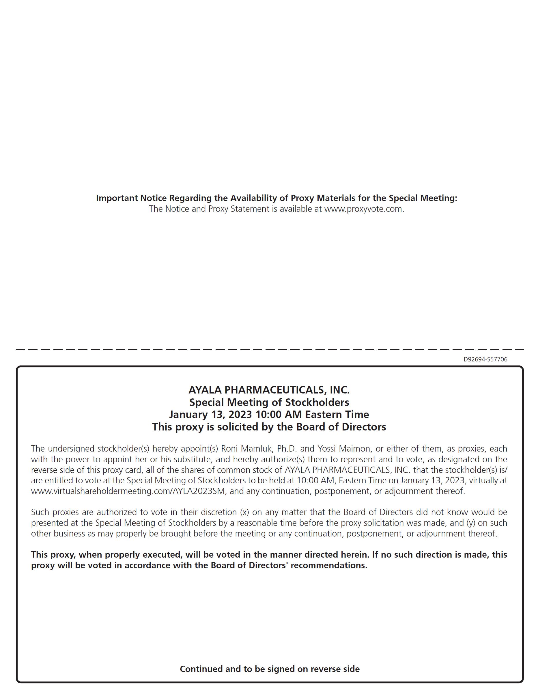 NOTICE IS HEREBY GIVEN that Ayala Pharmaceuticals, Inc. (“Ayala”) will hold a virtual special meeting of stockholders (the “Ayala Special Meeting”), on January 13, 2023, at 10:00 a.m. Eastern Time, unless postponed or adjourned to a later date. The Ayala Special Meeting will be held entirely as a virtual meeting. You will be able to attend and participate in the Ayala Special Meeting online by visiting www.virtualshareholdermeeting.com/AYLA2023SM, where you will be able to listen to the meeting live, submit questions and vote.