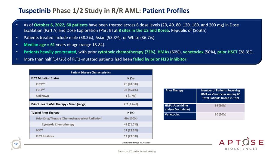 11 Tuspetinib Phase 1/2 Study in R/R AML Dose Escalation & Dose Exploration Completed PART B DOSE EXPLORATION (42 Pts Dosed) PART A DOSE ESCALATION (18 Pts Dosed) Cohort 6 200 mg QD Completed Cohort 5 160 mg QD Completed Cohort 4 120 mg QD Completed Cohort 3 80 mg QD Completed Cohort 2 40 mg QD Completed Cohort 1 20 mg QD Completed 160 mg QD 80 mg QD 120 mg QD Completed Dose Escalation and Dose Exploration completed across six dose cohorts • Total patients dosed in Part A + Part B = 60 • Total evaluable for efficacy in Part A + Part B = 48 • Total evaluable for efficacy at 80/120/160mg = 42 • Additional patients being placed on 40mg dose level Favorable , non - myelosuppressive safety profile: • No drug related SAE or deaths • No drug - related QT c prolongation • No DLT through 160 mg dose level • Plasma t 1/2 estimated at 40hrs • Patients fasted in this trial DLT 40 mg QD Enrolling DLT Completed CRc DLT CRc Executed: 31OCT2022 Data filtered through: 06OCT2022 CRc DLT Completed CRc Data from 2022 ASH Annual Meeting