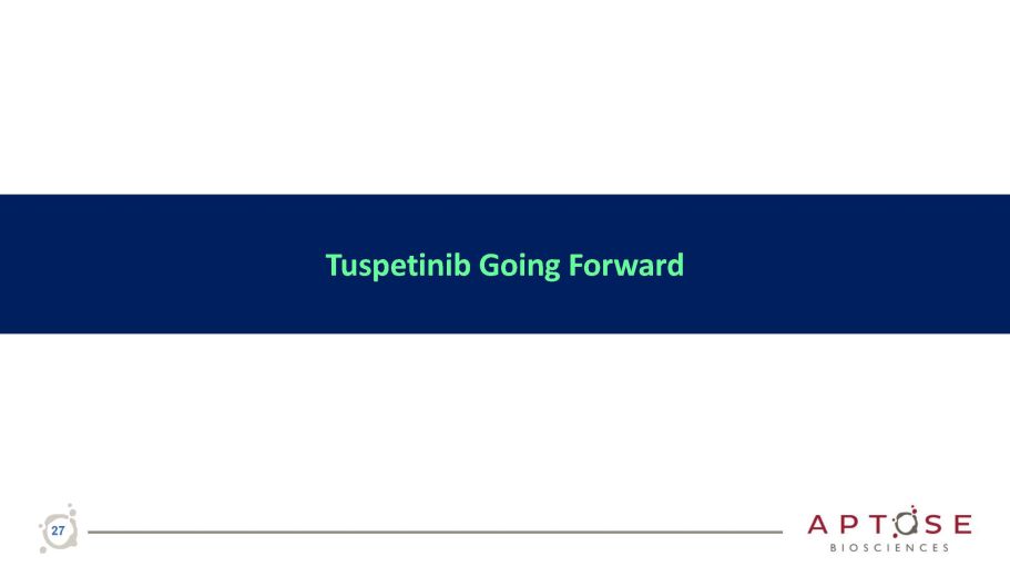 Tuspetinib Global Dose Expansion Trial Planned to Support Registrational Trials for Accelerated Approval and Drug Combination Trials for Broad Commercialization Doublet Combo Phase 2 Randomized Study R/R AML in 2L, FLT3 mutant – Tus vs. Tus/VEN vs. GILT Triplet Combo Phase 2 - 3 Randomized Study 1L unfit AML: HMA/VEN vs. Tus/HMA/VEN + maint 1L fit AML, FLT3 - WT: Chemo vs. Tus/Chemo + maint Drug Combination Trials to Support Usage of Tuspetinib with Other Agents in AML Populations • Single agent Expansion studies designed to collect data on a small number of patients in “high need” groups and segue into Ph 2 Registrational Trial(s) • Combination Expansion studies designed to illustrate safety and efficacy of Tuspetinib with venetoclax and segue into Phase 2 - 3 randomized trials and demonstrate Tuspetinib can be the preferred agent for combination therapy Escalation (A)/Exploration (B) Trial Tuspetinib Single Agent • Dose Escalation ─ 20mg to 200mg • Dose Exploration ─ 40, 80, 120, 160mg ─ Up to 20 pts/dose Tuspetinib Monotherapy • FLT3 - Mutated Cohort: ─ Enrich Prior FLT3i • FLT3 - Unmutated Cohort: ─ Enrich TP53 MUT / Complex Karyotype Doublet Combination of Tuspetinib + Venetoclax • FLT3 - Mutated • FLT3 - Unmutated APTIVATE TRIAL Expansions Ongoing Tuspetinib and Tus | Ven Registrational Phase 2 – Monotherapy FLT3 MUT R/R AML prior FLT3i therapy Single Agent Registrational Trials Planned if Data from Expansion Trial Support Accelerated Approval and Marketing Registrational Phase 2 study – Single Agent NPM1 MUT R/R AML or TP53 MUT 12 - 16 pts to justify 28