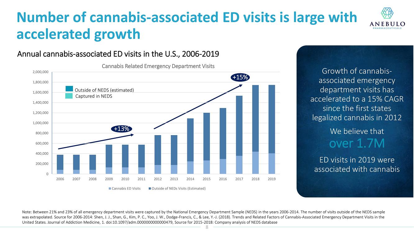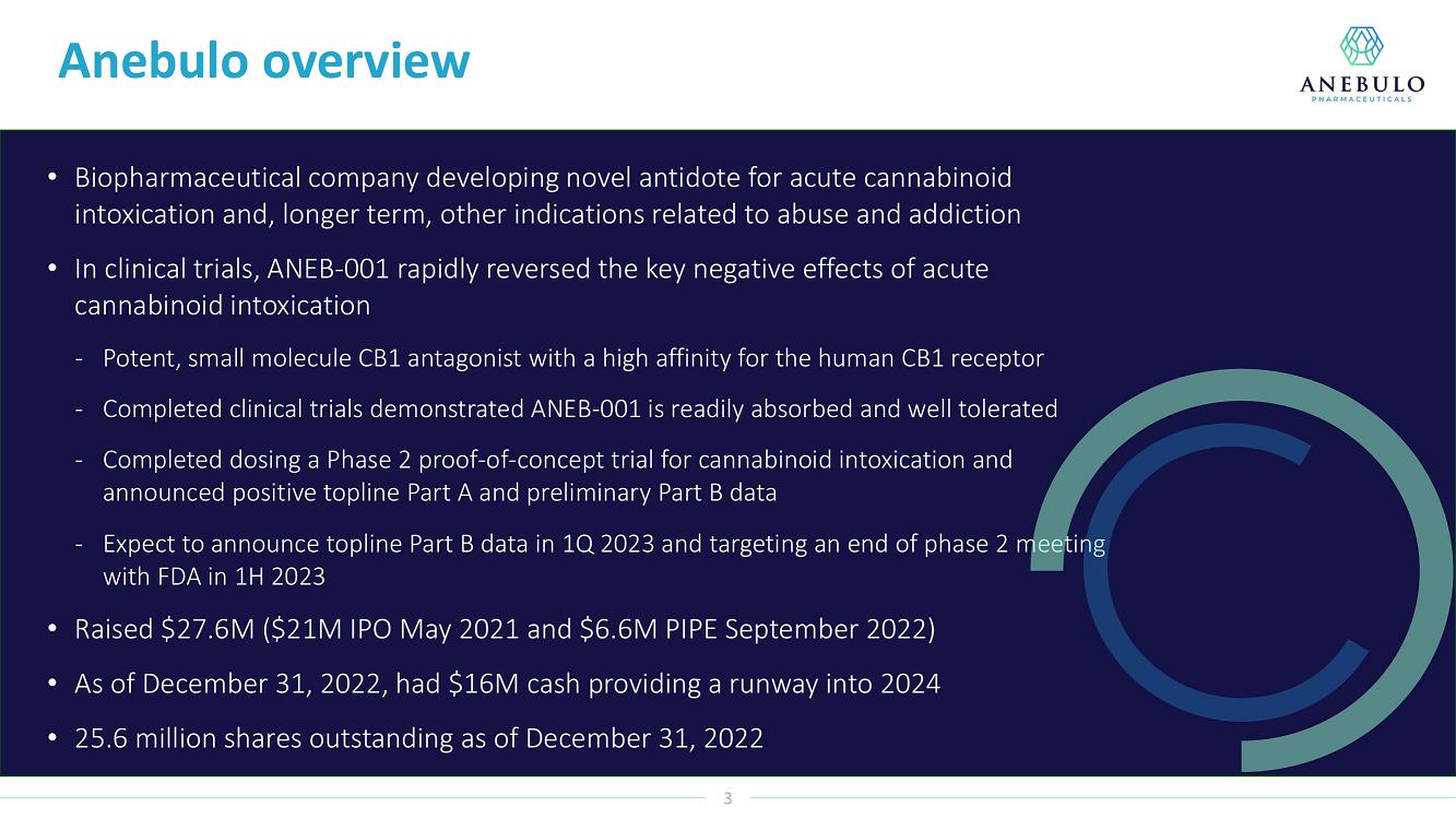 Anebulo Pharmaceuticals, Inc. is a clinical-stage biopharmaceutical company developing novel solutions for people suffering from acute cannabinoid intoxication and substance abuse disorder. Its lead product candidate, ANEB-001, has completed dosing in a Phase 2 clinical trial (www.clinicaltrials.gov/ct2/show/NCT05282797) evaluating its utility in reversing the negative effects of acute cannabinoid intoxication. ANEB-001 is a competitive antagonist at the human cannabinoid receptor type 1 (CB1). For further information about Anebulo, please visit www.anebulo.com.