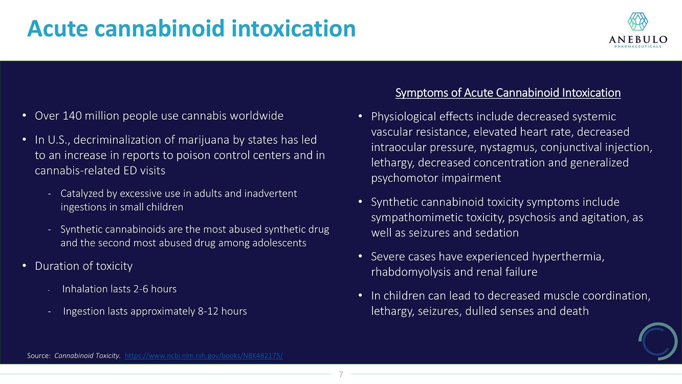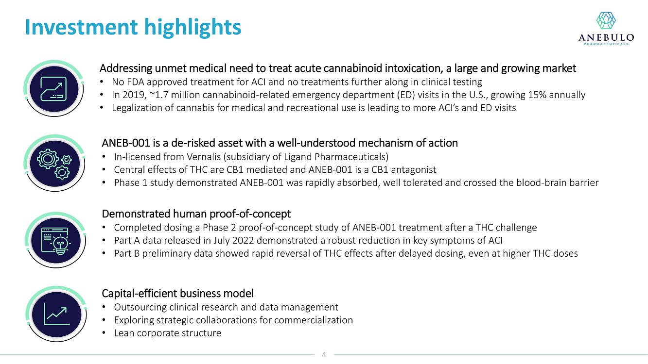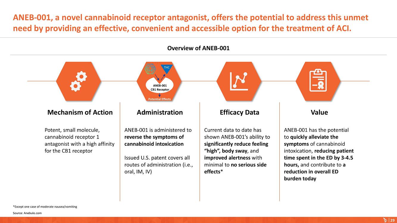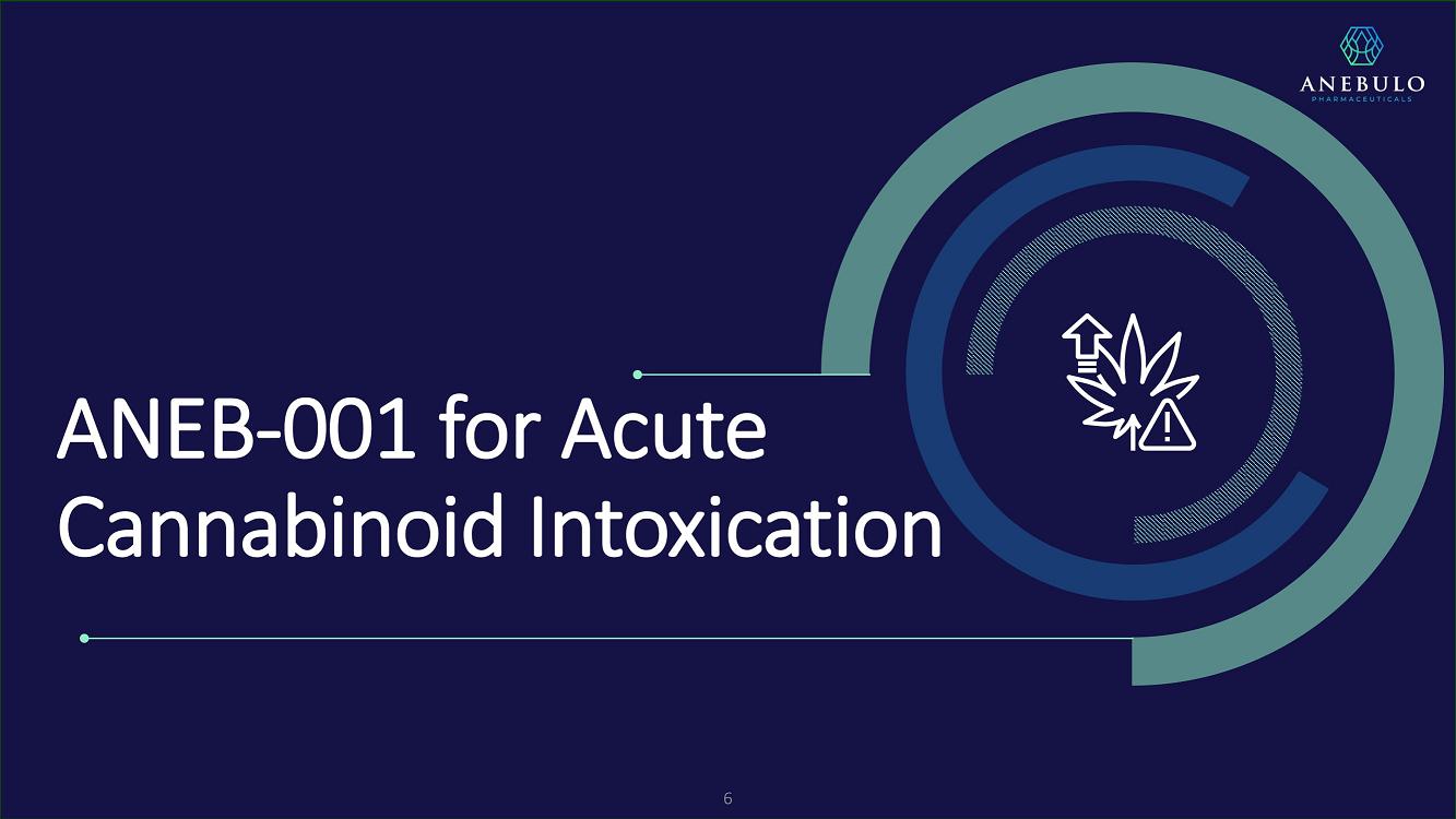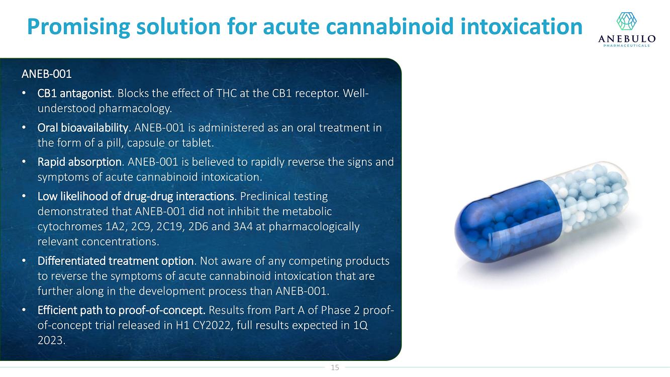 Our lead product candidate is ANEB-001, a potent, small molecule cannabinoid receptor antagonist, to address the unmet medical need for a specific antidote for ACI. ANEB-001 is an orally bioavailable, readily absorbed treatment candidate that we anticipate will rapidly reverse key symptoms of ACI. ANEB-001 is protected by one issued patent and rights to one patent application covering various methods of use of the compound and delivery systems. We began a Phase 2 proof-of-concept trial for ANEB-001 in December 2021 in the Netherlands and announced positive Phase 2 Part A proof-of-concept topline data on July 5, 2022, positive Part B data on September 26, 2022, and completed dosing of all subjects in mid-December 2022.