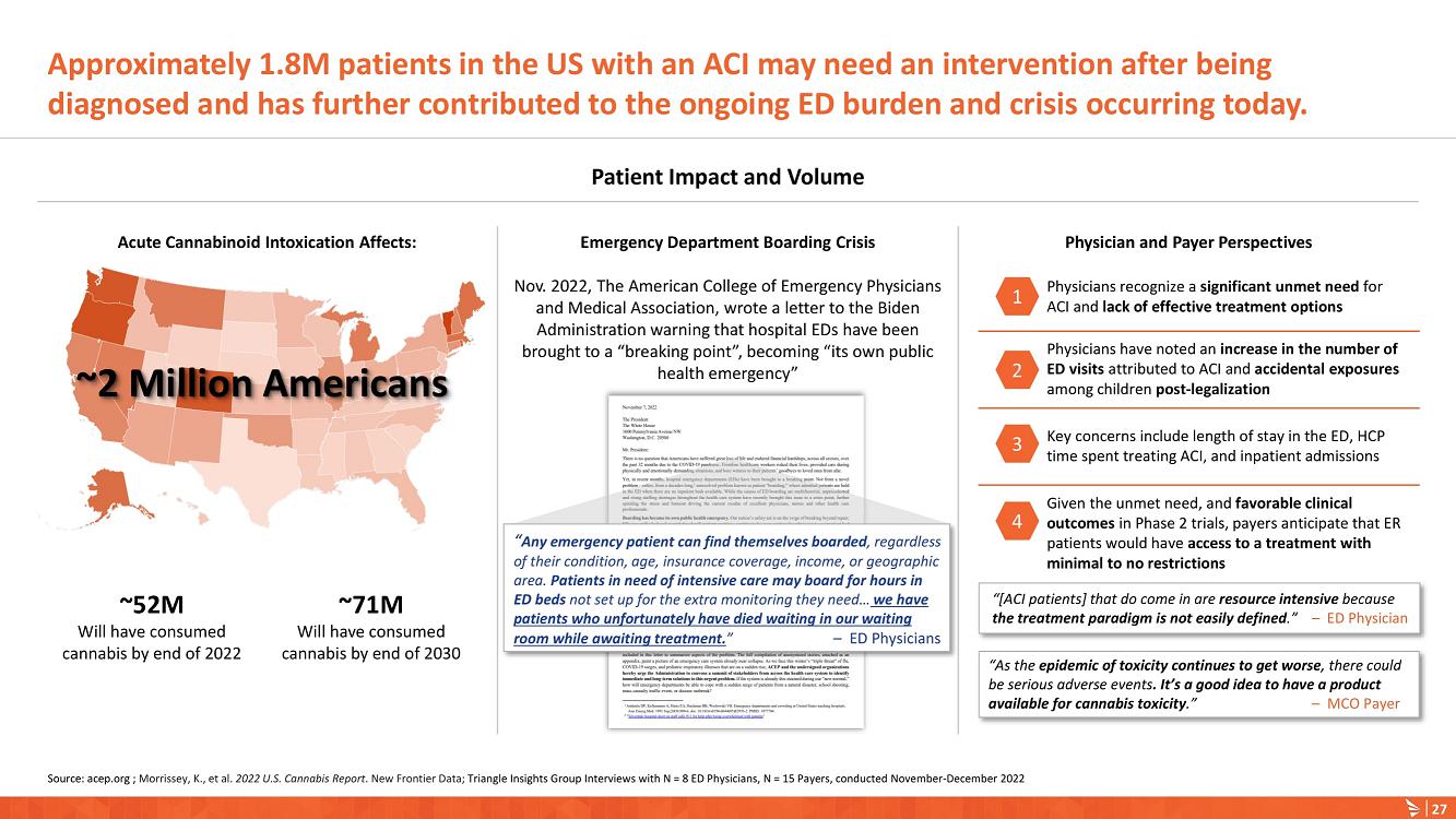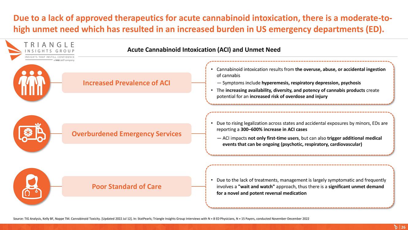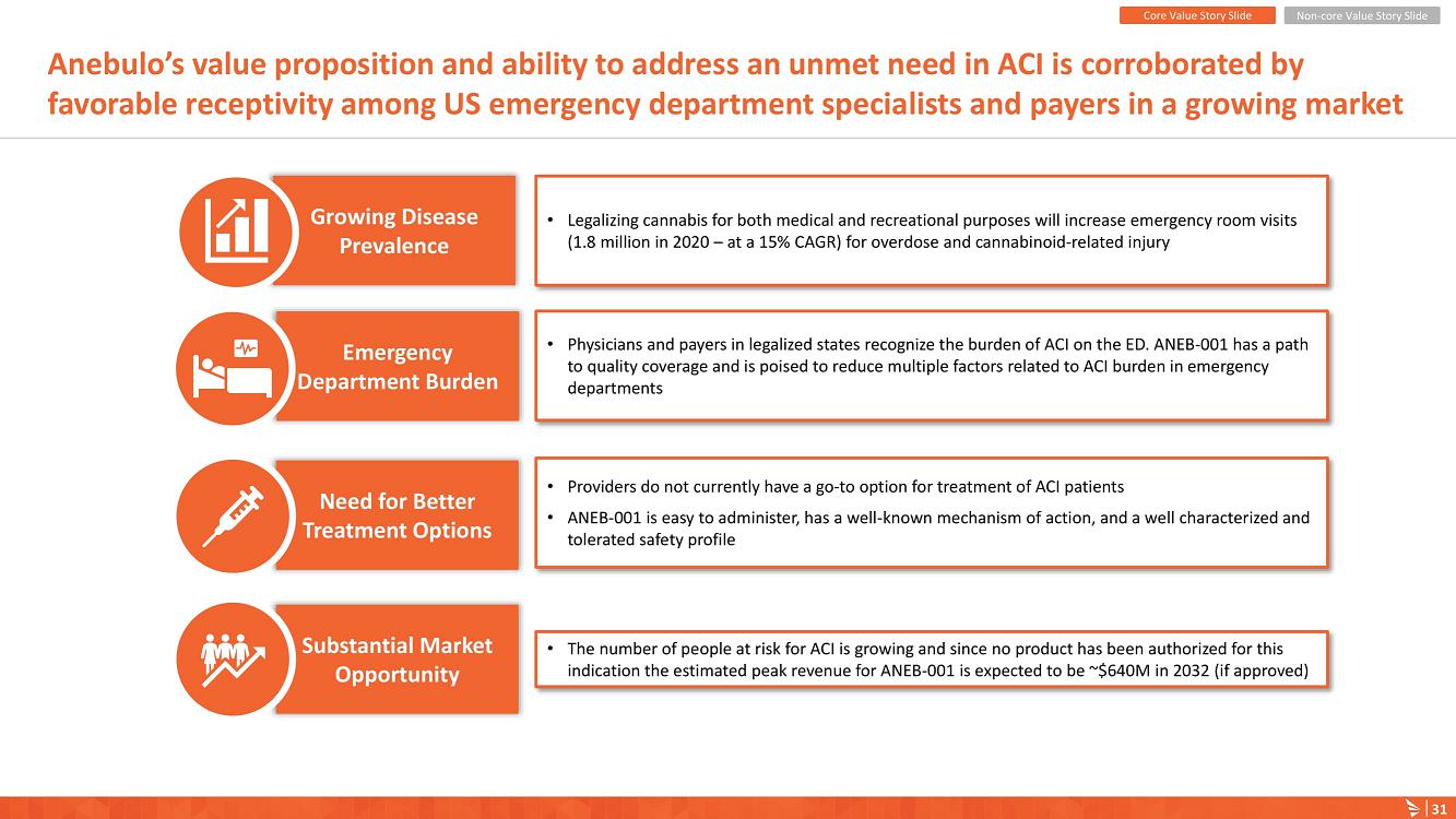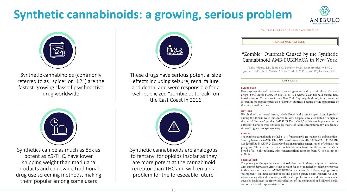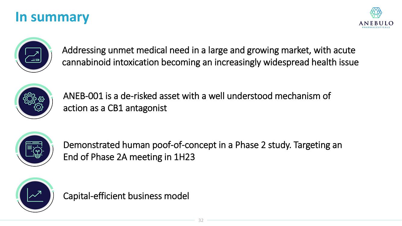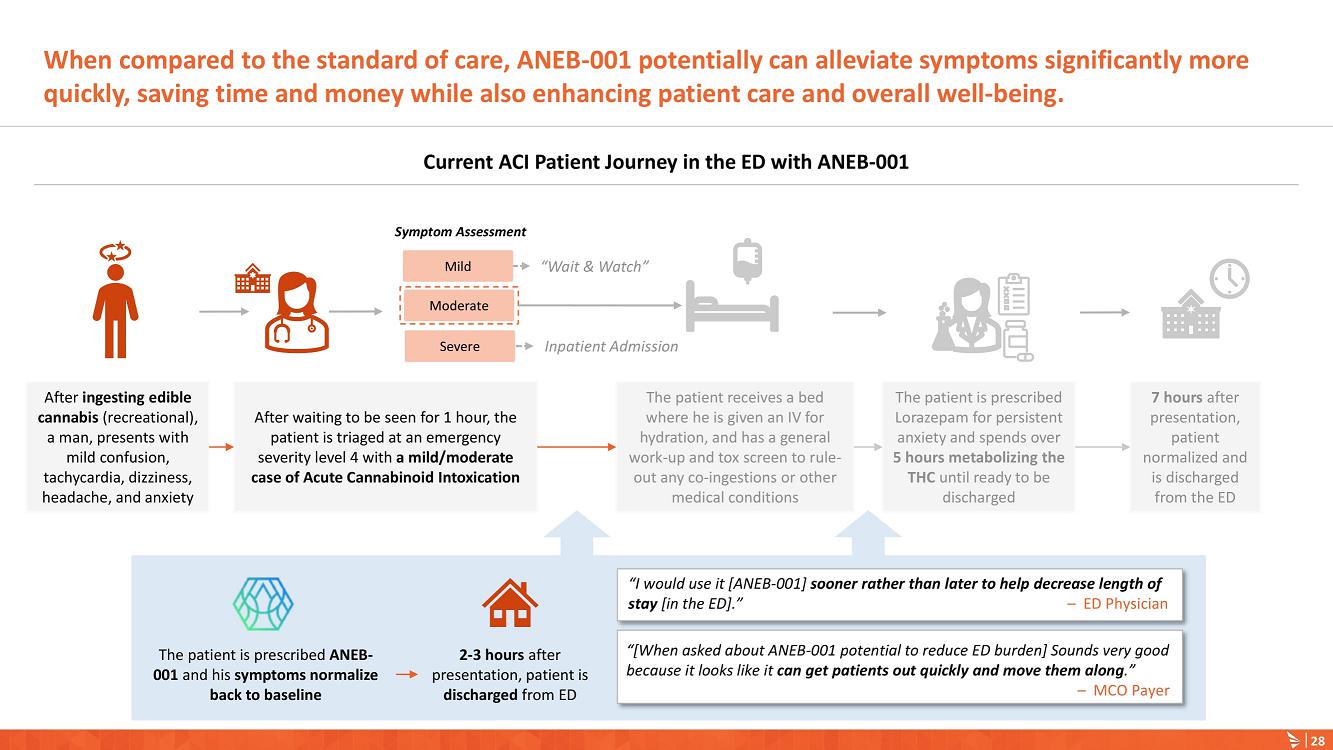 Our lead product candidate is ANEB-001, a potent, small molecule cannabinoid receptor antagonist, to address the unmet medical need for a specific antidote for ACI. ANEB-001 is an orally bioavailable, readily absorbed treatment candidate that we anticipate will rapidly reverse key symptoms of ACI. ANEB-001 is protected by one issued patent and rights to one patent application covering various methods of use of the compound and delivery systems. We began a Phase 2 proof-of-concept trial for ANEB-001 in December 2021 in the Netherlands and announced positive Phase 2 Part A proof-of-concept topline data on July 5, 2022, positive Part B data on September 26, 2022, and completed dosing of all subjects in mid-December 2022.