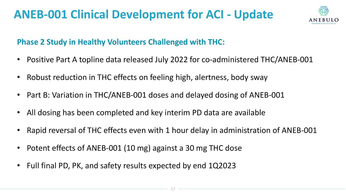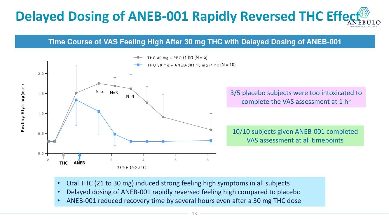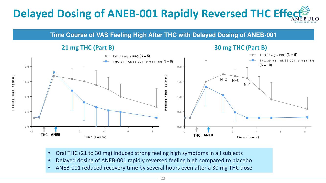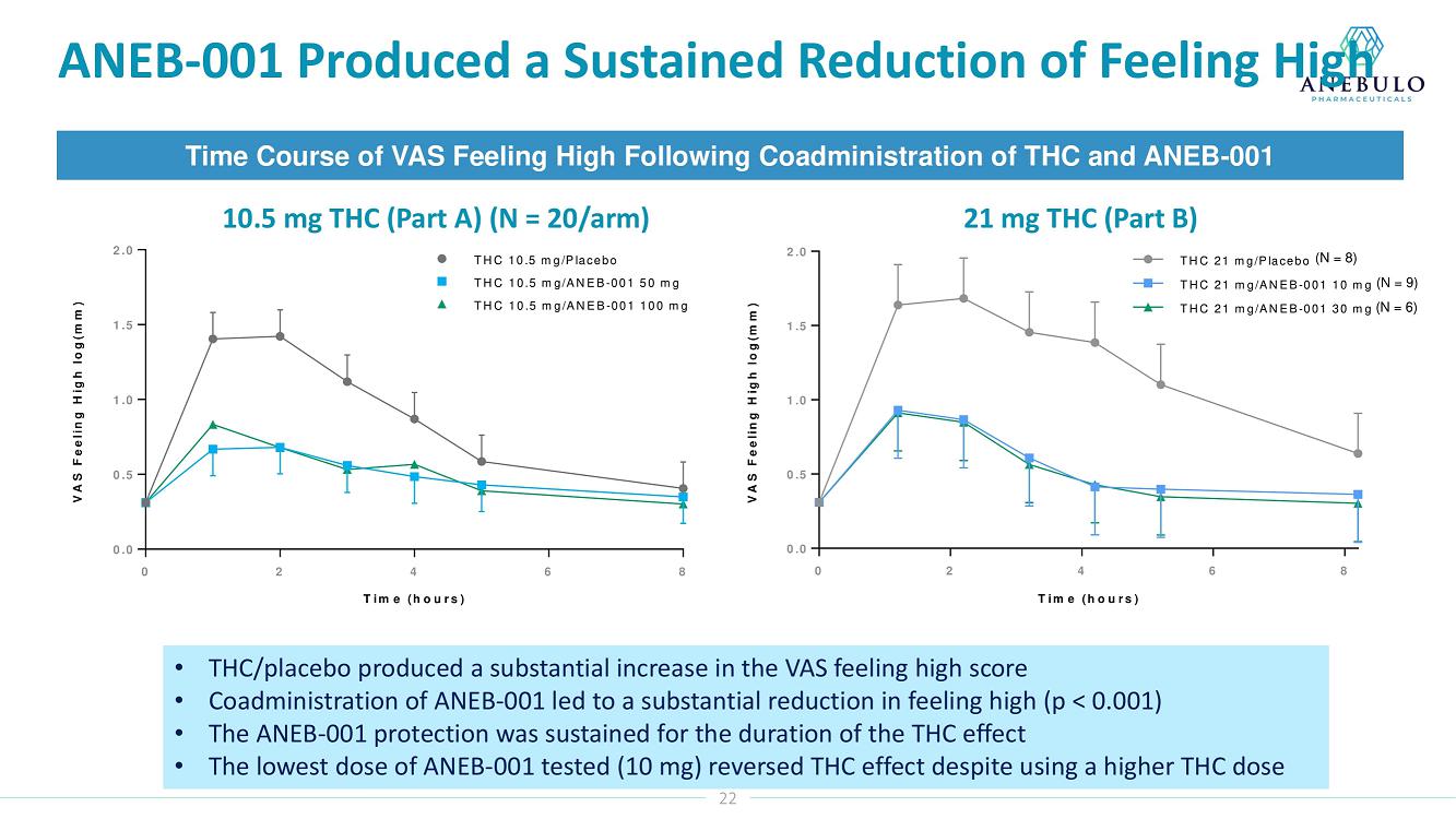 Based on preliminary pharmacodynamic data for Part B of the study, a single low oral dose of ANEB-001 (10 mg) administered 1 hour after THC appeared to rapidly reverse key psychotropic effects of THC doses as high as 30 mg, including reduction in feeling high and improvement in alertness and body sway. ANEB-001 also appeared to reduce the time required for effects to normalize back to baseline. Only 5 subjects were challenged with 40 mg THC due to poor THC tolerability. Final analyses await the unblinded data expected by end of 1Q2023.