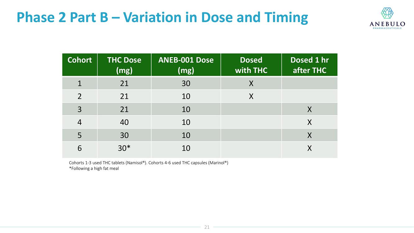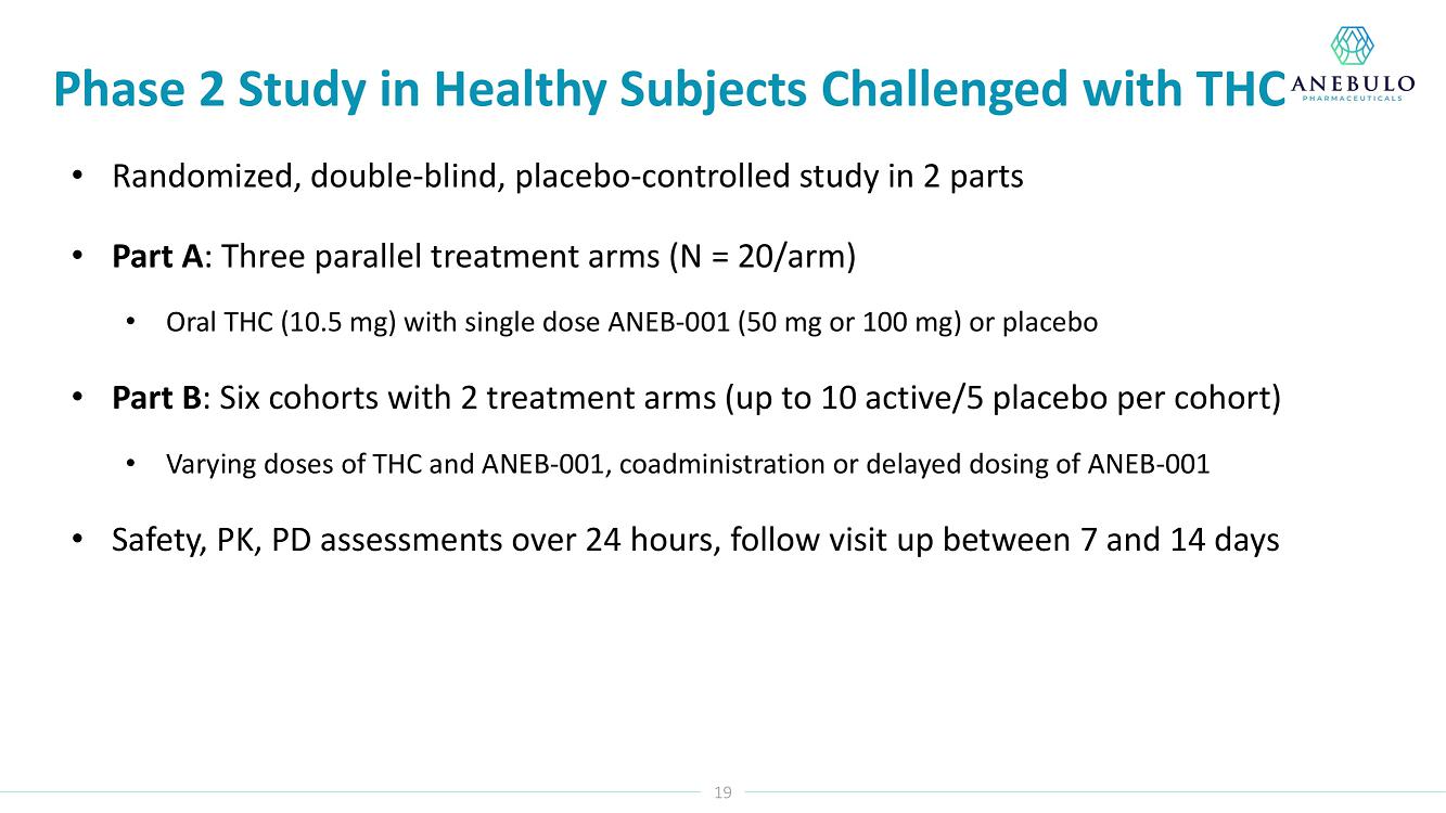 Data from Part A of the study showed positive protective effects of a single oral dose of 50 or 100 mg ANEB-001 when co-administered with an oral challenge dose of 10.5 mg THC. In Part B of the study, subjects were challenged with substantially higher oral doses of THC (21, 30 or 40 mg) and treated with lower doses of ANEB-001 (10 or 30 mg) or matching placebo. Delayed dosing of ANEB-001 was also examined by introducing a one-hour pause between the THC challenge and treatment with the ANEB-001 or placebo. The final cohort of the study included administration of a high fat meal prior to the THC challenge. Additional analyses await the final unblinded data.