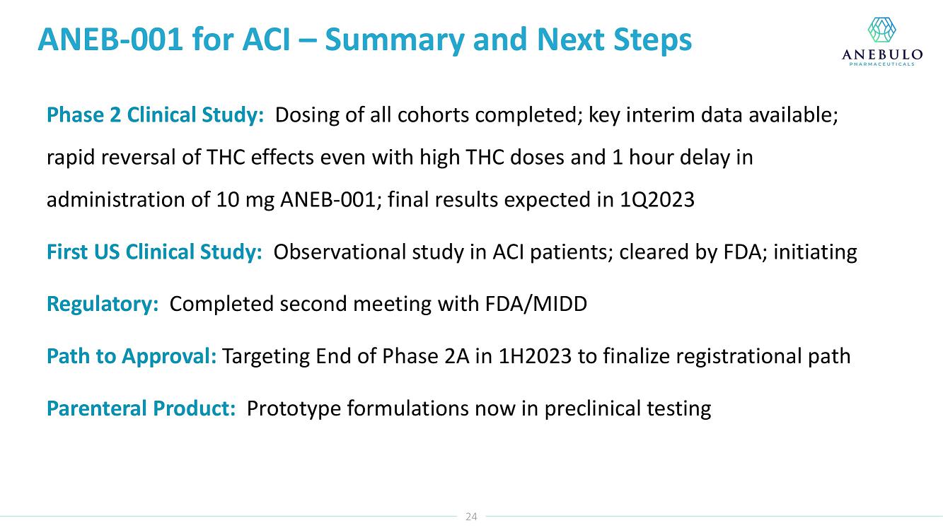 “Completing the dosing in this Phase 2 trial represents an important milestone for the company. Preliminary data showed that a single 10 mg dose of ANEB-001 reduced key symptoms of ACI induced with 30 mg of THC,” said Simon Allen, Chief Executive Officer of Anebulo. “Further, we successfully demonstrated rapid reversal of key ACI symptoms even after a one-hour delay between the THC challenge and ANEB-001 dosing. We believe the final data from this study, together with data from our planned observational study in ACI subjects, will provide support for the design of a registrational trial. We anticipate discussing the final data from this study with FDA at an End of Phase 2A meeting in the first half of this year.”