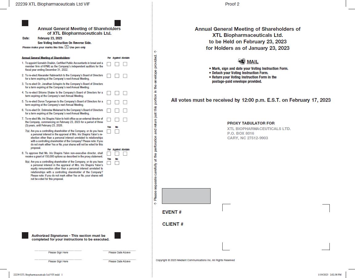 On January 20, 2023, XTL Biopharmaceuticals Ltd. (the “Company”) announced that it will hold an Annual General Meeting of Shareholders (the “Meeting”) on February 23, 2023, at the offices of the Company’s attorneys, Doron Tikotzky Kantor Gutman Nass & Amit Gross., 7 Metsada St., B.S.R Tower 4, 33 Floor, Bnei Brak, Israel. In connection with the Meeting, the Company furnishes the following documents: