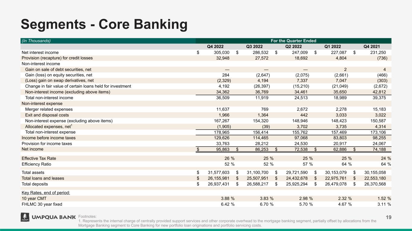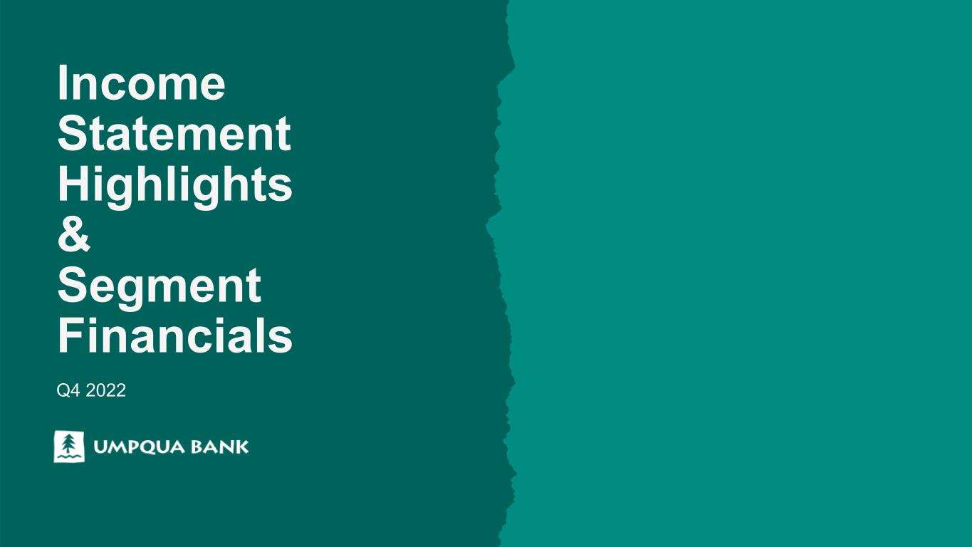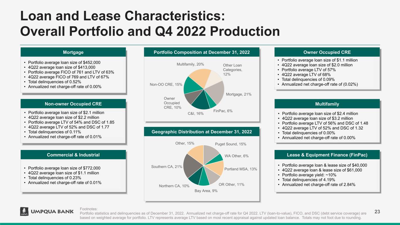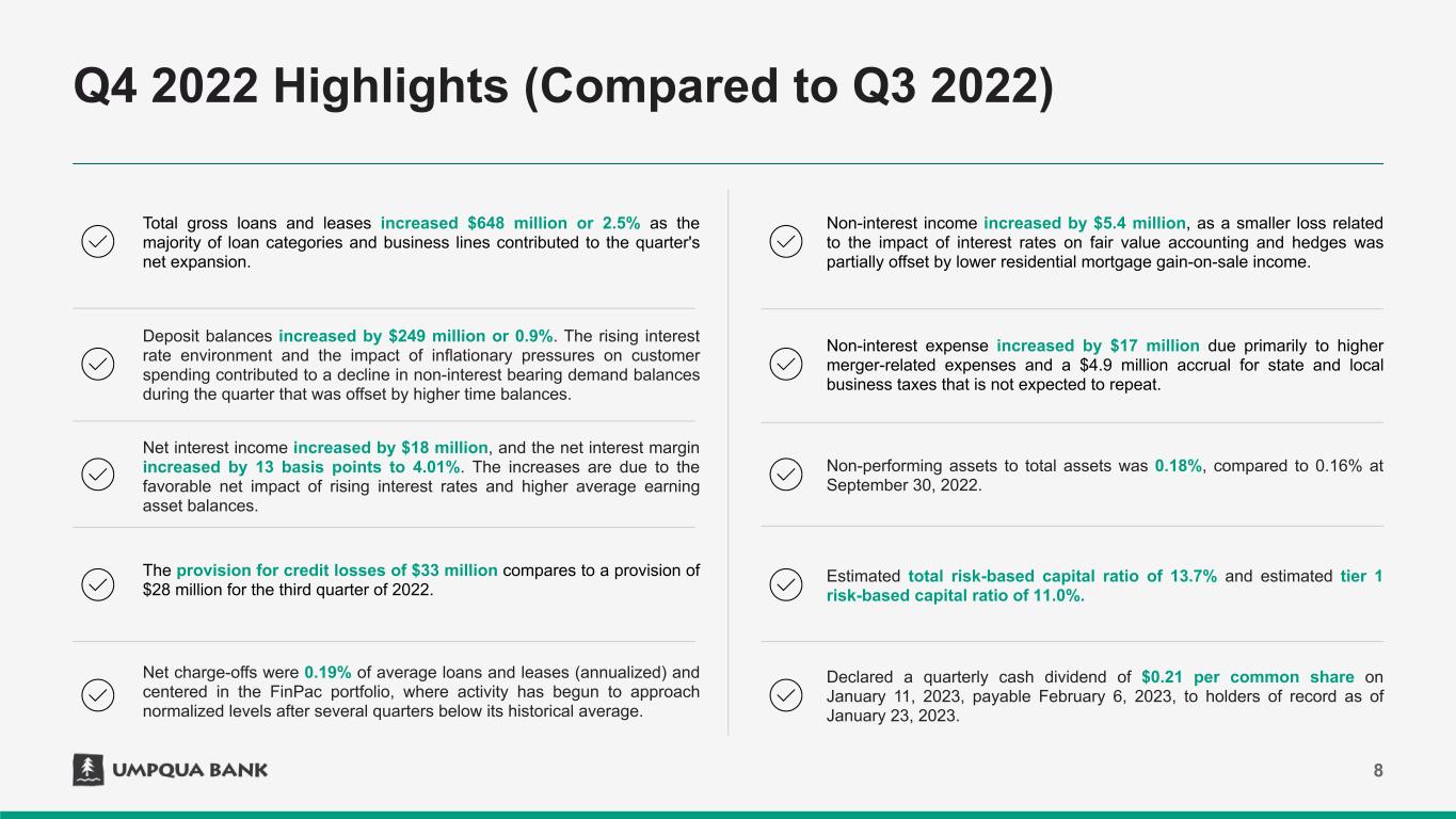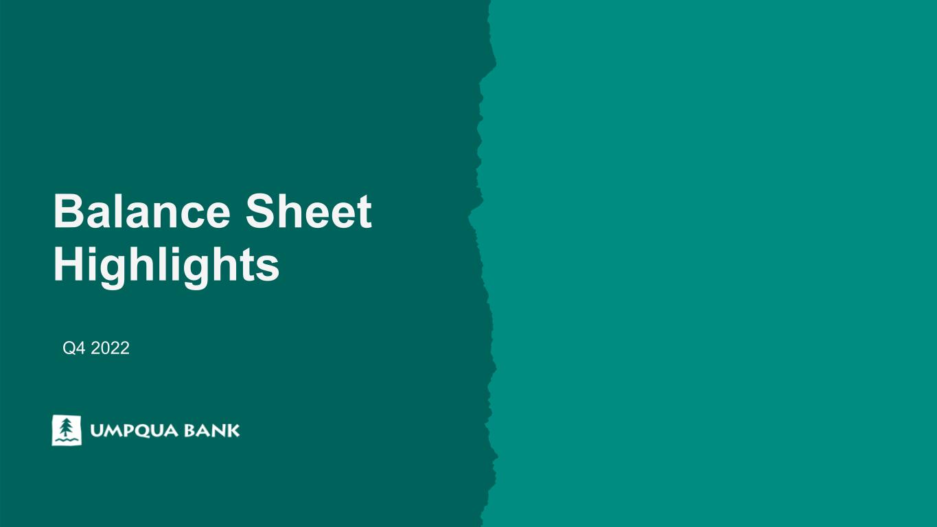 “Continued growth, outstanding credit quality, and net interest margin expansion again characterize Umpqua’s quarterly results and round out what has been an exceptional year for the bank,” said Cort O’Haver, President and CEO. “As we look forward to our upcoming merger with Columbia Banking System, which we expect to close on February 28, 2023, I want to thank our teams for their tireless efforts over the past 15 months. Umpqua associates' support of each other and dedicated focus on relationship banking with our customers and within our communities is evidenced by our ability to profitably grow the bank while simultaneously planning for our transformational combination with Columbia.” | ||