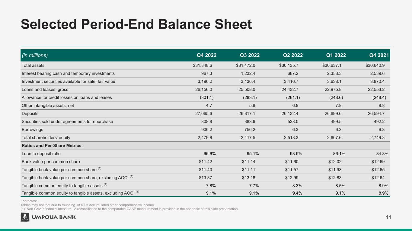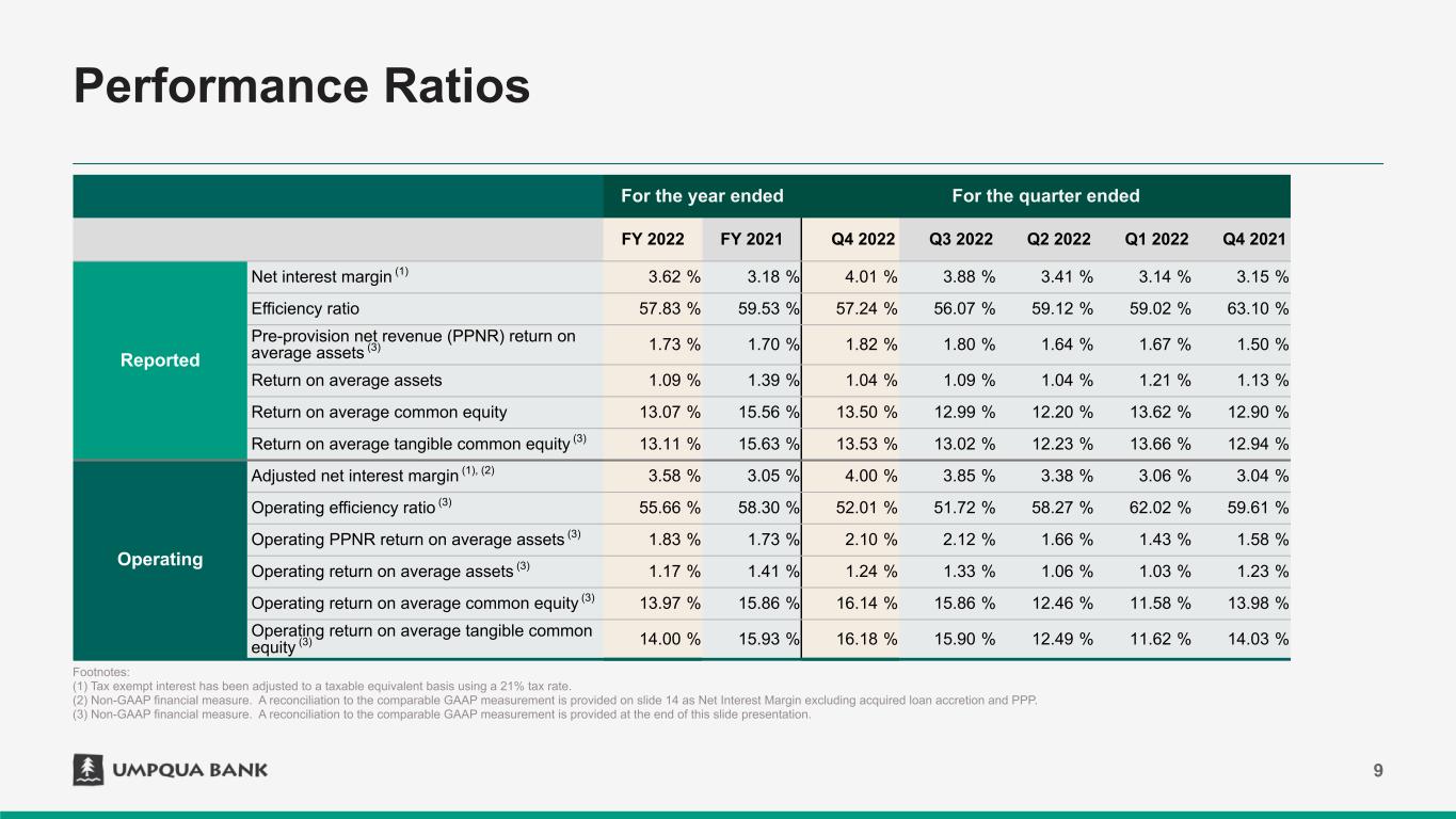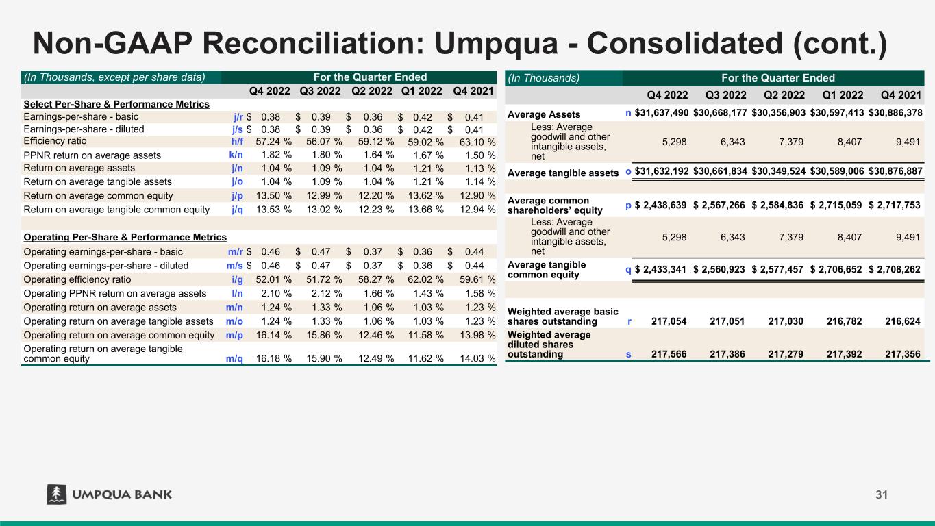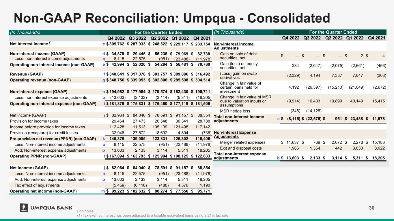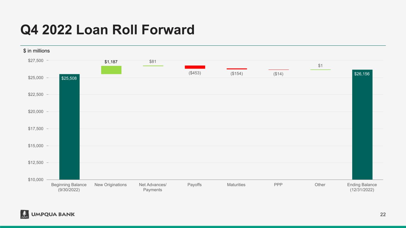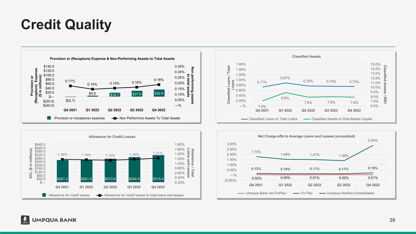 “Continued growth, outstanding credit quality, and net interest margin expansion again characterize Umpqua’s quarterly results and round out what has been an exceptional year for the bank,” said Cort O’Haver, President and CEO. “As we look forward to our upcoming merger with Columbia Banking System, which we expect to close on February 28, 2023, I want to thank our teams for their tireless efforts over the past 15 months. Umpqua associates' support of each other and dedicated focus on relationship banking with our customers and within our communities is evidenced by our ability to profitably grow the bank while simultaneously planning for our transformational combination with Columbia.” | ||