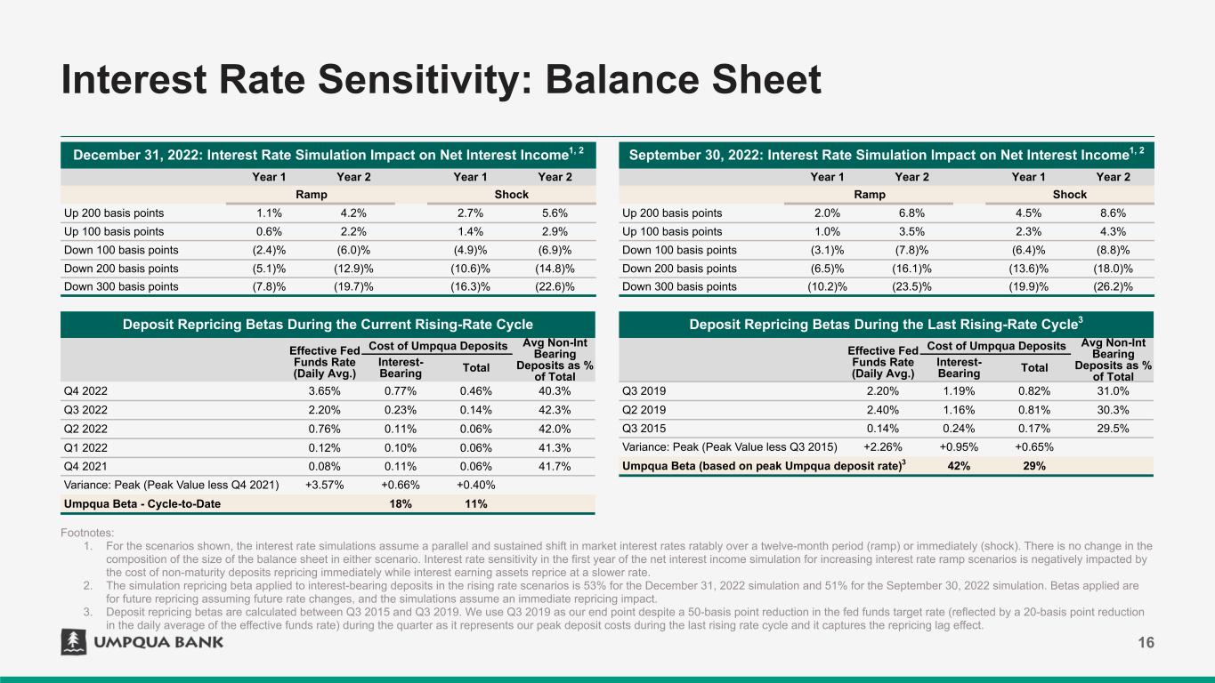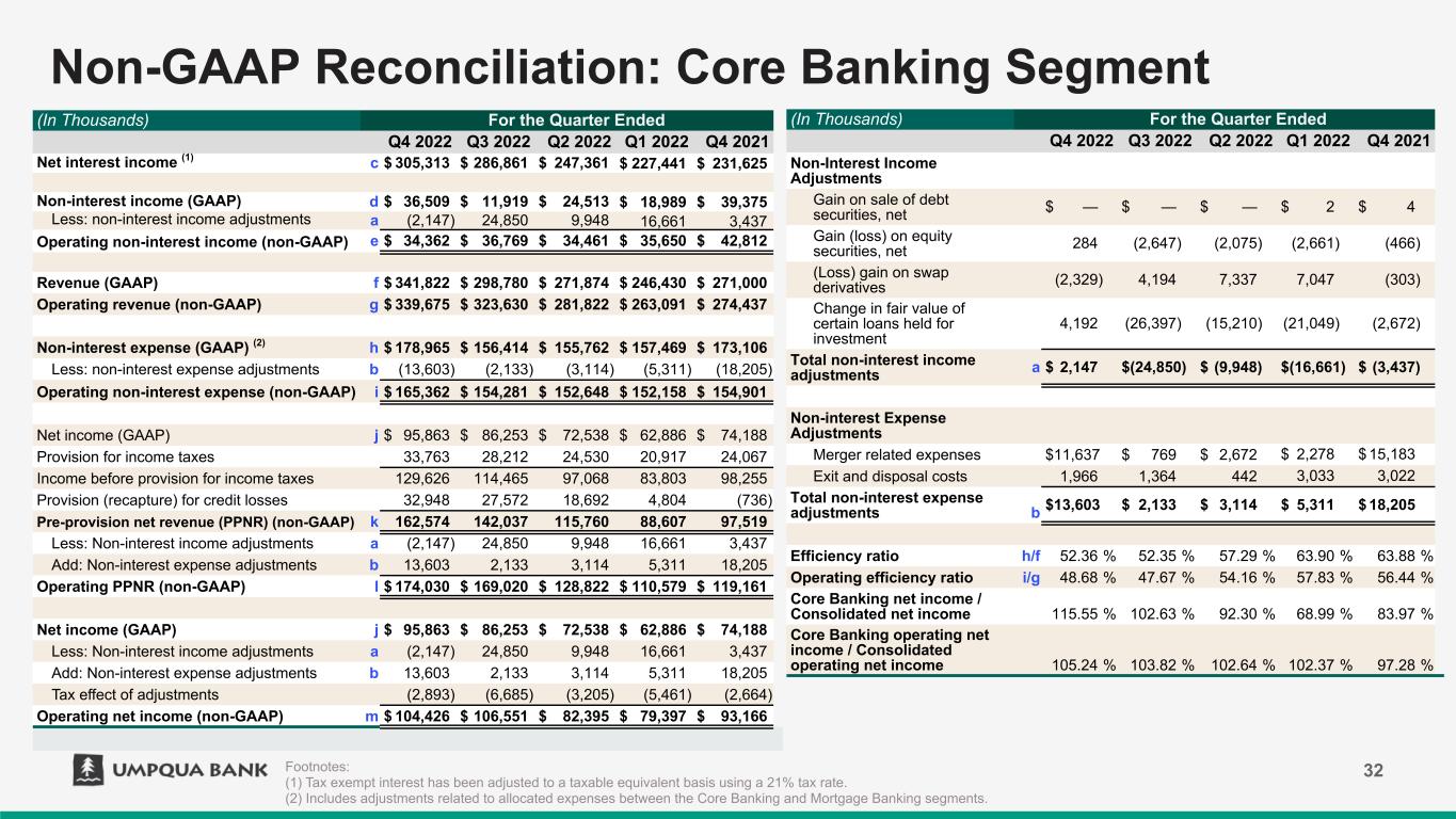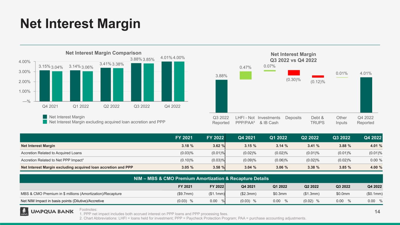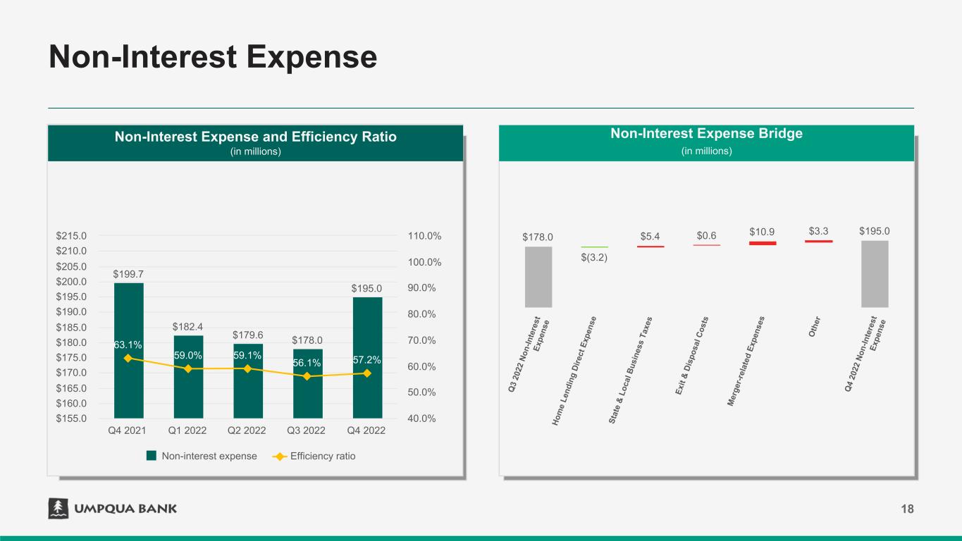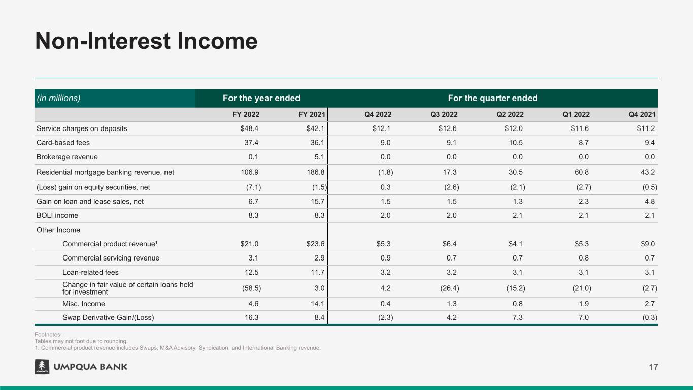 “Continued growth, outstanding credit quality, and net interest margin expansion again characterize Umpqua’s quarterly results and round out what has been an exceptional year for the bank,” said Cort O’Haver, President and CEO. “As we look forward to our upcoming merger with Columbia Banking System, which we expect to close on February 28, 2023, I want to thank our teams for their tireless efforts over the past 15 months. Umpqua associates' support of each other and dedicated focus on relationship banking with our customers and within our communities is evidenced by our ability to profitably grow the bank while simultaneously planning for our transformational combination with Columbia.” | ||