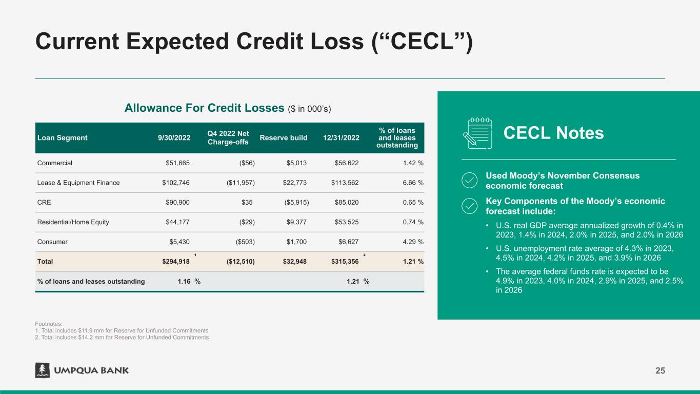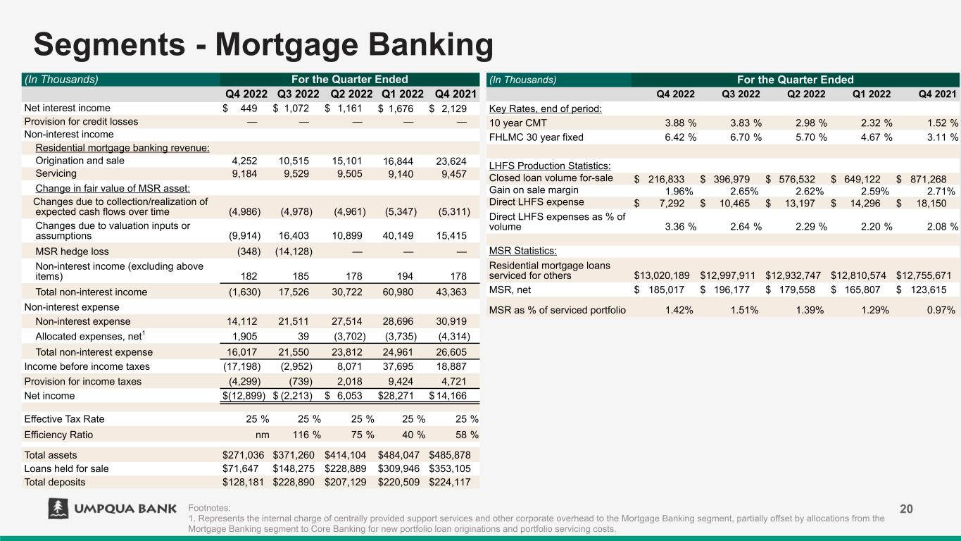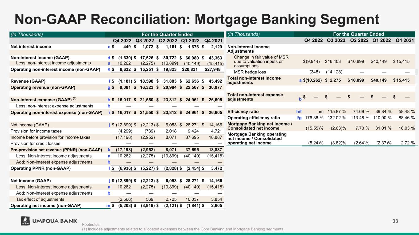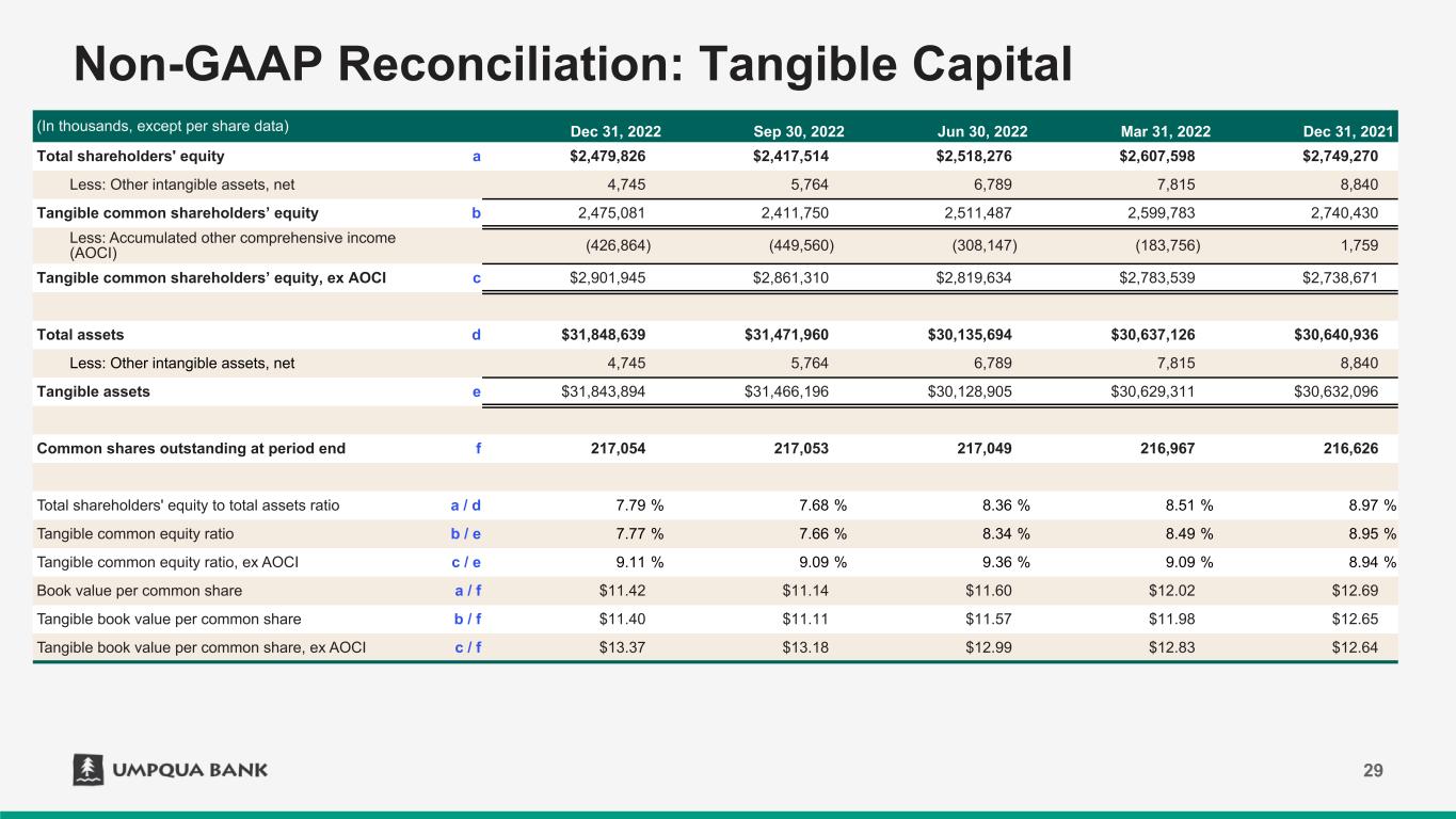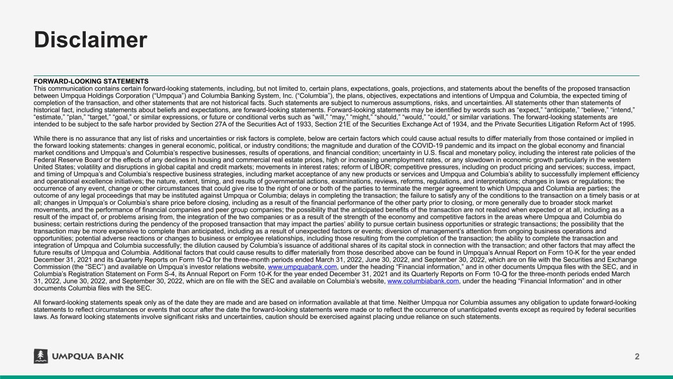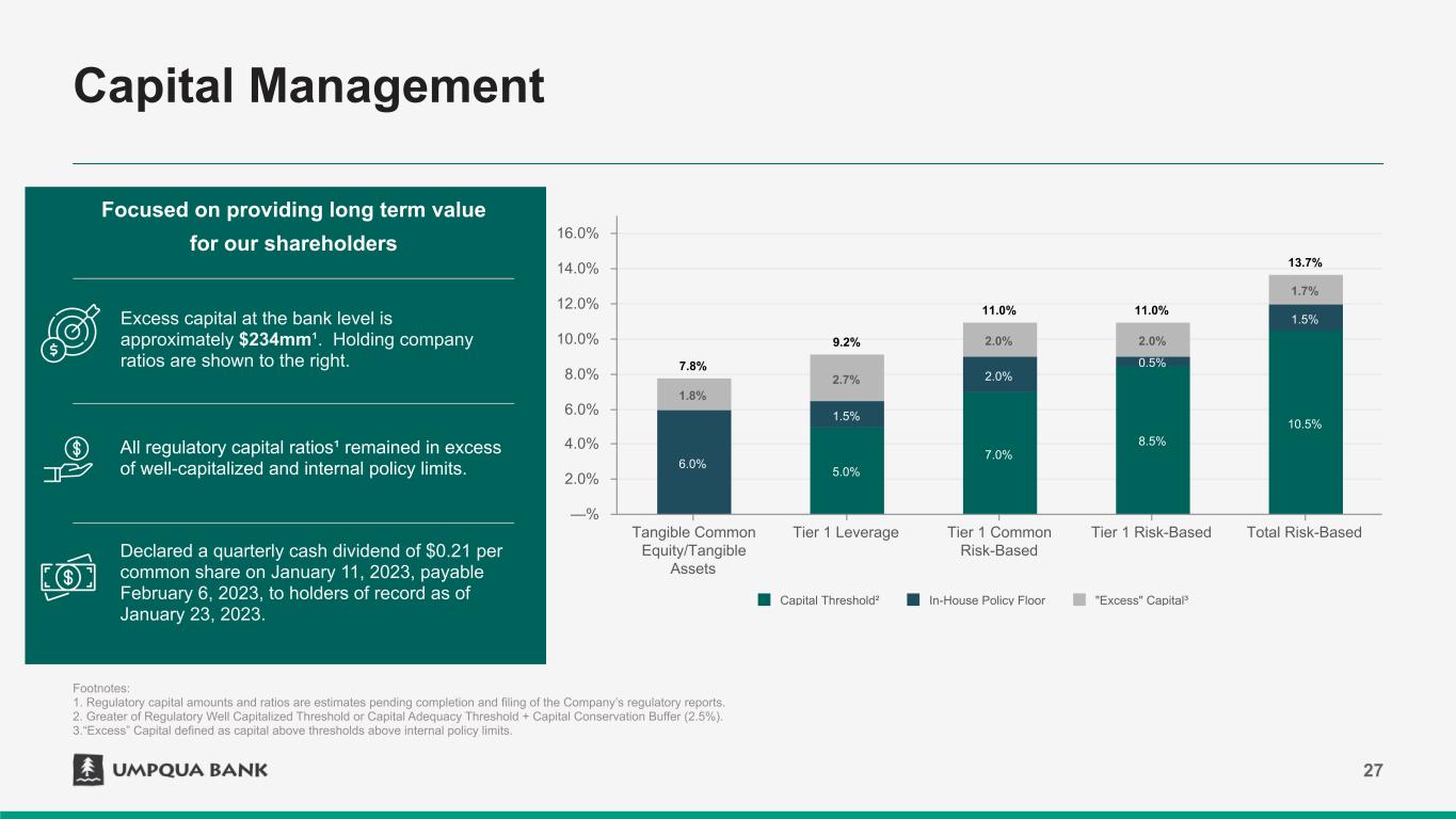“Continued growth, outstanding credit quality, and net interest margin expansion again characterize Umpqua’s quarterly results and round out what has been an exceptional year for the bank,” said Cort O’Haver, President and CEO. “As we look forward to our upcoming merger with Columbia Banking System, which we expect to close on February 28, 2023, I want to thank our teams for their tireless efforts over the past 15 months. Umpqua associates' support of each other and dedicated focus on relationship banking with our customers and within our communities is evidenced by our ability to profitably grow the bank while simultaneously planning for our transformational combination with Columbia.” | ||