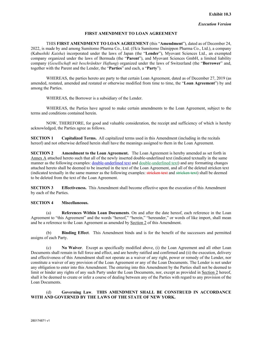 280174871 v1 Exhibit 10.3 Execution Version FIRST AMENDMENT TO LOAN AGREEMENT THIS FIRST AMENDMENT TO LOAN AGREEMENT (this “Amendment”), dated as of December 24, 2022, is made by and among Sumitomo Pharma Co., Ltd. (f/k/a Sumitomo Dainippon Pharma Co., Ltd.), a company (Kabushiki Kaisha) incorporated under the laws of Japan (the “Lender”), Myovant Sciences Ltd., an exempted company organized under the laws of Bermuda (the “Parent”), and Myovant Sciences GmbH, a limited liability company (Gesellschaft mit beschränkter Haftung) organized under the laws of Switzerland (the “Borrower” and, together with the Parent and the Lender, the “Parties” and each, a “Party”). WHEREAS, the parties hereto are party to that certain Loan Agreement, dated as of December 27, 2019 (as amended, restated, amended and restated or otherwise modified from time to time, the “Loan Agreement”) by and among the Parties. WHEREAS, the Borrower is a subsidiary of the Lender. WHEREAS, the Parties have agreed to make certain amendments to the Loan Agreement, subject to the terms and conditions contained herein. NOW, THEREFORE, for good and valuable consideration, the receipt and sufficiency of which is hereby acknowledged, the Parties agree as follows. SECTION 1 Capitalized Terms. All capitalized terms used in this Amendment (including in the recitals hereof) and not otherwise defined herein shall have the meanings assigned to them in the Loan Agreement. SECTION 2 Amendment to the Loan Agreement. The Loan Agreement is hereby amended as set forth in Annex A attached hereto such that all of the newly inserted double-underlined text (indicated textually in the same manner as the following examples: double-underlined text and double-underlined text) and any formatting changes attached hereto shall be deemed to be inserted in the text of the Loan Agreement, and all of the deleted stricken text (indicated textually in the same manner as the following examples: stricken text and stricken text) shall be deemed to be deleted from the text of the Loan Agreement. SECTION 3 Effectiveness. This Amendment shall become effective upon the execution of this Amendment by each of the Parties. SECTION 4 Miscellaneous. (a) References Within Loan Documents. On and after the date hereof, each reference in the Loan Agreement to “this Agreement” and the words “hereof,” “herein,” “hereunder,” or words of like import, shall mean and be a reference to the Loan Agreement as amended by Section 2 of this Amendment. (b) Binding Effect. This Amendment binds and is for the benefit of the successors and permitted assigns of each Party. (c) No Waiver. Except as specifically modified above, (i) the Loan Agreement and all other Loan Documents shall remain in full force and effect, and are hereby ratified and confirmed and (ii) the execution, delivery and effectiveness of this Amendment shall not operate as a waiver of any right, power or remedy of the Lender, nor constitute a waiver of any provision of the Loan Agreement or any of the Loan Documents. The Lender is not under any obligation to enter into this Amendment. The entering into this Amendment by the Parties shall not be deemed to limit or hinder any rights of any such Party under the Loan Documents, nor, except as provided in Section 2 hereof, shall it be deemed to create or infer a course of dealing between any of the Parties with regard to any provision of the Loan Documents. (d) Governing Law. THIS AMENDMENT SHALL BE CONSTRUED IN ACCORDANCE WITH AND GOVERNED BY THE LAWS OF THE STATE OF NEW YORK.