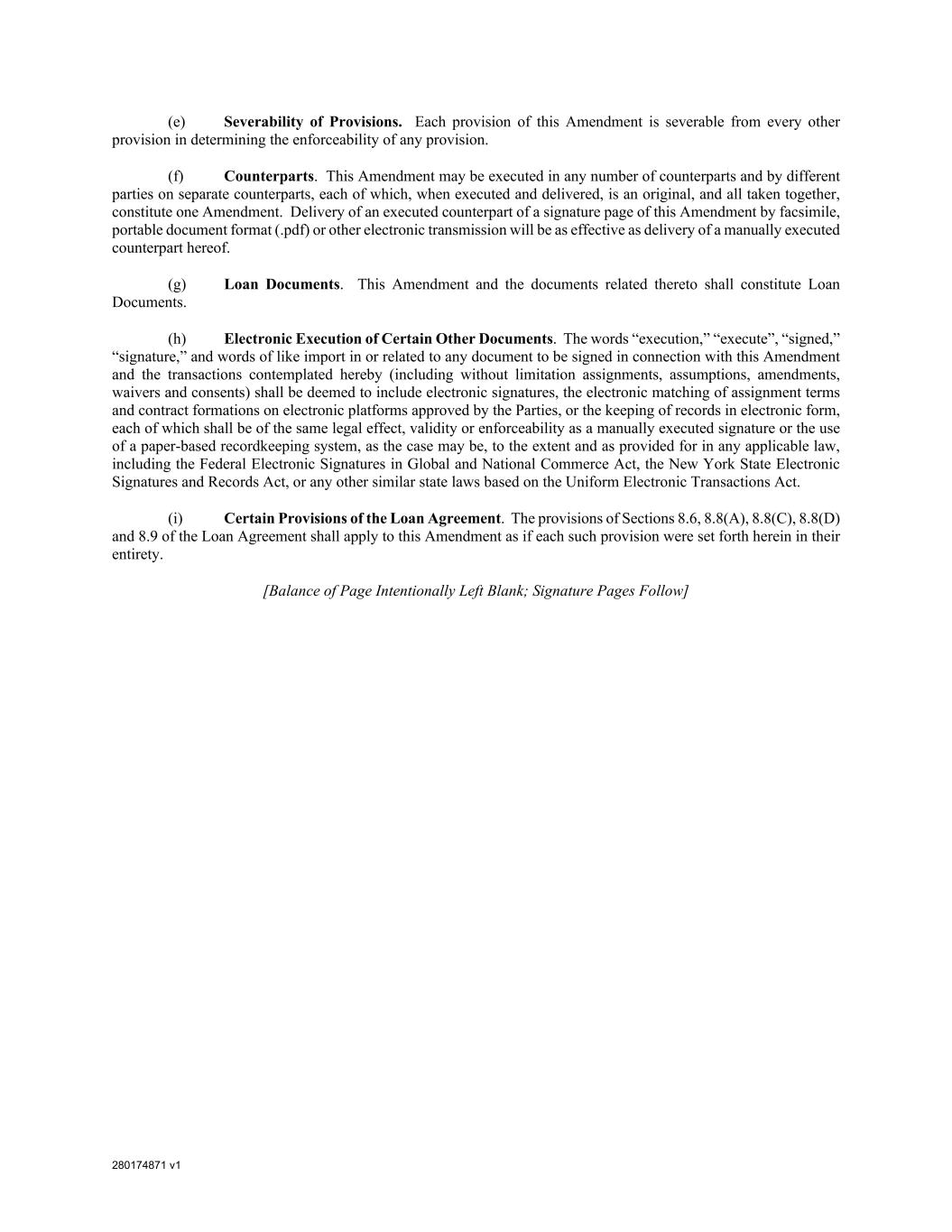 280174871 v1 (e) Severability of Provisions. Each provision of this Amendment is severable from every other provision in determining the enforceability of any provision. (f) Counterparts. This Amendment may be executed in any number of counterparts and by different parties on separate counterparts, each of which, when executed and delivered, is an original, and all taken together, constitute one Amendment. Delivery of an executed counterpart of a signature page of this Amendment by facsimile, portable document format (.pdf) or other electronic transmission will be as effective as delivery of a manually executed counterpart hereof. (g) Loan Documents. This Amendment and the documents related thereto shall constitute Loan Documents. (h) Electronic Execution of Certain Other Documents. The words “execution,” “execute”, “signed,” “signature,” and words of like import in or related to any document to be signed in connection with this Amendment and the transactions contemplated hereby (including without limitation assignments, assumptions, amendments, waivers and consents) shall be deemed to include electronic signatures, the electronic matching of assignment terms and contract formations on electronic platforms approved by the Parties, or the keeping of records in electronic form, each of which shall be of the same legal effect, validity or enforceability as a manually executed signature or the use of a paper-based recordkeeping system, as the case may be, to the extent and as provided for in any applicable law, including the Federal Electronic Signatures in Global and National Commerce Act, the New York State Electronic Signatures and Records Act, or any other similar state laws based on the Uniform Electronic Transactions Act. (i) Certain Provisions of the Loan Agreement. The provisions of Sections 8.6, 8.8(A), 8.8(C), 8.8(D) and 8.9 of the Loan Agreement shall apply to this Amendment as if each such provision were set forth herein in their entirety. [Balance of Page Intentionally Left Blank; Signature Pages Follow]