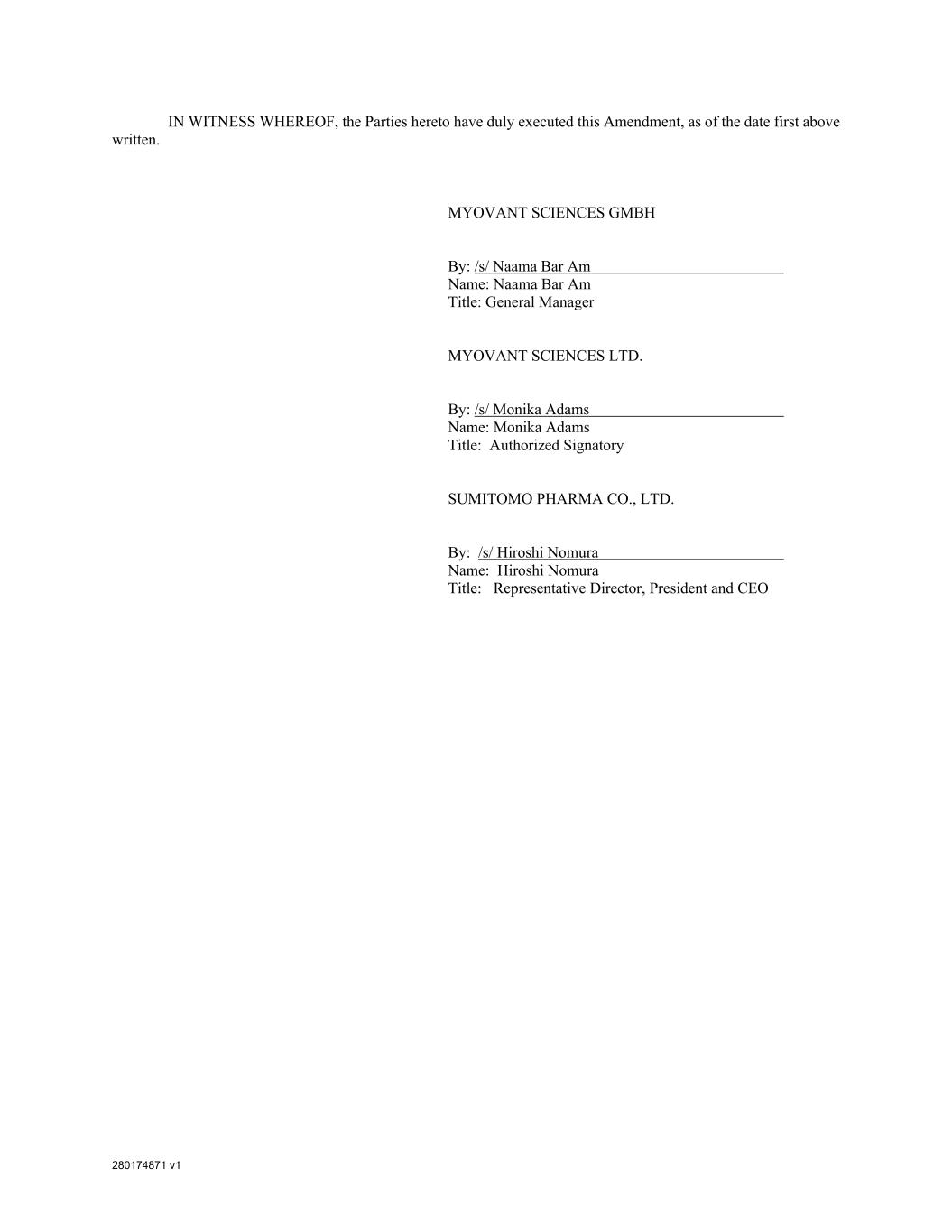280174871 v1 IN WITNESS WHEREOF, the Parties hereto have duly executed this Amendment, as of the date first above written. MYOVANT SCIENCES GMBH By: /s/ Naama Bar Am Name: Naama Bar Am Title: General Manager MYOVANT SCIENCES LTD. By: /s/ Monika Adams Name: Monika Adams Title: Authorized Signatory SUMITOMO PHARMA CO., LTD. By: /s/ Hiroshi Nomura Name: Hiroshi Nomura Title: Representative Director, President and CEO