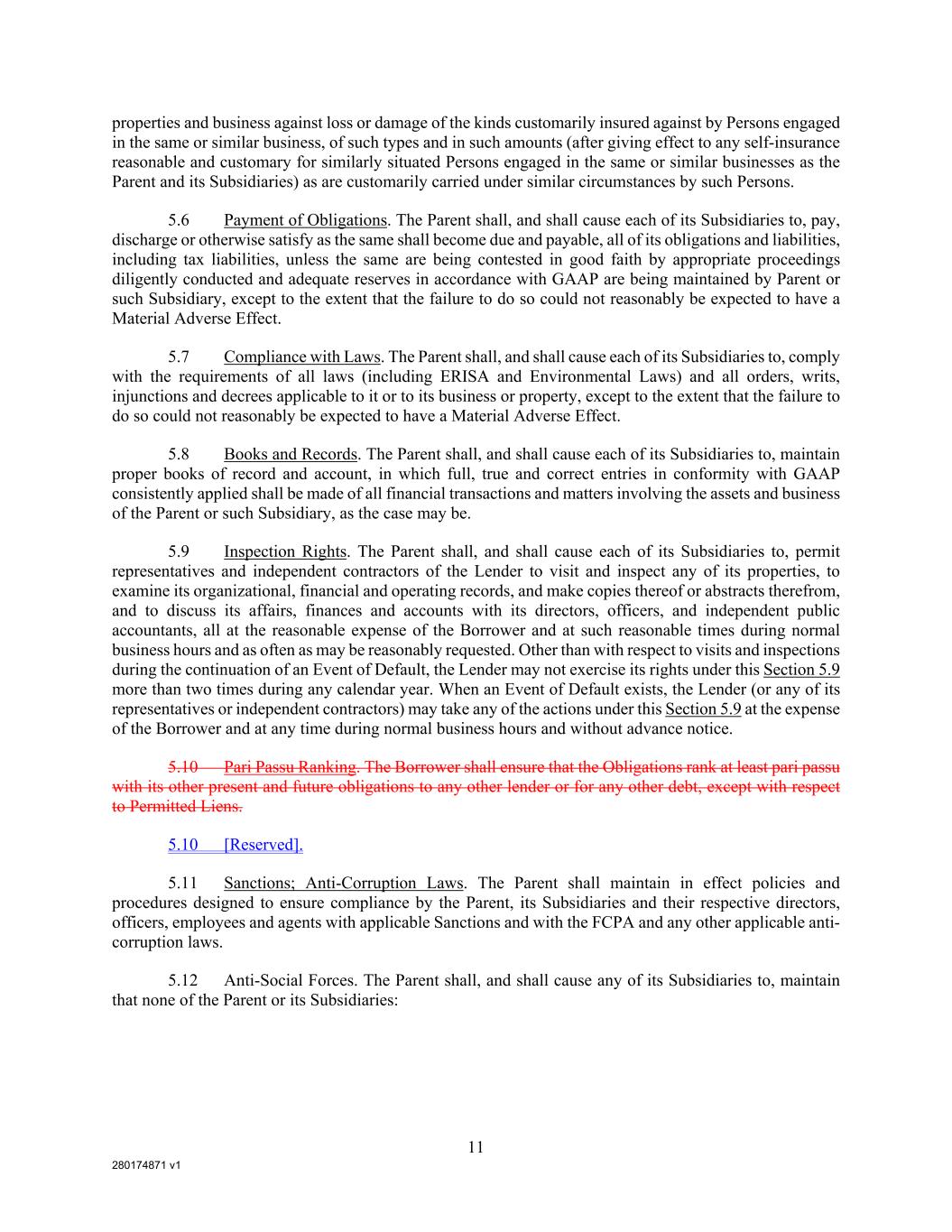 280174871 v1 11 properties and business against loss or damage of the kinds customarily insured against by Persons engaged in the same or similar business, of such types and in such amounts (after giving effect to any self-insurance reasonable and customary for similarly situated Persons engaged in the same or similar businesses as the Parent and its Subsidiaries) as are customarily carried under similar circumstances by such Persons. 5.6 Payment of Obligations. The Parent shall, and shall cause each of its Subsidiaries to, pay, discharge or otherwise satisfy as the same shall become due and payable, all of its obligations and liabilities, including tax liabilities, unless the same are being contested in good faith by appropriate proceedings diligently conducted and adequate reserves in accordance with GAAP are being maintained by Parent or such Subsidiary, except to the extent that the failure to do so could not reasonably be expected to have a Material Adverse Effect. 5.7 Compliance with Laws. The Parent shall, and shall cause each of its Subsidiaries to, comply with the requirements of all laws (including ERISA and Environmental Laws) and all orders, writs, injunctions and decrees applicable to it or to its business or property, except to the extent that the failure to do so could not reasonably be expected to have a Material Adverse Effect. 5.8 Books and Records. The Parent shall, and shall cause each of its Subsidiaries to, maintain proper books of record and account, in which full, true and correct entries in conformity with GAAP consistently applied shall be made of all financial transactions and matters involving the assets and business of the Parent or such Subsidiary, as the case may be. 5.9 Inspection Rights. The Parent shall, and shall cause each of its Subsidiaries to, permit representatives and independent contractors of the Lender to visit and inspect any of its properties, to examine its organizational, financial and operating records, and make copies thereof or abstracts therefrom, and to discuss its affairs, finances and accounts with its directors, officers, and independent public accountants, all at the reasonable expense of the Borrower and at such reasonable times during normal business hours and as often as may be reasonably requested. Other than with respect to visits and inspections during the continuation of an Event of Default, the Lender may not exercise its rights under this Section 5.9 more than two times during any calendar year. When an Event of Default exists, the Lender (or any of its representatives or independent contractors) may take any of the actions under this Section 5.9 at the expense of the Borrower and at any time during normal business hours and without advance notice. 5.10 Pari Passu Ranking. The Borrower shall ensure that the Obligations rank at least pari passu with its other present and future obligations to any other lender or for any other debt, except with respect to Permitted Liens. 5.10 [Reserved]. 5.11 Sanctions; Anti-Corruption Laws. The Parent shall maintain in effect policies and procedures designed to ensure compliance by the Parent, its Subsidiaries and their respective directors, officers, employees and agents with applicable Sanctions and with the FCPA and any other applicable anti- corruption laws. 5.12 Anti-Social Forces. The Parent shall, and shall cause any of its Subsidiaries to, maintain that none of the Parent or its Subsidiaries: