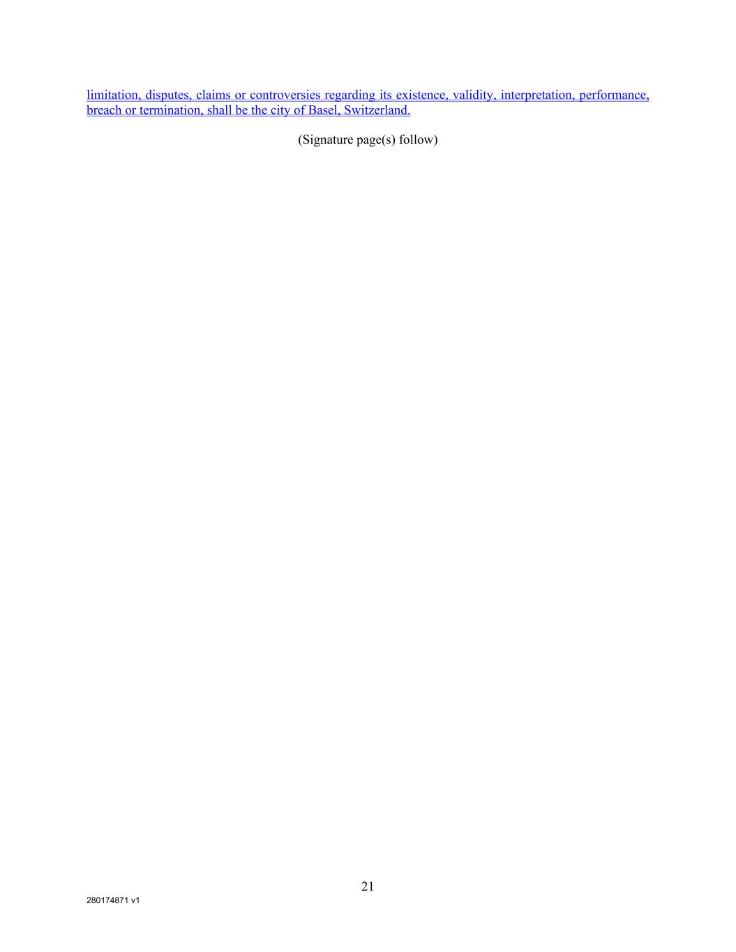 280174871 v1 21 limitation, disputes, claims or controversies regarding its existence, validity, interpretation, performance, breach or termination, shall be the city of Basel, Switzerland. (Signature page(s) follow)