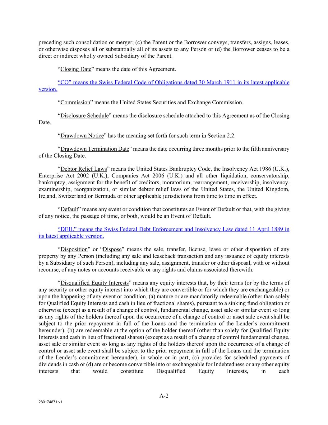 280174871 v1 A-2 preceding such consolidation or merger; (c) the Parent or the Borrower conveys, transfers, assigns, leases, or otherwise disposes all or substantially all of its assets to any Person or (d) the Borrower ceases to be a direct or indirect wholly owned Subsidiary of the Parent. “Closing Date” means the date of this Agreement. “CO” means the Swiss Federal Code of Obligations dated 30 March 1911 in its latest applicable version. “Commission” means the United States Securities and Exchange Commission. “Disclosure Schedule” means the disclosure schedule attached to this Agreement as of the Closing Date. “Drawdown Notice” has the meaning set forth for such term in Section 2.2. “Drawdown Termination Date” means the date occurring three months prior to the fifth anniversary of the Closing Date. “Debtor Relief Laws” means the United States Bankruptcy Code, the Insolvency Act 1986 (U.K.), Enterprise Act 2002 (U.K.), Companies Act 2006 (U.K.) and all other liquidation, conservatorship, bankruptcy, assignment for the benefit of creditors, moratorium, rearrangement, receivership, insolvency, examinership, reorganization, or similar debtor relief laws of the United States, the United Kingdom, Ireland, Switzerland or Bermuda or other applicable jurisdictions from time to time in effect. “Default” means any event or condition that constitutes an Event of Default or that, with the giving of any notice, the passage of time, or both, would be an Event of Default. “DEIL” means the Swiss Federal Debt Enforcement and Insolvency Law dated 11 April 1889 in its latest applicable version. “Disposition” or “Dispose” means the sale, transfer, license, lease or other disposition of any property by any Person (including any sale and leaseback transaction and any issuance of equity interests by a Subsidiary of such Person), including any sale, assignment, transfer or other disposal, with or without recourse, of any notes or accounts receivable or any rights and claims associated therewith. “Disqualified Equity Interests” means any equity interests that, by their terms (or by the terms of any security or other equity interest into which they are convertible or for which they are exchangeable) or upon the happening of any event or condition, (a) mature or are mandatorily redeemable (other than solely for Qualified Equity Interests and cash in lieu of fractional shares), pursuant to a sinking fund obligation or otherwise (except as a result of a change of control, fundamental change, asset sale or similar event so long as any rights of the holders thereof upon the occurrence of a change of control or asset sale event shall be subject to the prior repayment in full of the Loans and the termination of the Lender’s commitment hereunder), (b) are redeemable at the option of the holder thereof (other than solely for Qualified Equity Interests and cash in lieu of fractional shares) (except as a result of a change of control fundamental change, asset sale or similar event so long as any rights of the holders thereof upon the occurrence of a change of control or asset sale event shall be subject to the prior repayment in full of the Loans and the termination of the Lender’s commitment hereunder), in whole or in part, (c) provides for scheduled payments of dividends in cash or (d) are or become convertible into or exchangeable for Indebtedness or any other equity interests that would constitute Disqualified Equity Interests, in each
