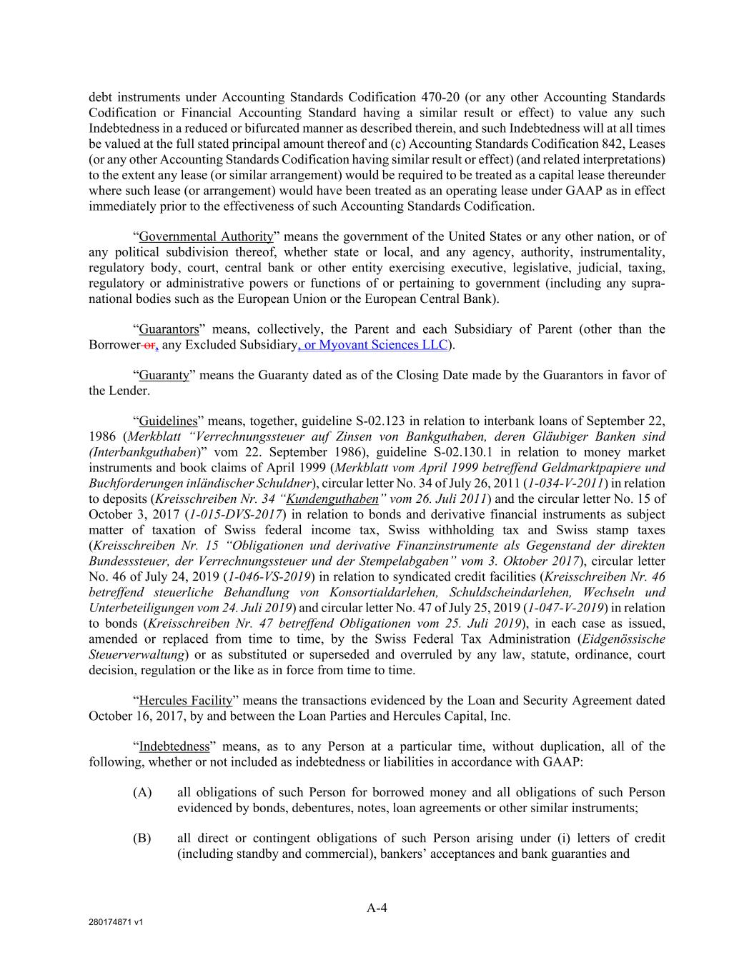 280174871 v1 A-4 debt instruments under Accounting Standards Codification 470-20 (or any other Accounting Standards Codification or Financial Accounting Standard having a similar result or effect) to value any such Indebtedness in a reduced or bifurcated manner as described therein, and such Indebtedness will at all times be valued at the full stated principal amount thereof and (c) Accounting Standards Codification 842, Leases (or any other Accounting Standards Codification having similar result or effect) (and related interpretations) to the extent any lease (or similar arrangement) would be required to be treated as a capital lease thereunder where such lease (or arrangement) would have been treated as an operating lease under GAAP as in effect immediately prior to the effectiveness of such Accounting Standards Codification. “Governmental Authority” means the government of the United States or any other nation, or of any political subdivision thereof, whether state or local, and any agency, authority, instrumentality, regulatory body, court, central bank or other entity exercising executive, legislative, judicial, taxing, regulatory or administrative powers or functions of or pertaining to government (including any supra- national bodies such as the European Union or the European Central Bank). “Guarantors” means, collectively, the Parent and each Subsidiary of Parent (other than the Borrower or, any Excluded Subsidiary, or Myovant Sciences LLC). “Guaranty” means the Guaranty dated as of the Closing Date made by the Guarantors in favor of the Lender. “Guidelines” means, together, guideline S-02.123 in relation to interbank loans of September 22, 1986 (Merkblatt “Verrechnungssteuer auf Zinsen von Bankguthaben, deren Gläubiger Banken sind (Interbankguthaben)” vom 22. September 1986), guideline S-02.130.1 in relation to money market instruments and book claims of April 1999 (Merkblatt vom April 1999 betreffend Geldmarktpapiere und Buchforderungen inländischer Schuldner), circular letter No. 34 of July 26, 2011 (1-034-V-2011) in relation to deposits (Kreisschreiben Nr. 34 “Kundenguthaben” vom 26. Juli 2011) and the circular letter No. 15 of October 3, 2017 (1-015-DVS-2017) in relation to bonds and derivative financial instruments as subject matter of taxation of Swiss federal income tax, Swiss withholding tax and Swiss stamp taxes (Kreisschreiben Nr. 15 “Obligationen und derivative Finanzinstrumente als Gegenstand der direkten Bundesssteuer, der Verrechnungssteuer und der Stempelabgaben” vom 3. Oktober 2017), circular letter No. 46 of July 24, 2019 (1-046-VS-2019) in relation to syndicated credit facilities (Kreisschreiben Nr. 46 betreffend steuerliche Behandlung von Konsortialdarlehen, Schuldscheindarlehen, Wechseln und Unterbeteiligungen vom 24. Juli 2019) and circular letter No. 47 of July 25, 2019 (1-047-V-2019) in relation to bonds (Kreisschreiben Nr. 47 betreffend Obligationen vom 25. Juli 2019), in each case as issued, amended or replaced from time to time, by the Swiss Federal Tax Administration (Eidgenössische Steuerverwaltung) or as substituted or superseded and overruled by any law, statute, ordinance, court decision, regulation or the like as in force from time to time. “Hercules Facility” means the transactions evidenced by the Loan and Security Agreement dated October 16, 2017, by and between the Loan Parties and Hercules Capital, Inc. “Indebtedness” means, as to any Person at a particular time, without duplication, all of the following, whether or not included as indebtedness or liabilities in accordance with GAAP: (A) all obligations of such Person for borrowed money and all obligations of such Person evidenced by bonds, debentures, notes, loan agreements or other similar instruments; (B) all direct or contingent obligations of such Person arising under (i) letters of credit (including standby and commercial), bankers’ acceptances and bank guaranties and