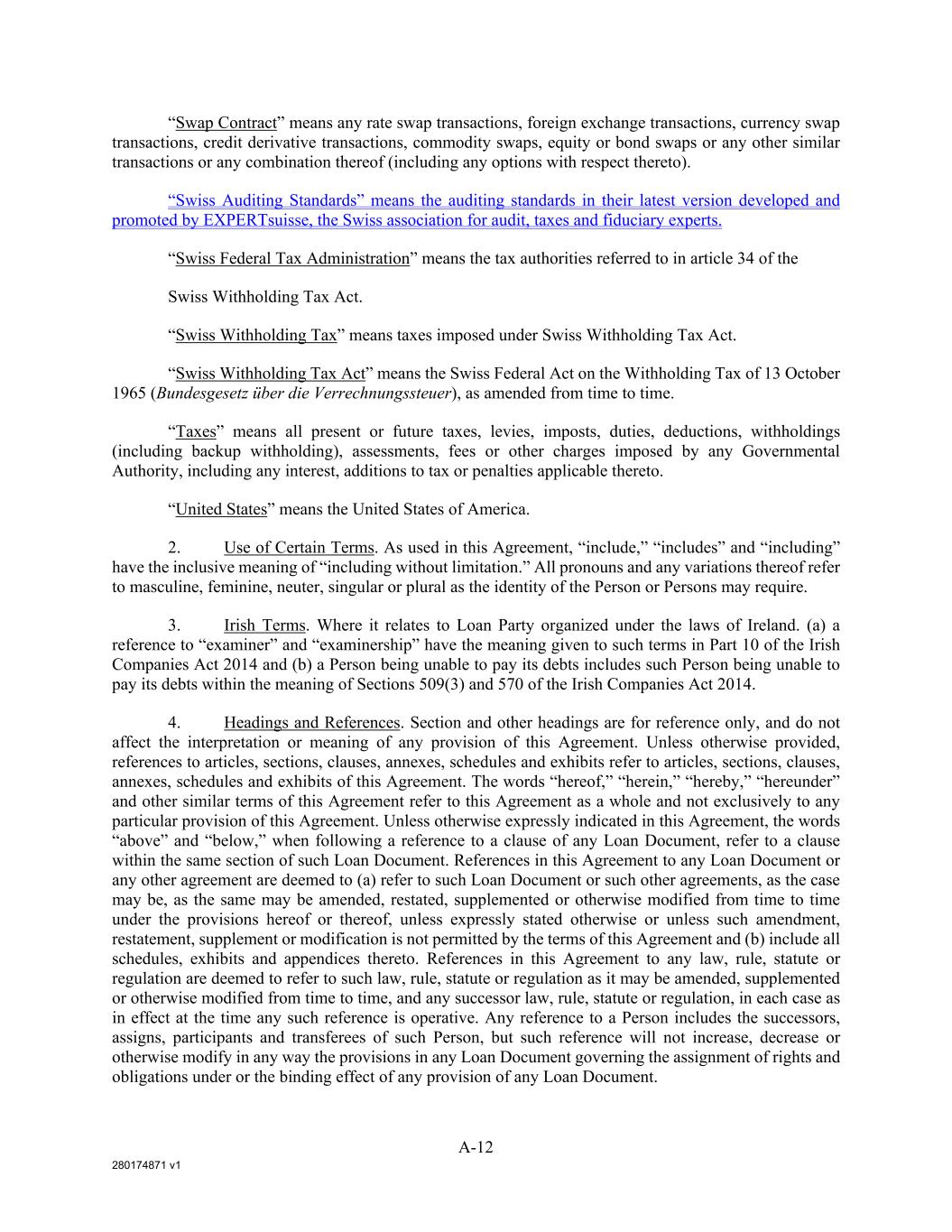 280174871 v1 A-12 “Swap Contract” means any rate swap transactions, foreign exchange transactions, currency swap transactions, credit derivative transactions, commodity swaps, equity or bond swaps or any other similar transactions or any combination thereof (including any options with respect thereto). “Swiss Auditing Standards” means the auditing standards in their latest version developed and promoted by EXPERTsuisse, the Swiss association for audit, taxes and fiduciary experts. “Swiss Federal Tax Administration” means the tax authorities referred to in article 34 of the Swiss Withholding Tax Act. “Swiss Withholding Tax” means taxes imposed under Swiss Withholding Tax Act. “Swiss Withholding Tax Act” means the Swiss Federal Act on the Withholding Tax of 13 October 1965 (Bundesgesetz über die Verrechnungssteuer), as amended from time to time. “Taxes” means all present or future taxes, levies, imposts, duties, deductions, withholdings (including backup withholding), assessments, fees or other charges imposed by any Governmental Authority, including any interest, additions to tax or penalties applicable thereto. “United States” means the United States of America. 2. Use of Certain Terms. As used in this Agreement, “include,” “includes” and “including” have the inclusive meaning of “including without limitation.” All pronouns and any variations thereof refer to masculine, feminine, neuter, singular or plural as the identity of the Person or Persons may require. 3. Irish Terms. Where it relates to Loan Party organized under the laws of Ireland. (a) a reference to “examiner” and “examinership” have the meaning given to such terms in Part 10 of the Irish Companies Act 2014 and (b) a Person being unable to pay its debts includes such Person being unable to pay its debts within the meaning of Sections 509(3) and 570 of the Irish Companies Act 2014. 4. Headings and References. Section and other headings are for reference only, and do not affect the interpretation or meaning of any provision of this Agreement. Unless otherwise provided, references to articles, sections, clauses, annexes, schedules and exhibits refer to articles, sections, clauses, annexes, schedules and exhibits of this Agreement. The words “hereof,” “herein,” “hereby,” “hereunder” and other similar terms of this Agreement refer to this Agreement as a whole and not exclusively to any particular provision of this Agreement. Unless otherwise expressly indicated in this Agreement, the words “above” and “below,” when following a reference to a clause of any Loan Document, refer to a clause within the same section of such Loan Document. References in this Agreement to any Loan Document or any other agreement are deemed to (a) refer to such Loan Document or such other agreements, as the case may be, as the same may be amended, restated, supplemented or otherwise modified from time to time under the provisions hereof or thereof, unless expressly stated otherwise or unless such amendment, restatement, supplement or modification is not permitted by the terms of this Agreement and (b) include all schedules, exhibits and appendices thereto. References in this Agreement to any law, rule, statute or regulation are deemed to refer to such law, rule, statute or regulation as it may be amended, supplemented or otherwise modified from time to time, and any successor law, rule, statute or regulation, in each case as in effect at the time any such reference is operative. Any reference to a Person includes the successors, assigns, participants and transferees of such Person, but such reference will not increase, decrease or otherwise modify in any way the provisions in any Loan Document governing the assignment of rights and obligations under or the binding effect of any provision of any Loan Document.