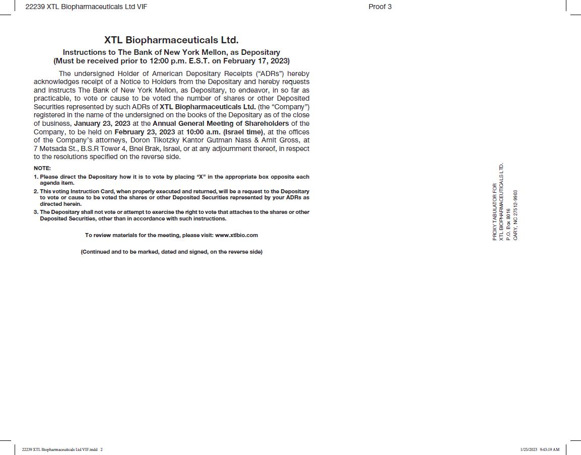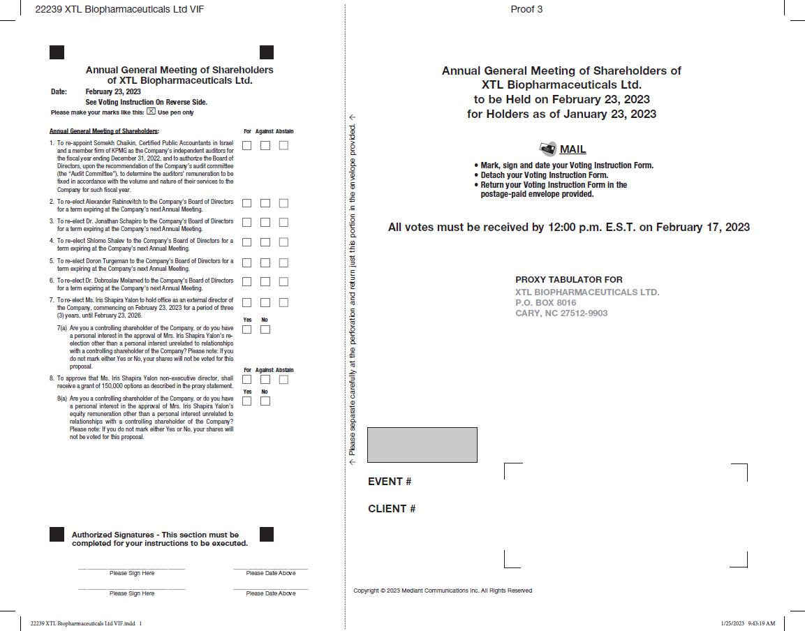XTL Biopharmaceuticals Ltd. (the “Company”) is filing this Amendment No. 1 to amend and restate its Report on Form 6-K and all exhibits furnished with the U.S. Securities and Exchange Commission on January 20, 2023 (the “Original Report”). This Amendment No. 1 is being filed solely for the purpose of amending the meeting time from 3:00 PM (Israel Time), on February 23, 2023 to 10:00 AM (Israel Time), on February 23, 2023.