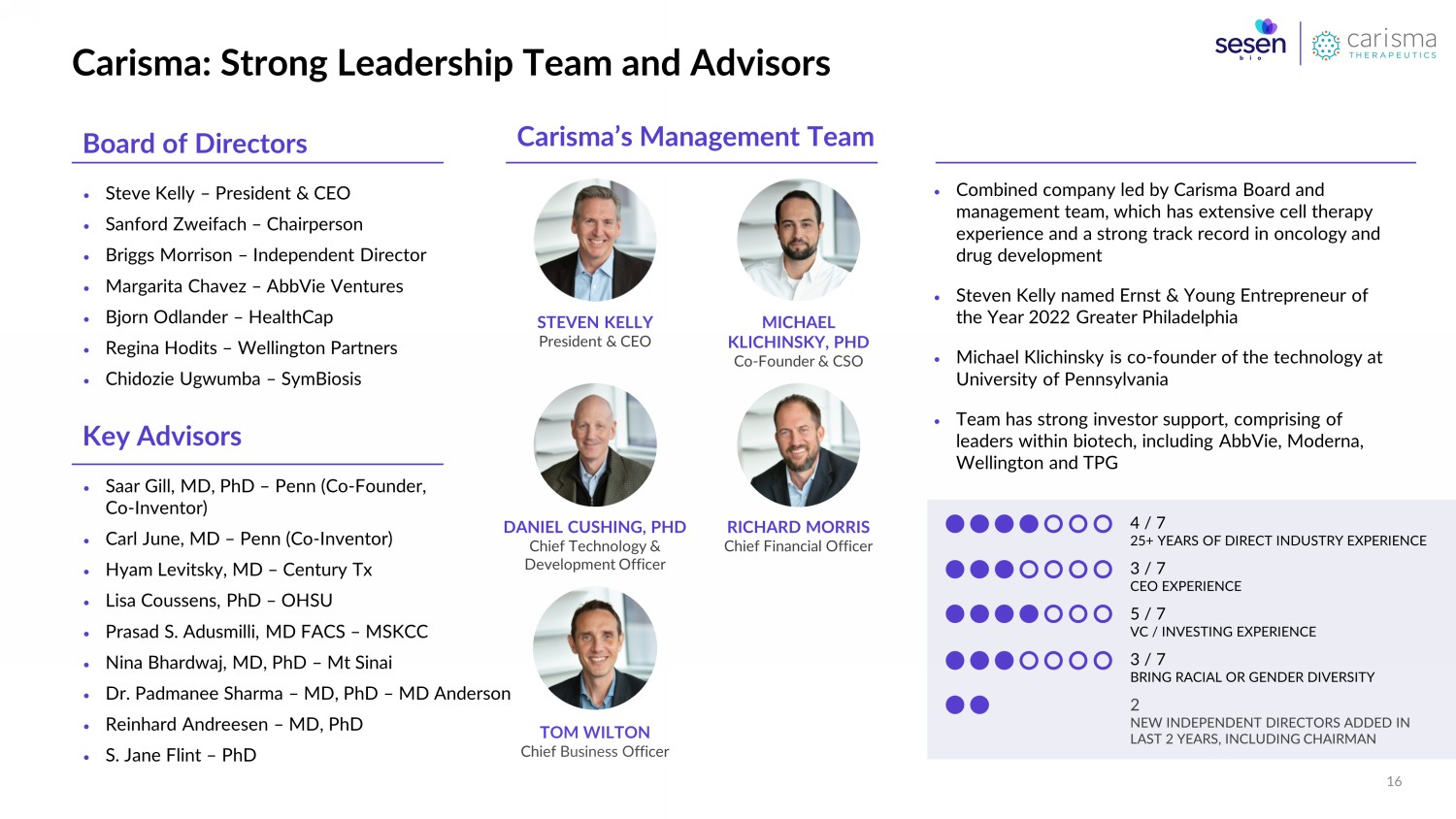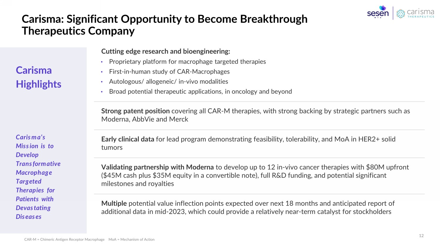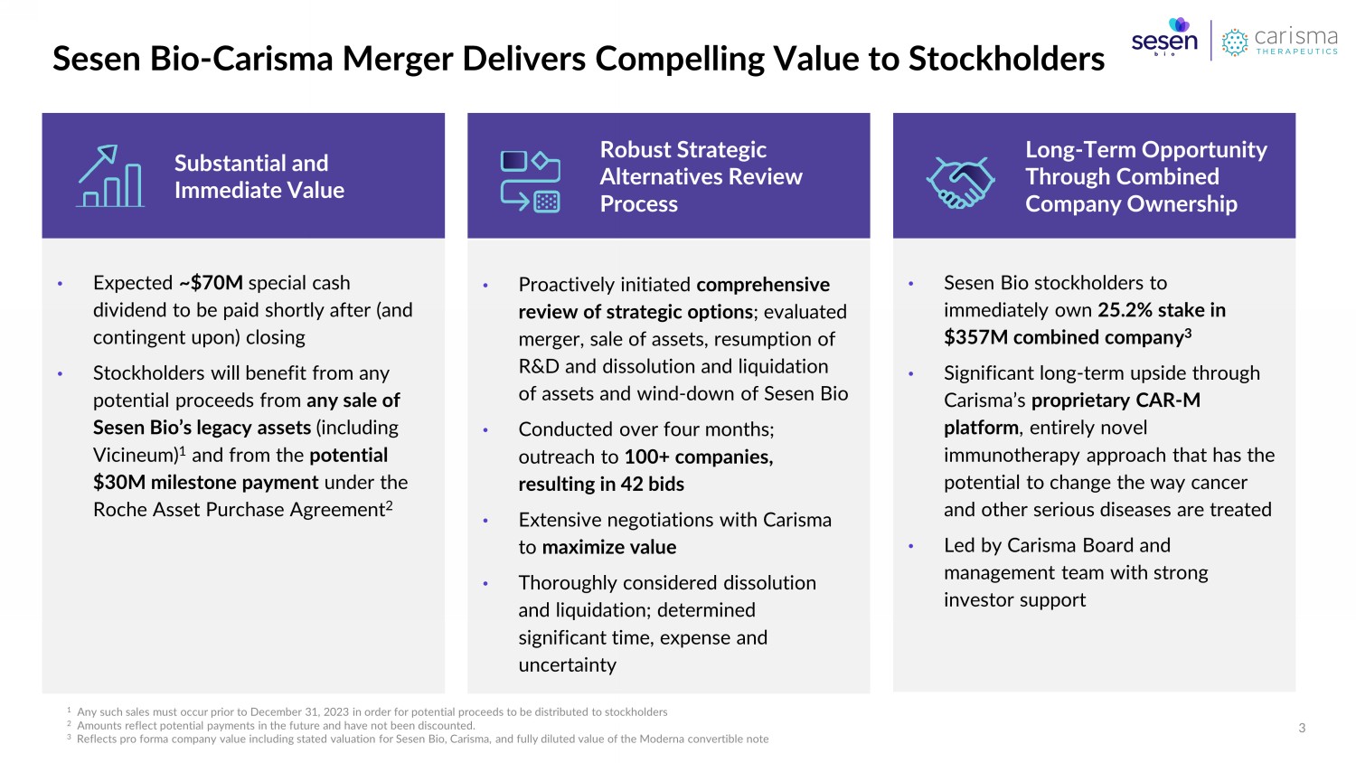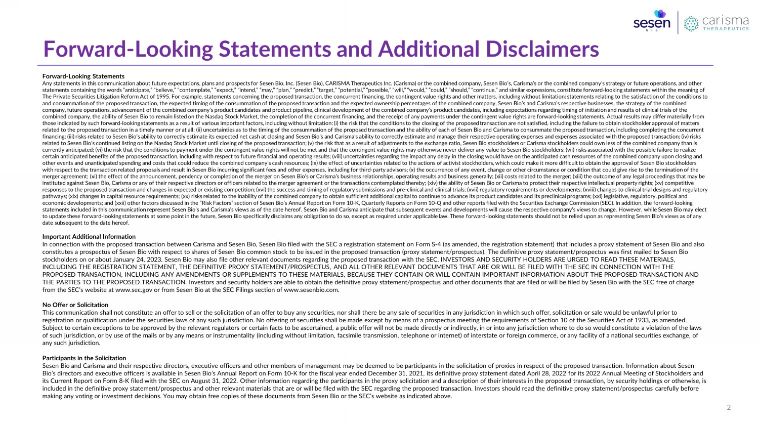 Forward - Looking Statements and Additional Disclaimers Forward - Looking Statements Any statements in this communication about future expectations, plans and prospects for Sesen Bio, Inc. ( Sesen Bio), CARISMA Therapeutics Inc. ( Carisma ) or the combined company, Sesen Bio’s, Carisma’s or the combined company’s strategy or future operations, and other statements containing the words “anticipate,” “believe,” “contemplate,” “expect,” “intend,” “may,” “plan,” “predict,” “target ,” “potential,” “possible,” “will,” “would,” “could,” “should,” “continue,” and similar expressions, constitute forward - looking sta tements within the meaning of The Private Securities Litigation Reform Act of 1995. For example, statements concerning the proposed transaction, the concur ren t financing, the contingent value rights and other matters, including without limitation: statements relating to the satisfac tio n of the conditions to and consummation of the proposed transaction, the expected timing of the consummation of the proposed transaction and the exp ect ed ownership percentages of the combined company, Sesen Bio’s and Carisma’s respective businesses, the strategy of the combined company, future operations, advancement of the combined company’s product candidates and product pipeline, clinical developme nt of the combined company’s product candidates, including expectations regarding timing of initiation and results of clinical t ria ls of the combined company, the ability of Sesen Bio to remain listed on the Nasdaq Stock Market, the completion of the concurrent financing, and the receipt of any payments un der the contingent value rights are forward - looking statements. Actual results may differ materially from those indicated by such forward - looking statements as a result of various important factors, including without limitation: ( i ) the risk that the conditions to the closing of the proposed transaction are not satisfied, including the failure to obtain sto ckholder approval of matters related to the proposed transaction in a timely manner or at all; (ii) uncertainties as to the timing of the consummation of the proposed transaction and the ability of each of Sesen Bio and Carisma to consummate the proposed transaction, including completing the concurrent financing; (iii) risks related to Sesen Bio’s ability to correctly estimate its expected net cash at closing and Sesen Bio’s and Carisma’s ability to correctly estimate and manage their respective operating expenses and expenses associated with the proposed transa ct ion; (iv) risks related to Sesen Bio’s continued listing on the Nasdaq Stock Market until closing of the proposed transaction; (v) the risk that as a result o f adjustments to the exchange ratio, Sesen Bio stockholders or Carisma stockholders could own less of the combined company than is currently anticipated; (vi) the risk that the conditions to payment under the contingent value rights will not be met and tha t t he contingent value rights may otherwise never deliver any value to Sesen Bio stockholders; (vii) risks associated with the possible failure to realize certain anticipated benefits of the proposed transaction, including with respect to future financial and operating results; ( vii i) uncertainties regarding the impact any delay in the closing would have on the anticipated cash resources of the combined c omp any upon closing and other events and unanticipated spending and costs that could reduce the combined company’s cash resources; (ix) the effect of un certainties related to the actions of activist stockholders, which could make it more difficult to obtain the approval of Sesen Bio stockholders with respect to the transaction related proposals and result in Sesen Bio incurring significant fees and other expenses, including for third - party advisors; (x) the occurrence of any event, change or other circumstance or condition that could give rise to the termination of the merger agreement; (xi) the effect of the announcement, pendency or completion of the merger on Sesen Bio’s or Carisma’s business relationships, operating results and business generally; (xii) costs related to the merger; (xiii) the outcome of an y legal proceedings that may be instituted against Sesen Bio, Carisma or any of their respective directors or officers related to the merger agreement or the transactions contemplated thereby; (x iv ) the ability of Sesen Bio or Carisma to protect their respective intellectual property rights; (xv) competitive responses to the proposed transaction and changes in expected or existing competition; (xvi) the success and timing of regula tor y submissions and pre - clinical and clinical trials; (xvii) regulatory requirements or developments; (xviii) changes to clinical trial designs and regulatory pathways; (xix) changes in capital resource requirements; (xx) risks related to the inability of the combined company to obta in sufficient additional capital to continue to advance its product candidates and its preclinical programs; (xxi) legislative, reg ulatory, political and economic developments; and (xxii) other factors discussed in the “Risk Factors” section of Sesen Bio’s Annual Report on Form 10 - K, Quarterly Reports on Form 10 - Q and other reports filed with the Securities Exchange Commissio n (SEC). In addition, the forward - looking statements included in this communication represent Sesen Bio’s and Carisma’s views as of the date hereof. Sesen Bio and Carisma anticipate that subsequent events and developments will cause the respective company’s views to change. However, while Sesen Bio may elect to update these forward - looking statements at some point in the future, Sesen Bio specifically disclaims any obligation to do so, except as required under applicable law. These forward - looking statements s hould not be relied upon as representing Sesen B
