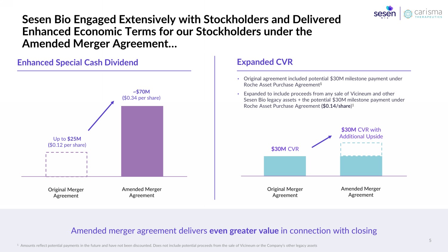 • Sesen Bio stockholders to immediately own 25.2% stake in $357M combined company 3 • Significant long - term upside through Carisma’s proprietary CAR - M platform , entirely novel immunotherapy approach that has the potential to change the way cancer and other serious diseases are treated • Led by Carisma Board and management team with strong investor support • Proactively initiated comprehensive review of strategic options ; evaluated merger, sale of assets, resumption of R&D and dissolution and liquidation of assets and wind - down of Sesen Bio • Conducted over four months; outreach to 100+ companies, resulting in 42 bids • Extensive negotiations with Carisma to maximize value • Thoroughly considered dissolution and liquidation; determined significant time, expense and uncertainty • Expected ~$70M special cash dividend to be paid shortly after (and contingent upon) closing • Stockholders will benefit from any potential proceeds from any sale of Sesen Bio’s legacy assets (including Vicineum ) 1 and from the potential $30M milestone payment under the Roche Asset Purchase Agreement 2 Substantial and Immediate V alue Sesen Bio - Carisma Merger Delivers Compelling Value to Stockholders 3 Robust Strategic A lternatives Review P rocess Long - Term O pportunity T hrough Combined Company Ownership 1 Any such sales must occur prior to December 31, 2023 in order for potential proceeds to be distributed to stockholders 2 Amounts reflect potential payments in the future and have not been discounted. 3 Reflects pro forma company value including stated valuation for Sesen Bio, Carisma , and fully diluted value of the Moderna convertible note