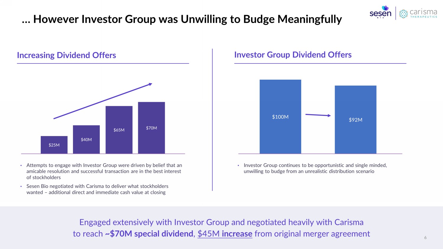 1 Reflects pro forma company value including stated valuation for Sesen Bio, Carisma , and fully diluted value of the Moderna convertible note 2 Amounts reflect potential payments in the future and have not been discounted. Does not include potential proceeds from Vicineum or the Company’s other legacy assets 3 Based on precedent liquidation processes and Company projections of potential liabilities and operating expenses 4 Assumes stockholder approval of dissolution in 2Q 2023 and a cash balance of approximately $140 million $0.14 Per Share $0.40 Per Share $0.34 Per Share Special Cash Dividend Pro Forma Company CVR Total ~$70M Special Cash Dividend 25.2% Stake in $357M 1 Combined Company $30M CVR 2 with Additional Upside Implied Total Value 2 $0.88 Per Share Dissolution and Liquidation Additional Expense and Claims Management • Only ~60 – 90% 3 of cash balance estimated to be available for initial distribution to stockholders, ~$0.40 – $0.60 4 per share • Remaining amount would fund wind - down of operations and reserves for current, potential future and unknown liabilities Long Delay • Up to six months or more after an additional stockholder vote to approve dissolution and liquidation • Up to three years to fully settle after wind down Significant Uncertainty • Near - term special cash dividend without a concurrent transaction extremely unlikely outside the statutory dissolution process • Amount and timing of an initial distribution in a dissolution and liquidation process is uncertain Carisma Merger $0.40 – $0.60 Per Share Transaction Delivers Near - Term Value and Long - Term Upside, Meaningfully Better Than the Alternative 4