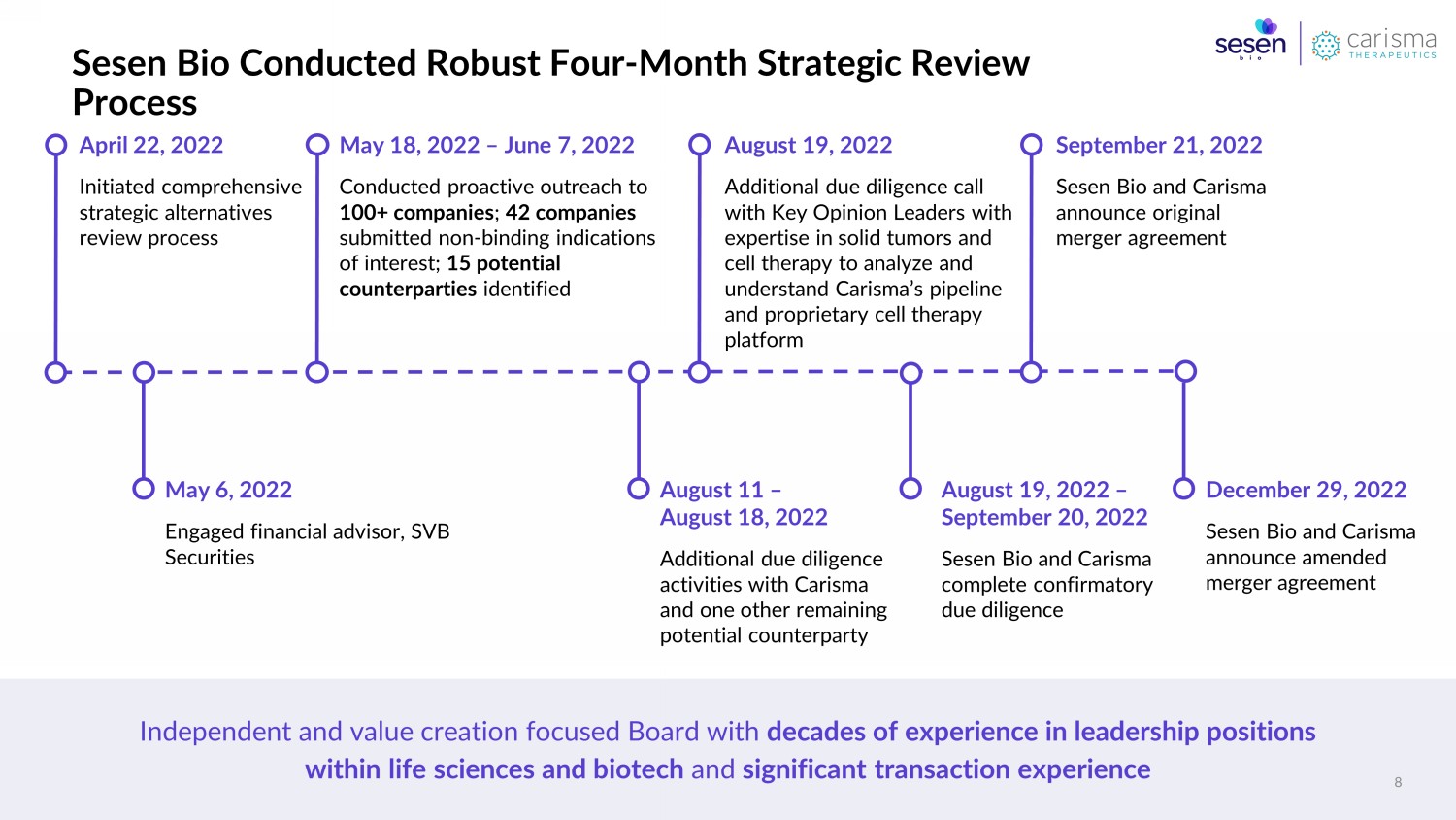Four - month strategic review process spanned 12 Board meetings *Source: SEC filings of reverse merger transactions 2020 - 2022 1 Average is of the 42 bids received 25.2% Ownership percentage of reverse merger company 30% $15M Reverse merger company value $13.3M 1 50% Cash contribution from reverse merger company to pro forma company 52% Sesen Bio - Carisma Average* ~$70M Expected cash dividend issued in connection with transaction $0 Transaction Compares Favorably to Precedent Reverse Merger Transactions 7 42 Number of bidders 12