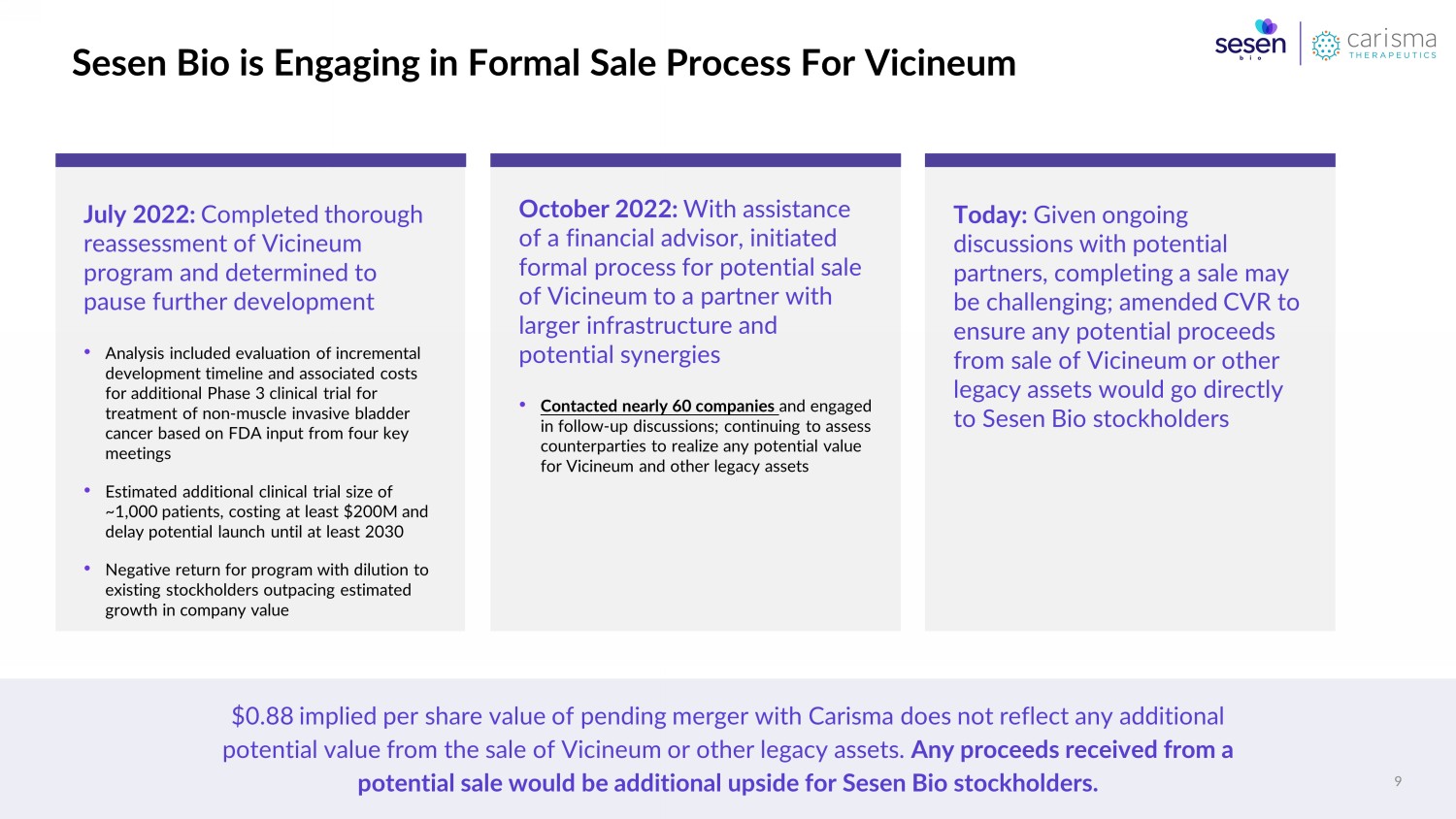 Independent and value creation focused Board with decades of experience in leadership positions within life sciences and biotech and significant transaction experience April 22, 2022 Initiated comprehensive strategic alternatives review process May 18, 2022 – June 7, 2022 Conducted proactive outreach to 100+ companies ; 42 companies submitted non - binding indications of interest; 15 potential counterparties identified August 11 – August 18, 2022 Additional due diligence activities with Carisma and one other remaining potential counterparty August 19, 2022 Additional due diligence call with Key Opinion Leaders with expertise in solid tumors and cell therapy to analyze and understand Carisma’s pipeline and proprietary cell therapy platform August 19, 2022 – September 20, 2022 Sesen Bio and Carisma complete confirmatory due diligence September 21, 2022 Sesen Bio and Carisma announce original merger agreement December 29, 2022 Sesen Bio and Carisma announce amended merger agreement May 6, 2022 Engaged financial advisor, SVB Securities Sesen Bio Conducted Robust Four - Month Strategic Review Process 8